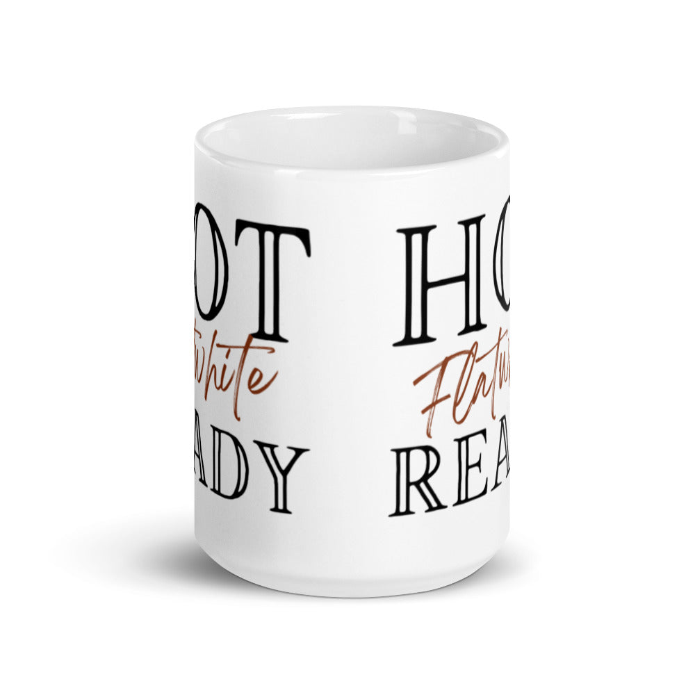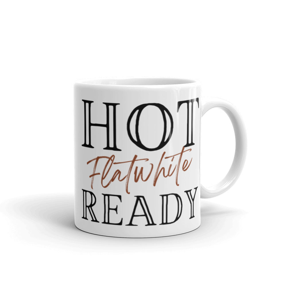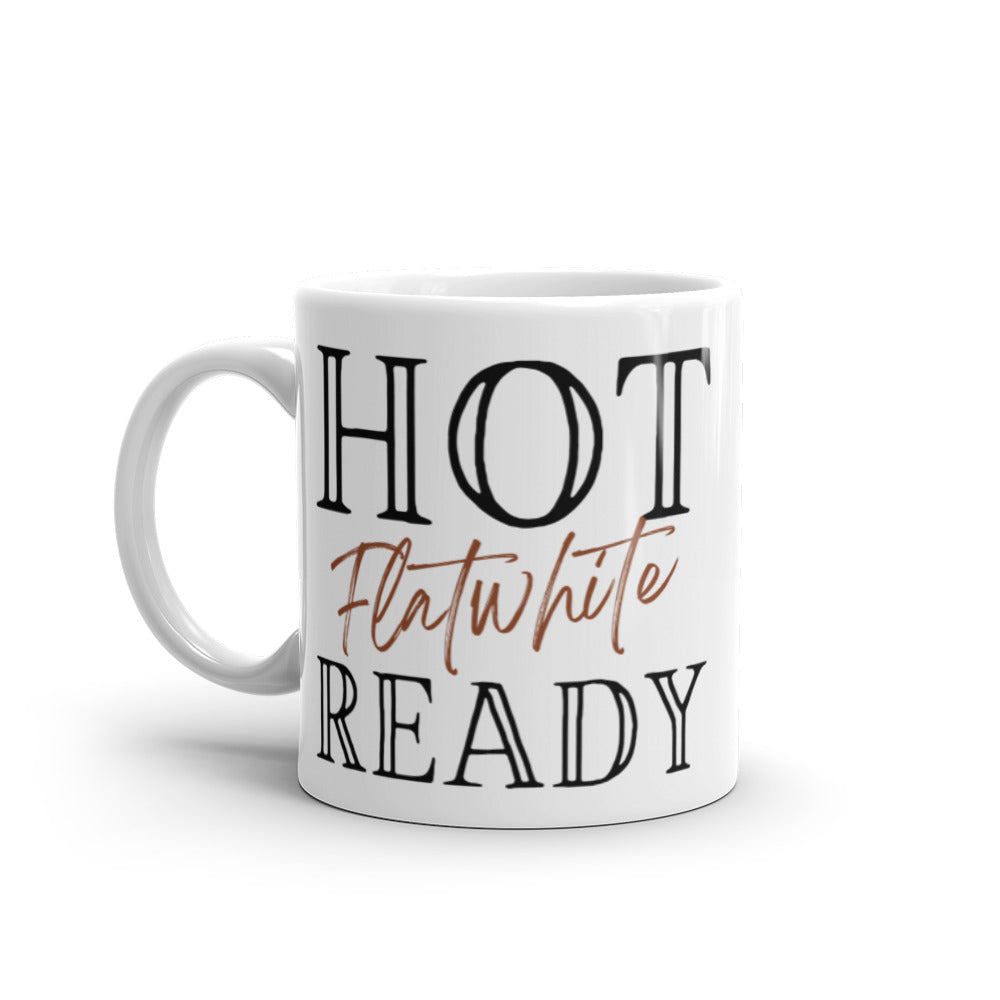 - Design Style: Bold black typography for “HOT” and “READY”, paired with a copper cursive “Flatwhite” in a full – wrap design