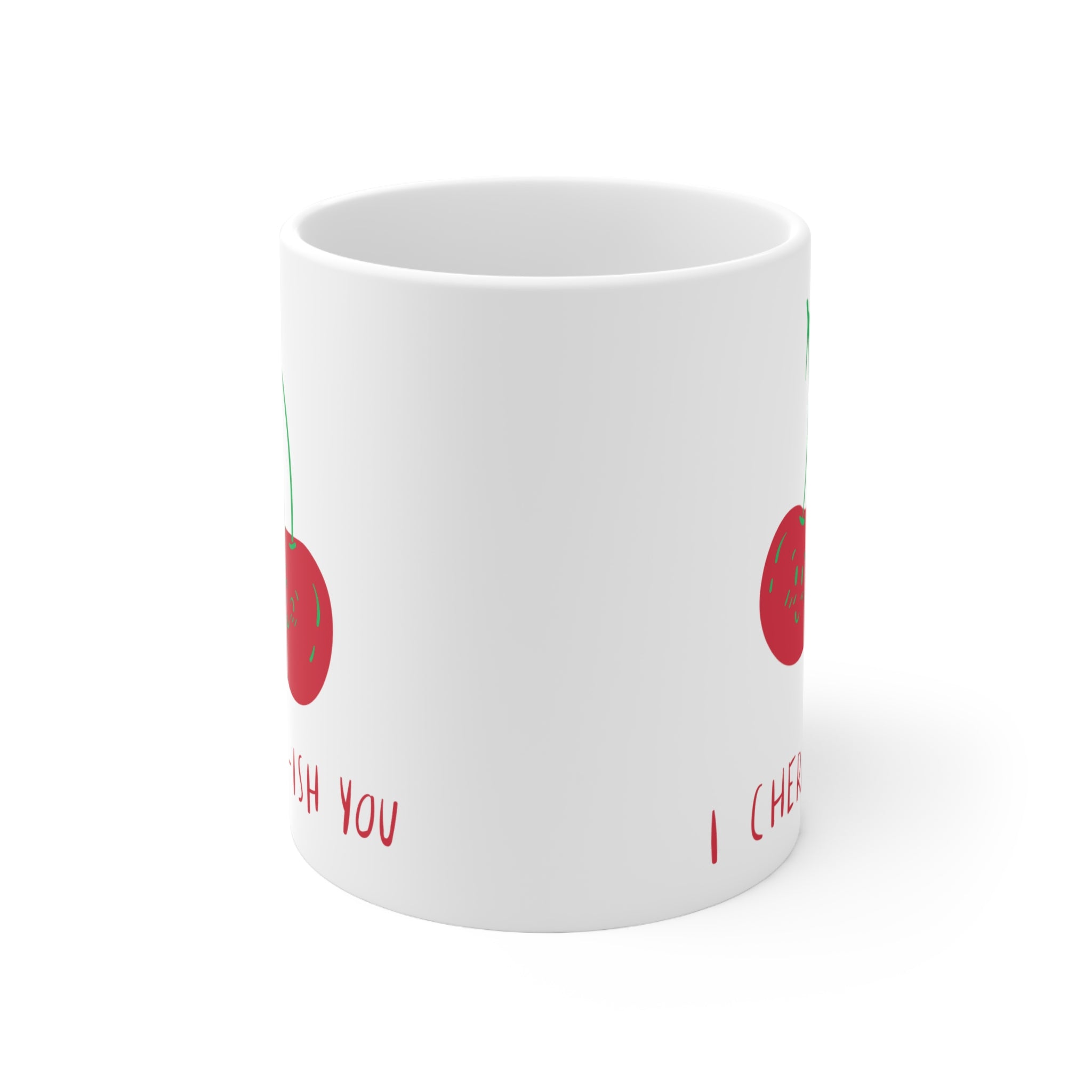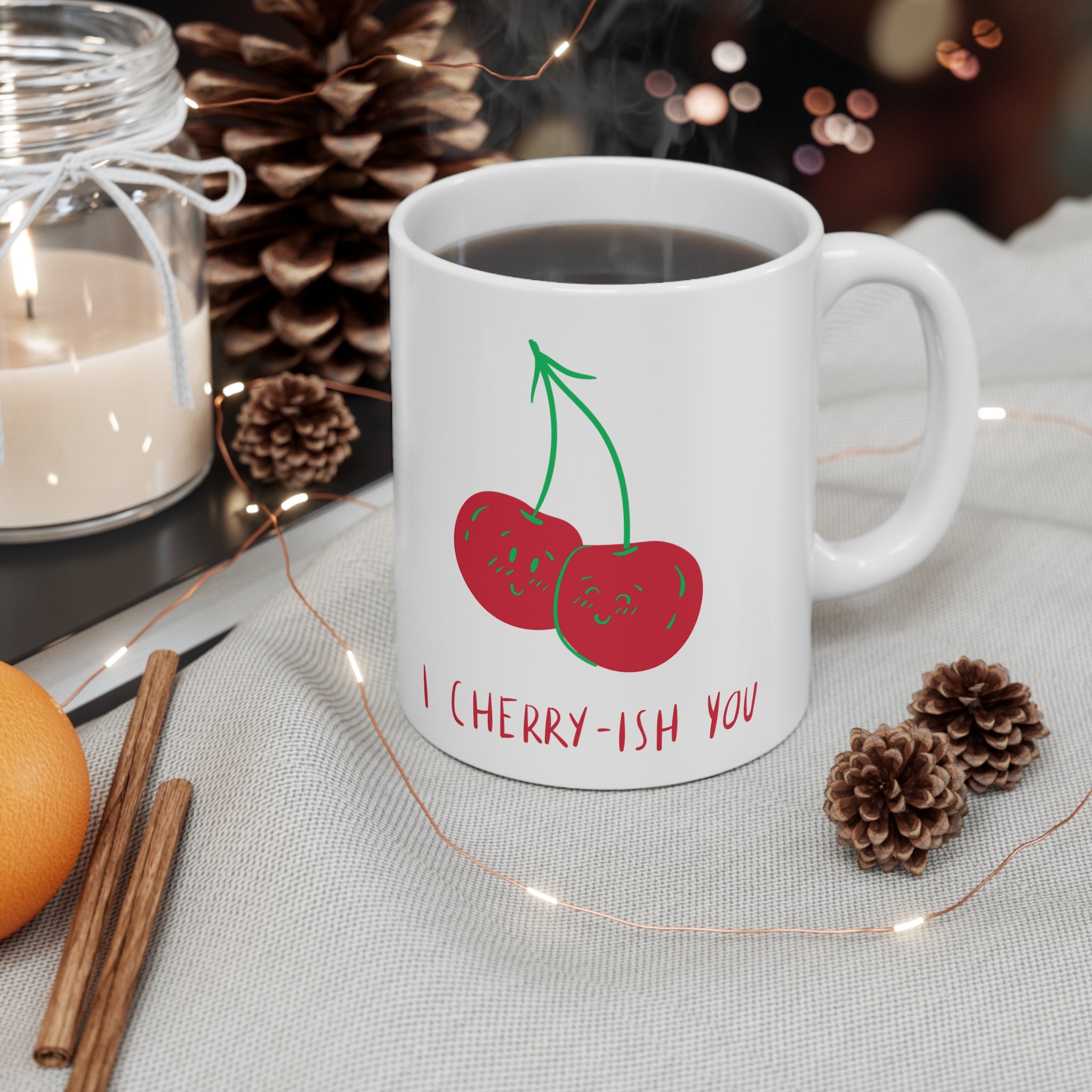 The mug features a whimsical design with two cartoon – style cherries sporting smiling faces, complete with green accents for eyes and mouths, and adorable red cheeks. Their green stems and leaves, in a simple hand – drawn style, add a touch of nature’s beauty. The punny text ‘I CHERRY – ISH YOU’, printed in a playful, handwritten red font just below the cherries, not only brings a smile to your face but also makes it a great gift for expressing affection.
