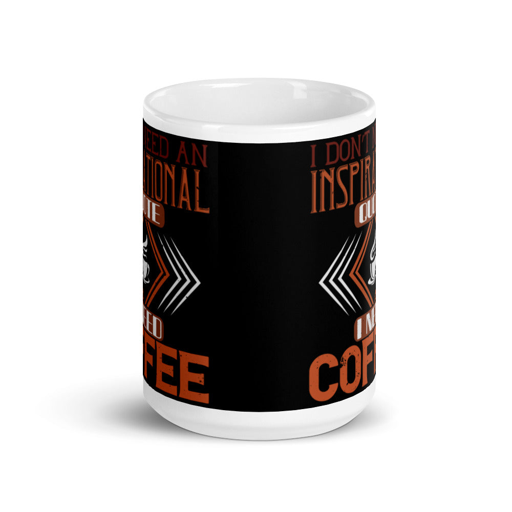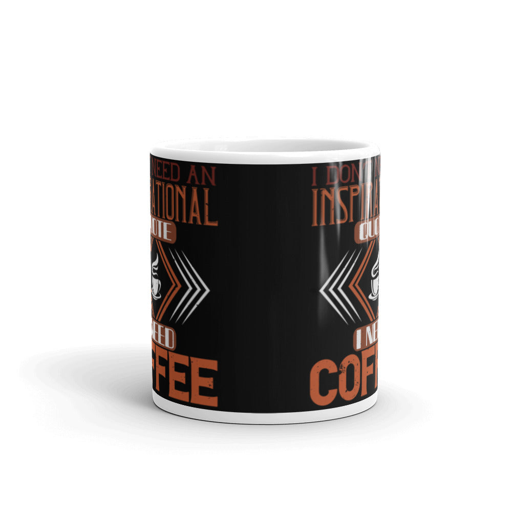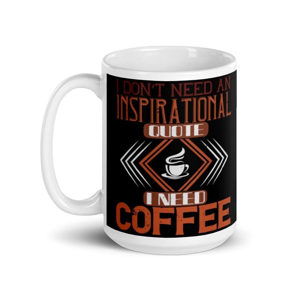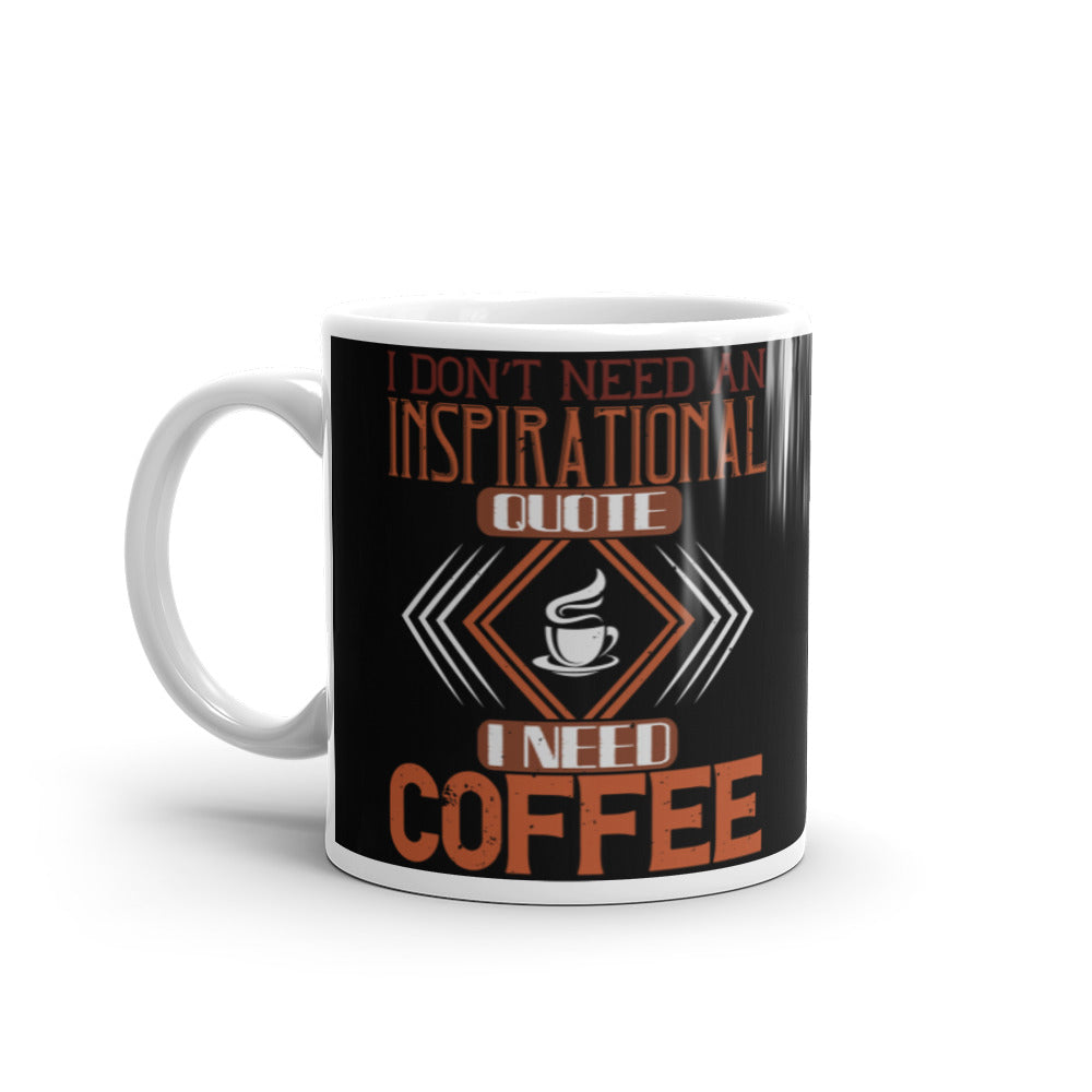 - Color Scheme: Black body with white (handle, interior, coffee cup graphic), orange/red (text, diamond outline), and brownish – orange (rectangular backgrounds for “QUOTE” and “I NEED”)