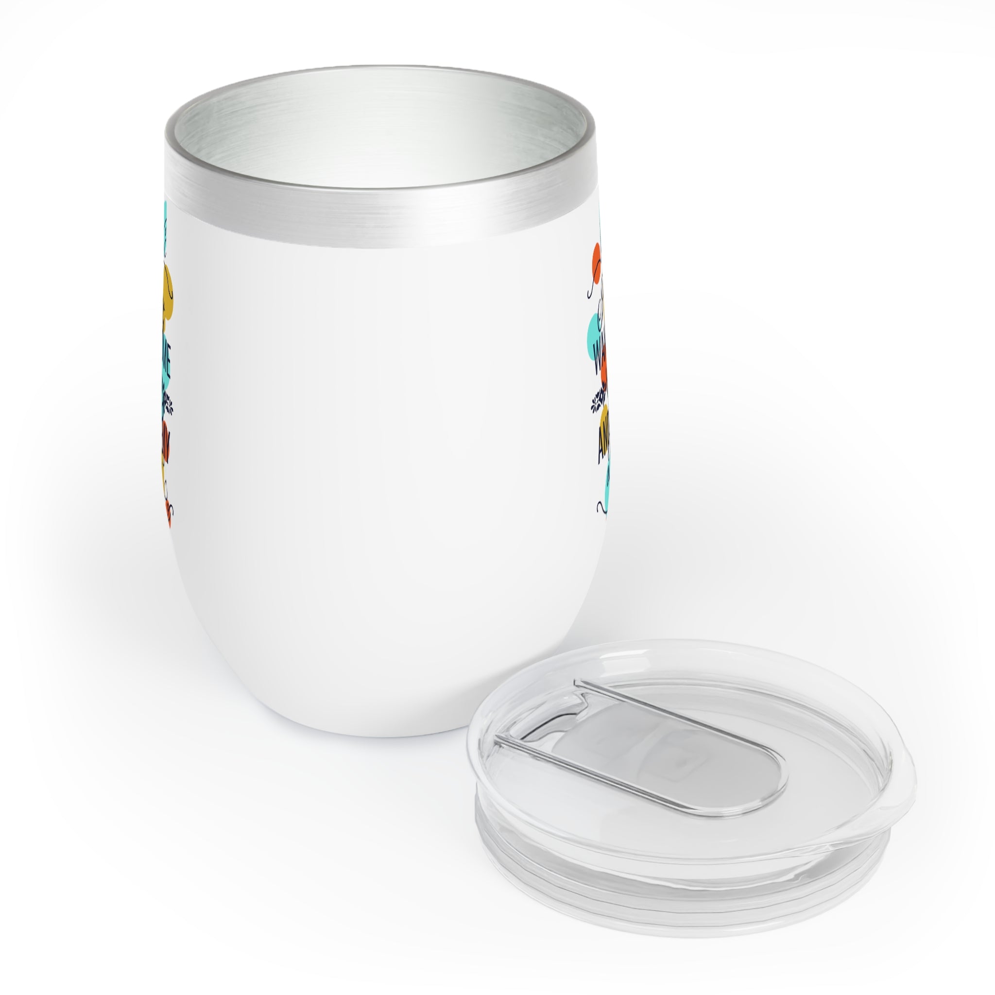 The tumbler features a charming white, matte – finish main body. The top band has a metallic silver accent, adding a touch of elegance. The design is truly eye – catching, with the text “I just want some wine and pet my dog” in a playful mix of cursive and bold sans – serif fonts. Surrounding the text are bright orange, yellow, and teal circular dots, creating a whimsical, pet – friendly vibe. The design is centered on the front and mirrored on the sides, ensuring visibility from multiple angles.