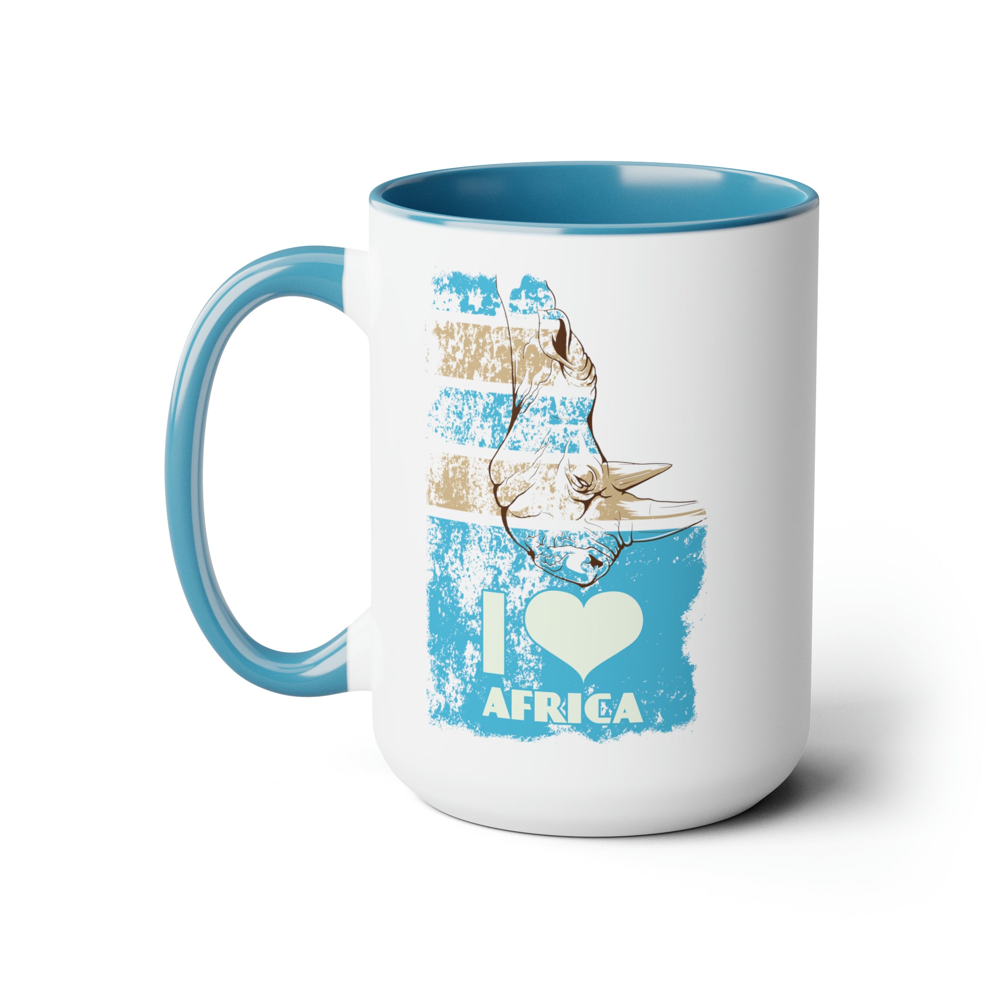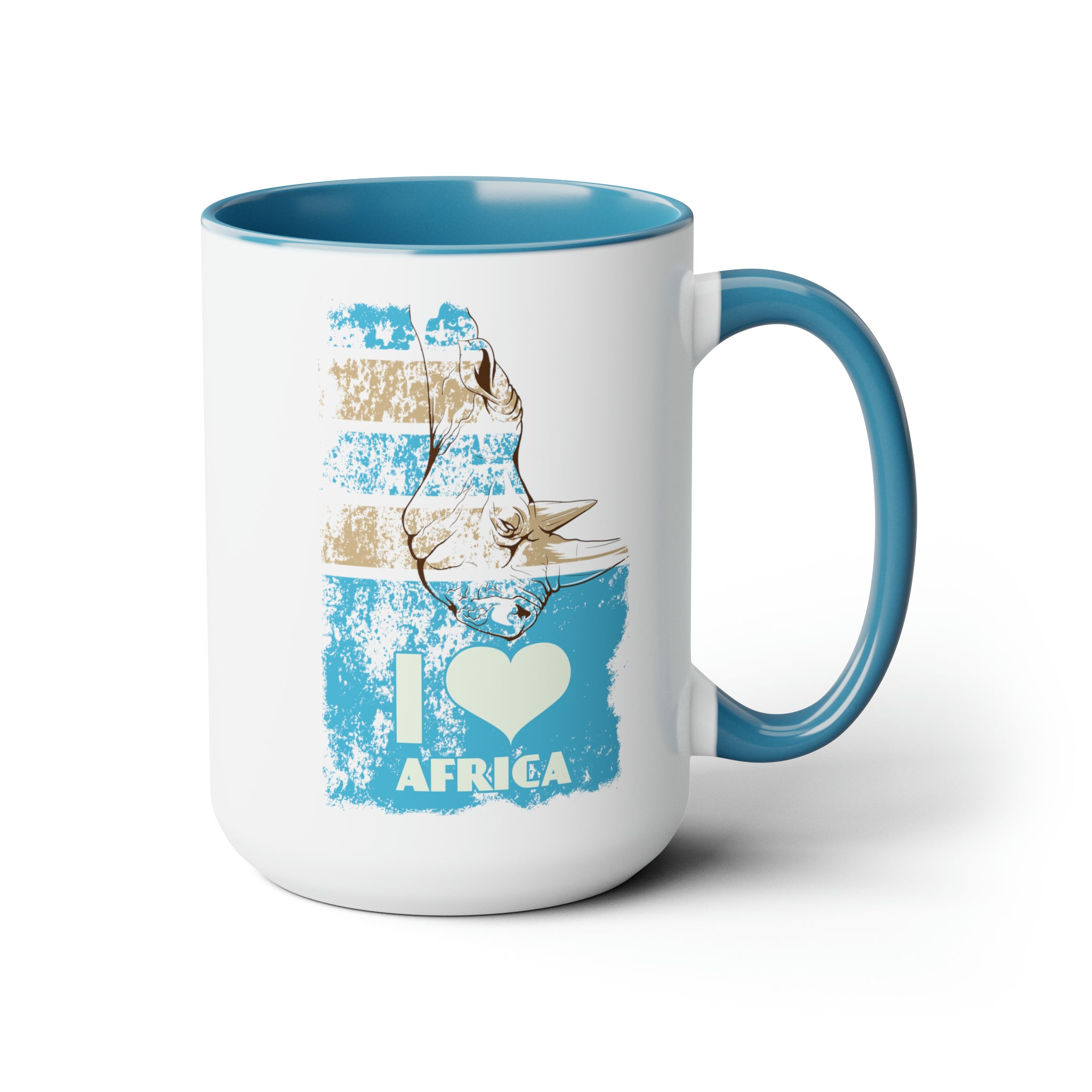 The exterior of the mug is a pristine white, while the interior and handle are adorned in light blue, creating a striking two – tone contrast. The design features a stylized illustration of an African rhinoceros in brown and white, with a distressed, vintage texture that gives it an artistic and retro look. The background is decorated with blue and beige (tan) distressed rectangles, adding to the overall vintage aesthetic. The bold text “I ❤️ AFRICA” with a heart symbol in light cream/white, a vertical “I,” and a prominent “AFRICA” below the heart, makes it a perfect choice for African wildlife enthusiasts and travelers.