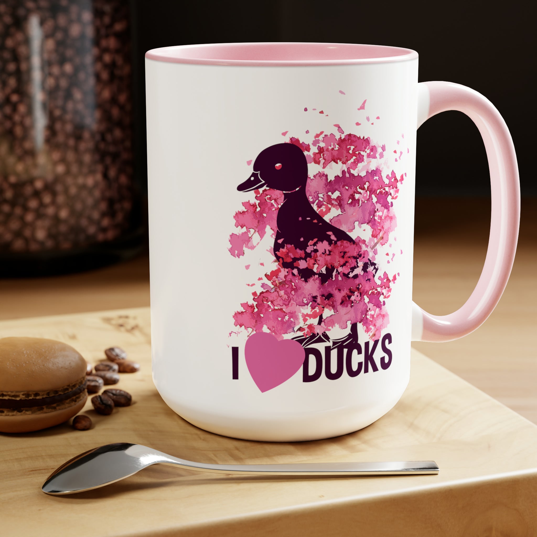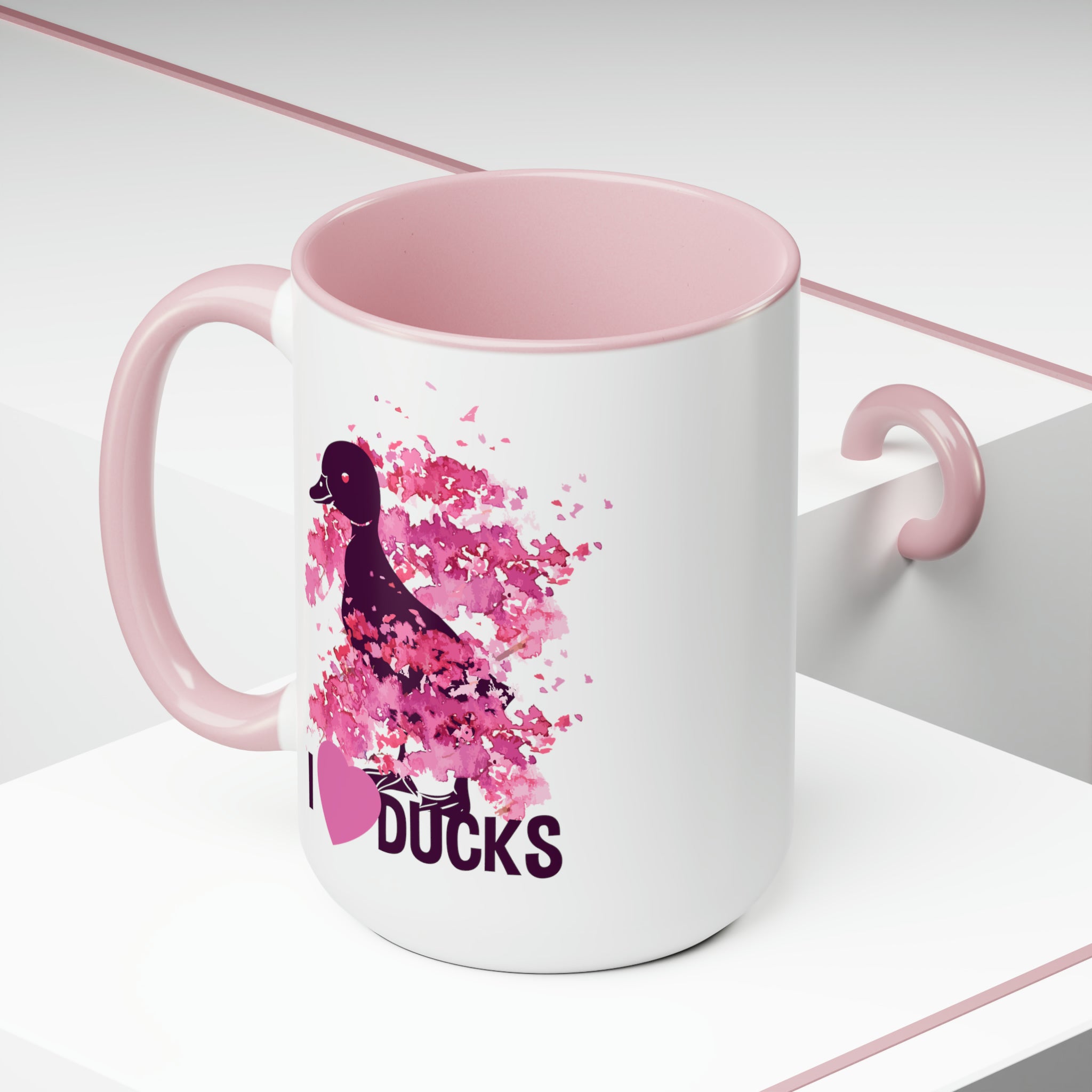 The visual elements on this mug are truly eye – catching. A dark (black/purple) silhouette of a duck with a red eye partially overlaps a pink watercolor “flower” or “petal” pattern, creating a double – exposure effect. The text “I ❤️ DUCKS” is printed in high – quality, crisp letters, where “I” and “DUCKS” are dark purple/black, and the heart is a solid pink that matches the watercolor. Subtle pink splatters around the duck add to the artistic and playful feel.