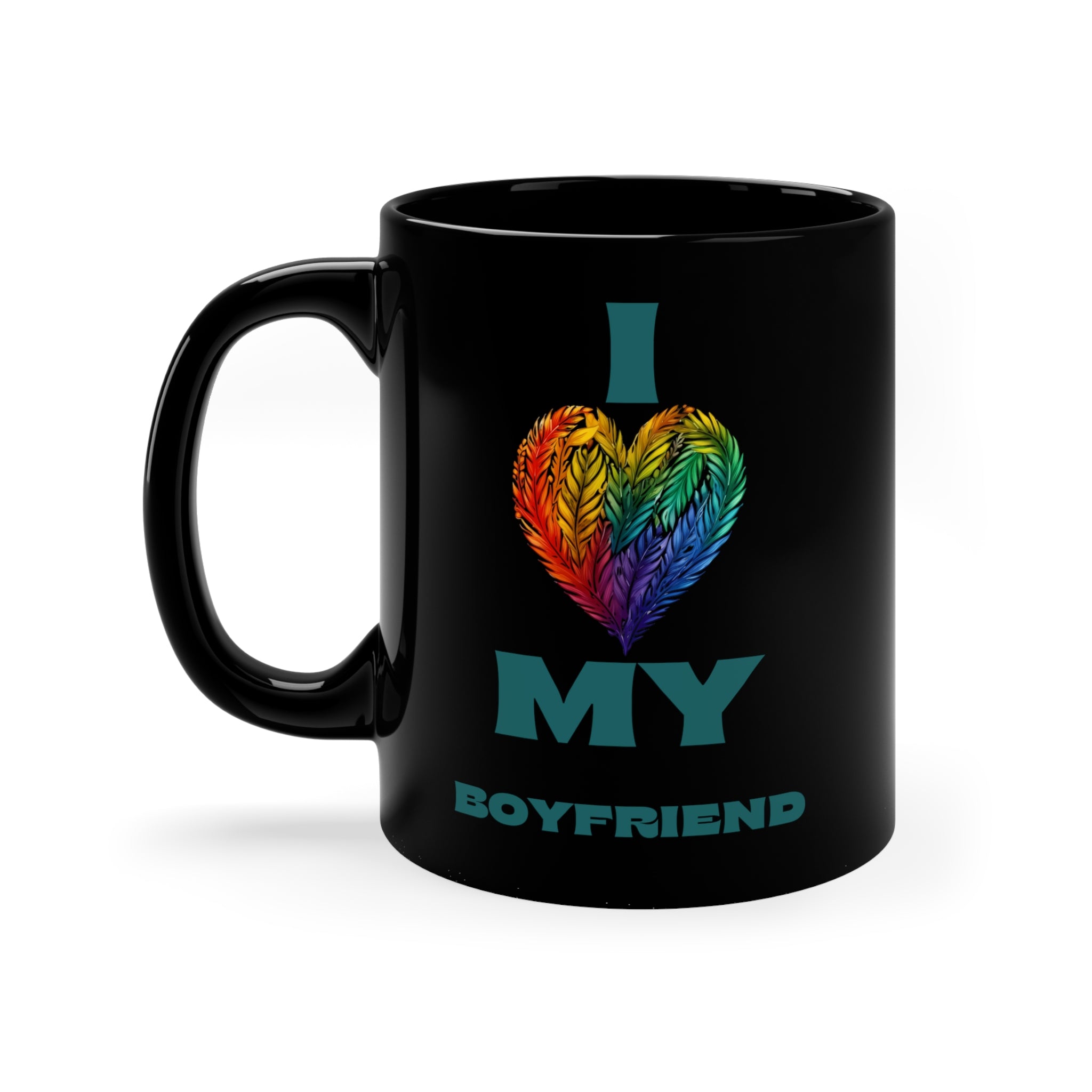 The base color of the mug is a solid black with a glossy finish, creating a sleek and modern look. The graphic elements are truly eye – catching. In the center, there is a rainbow – hued heart composed of feather – like textures, using the full spectrum of rainbow colors (red, orange, yellow, green, blue, purple). This heart replaces the traditional “❤️” symbol, integrating the LGBTQ+ pride flag colors. The text on the mug is also carefully designed: “I” in a tall, bold sans – serif teal/turquoise font is positioned above the heart, “MY” in a large teal sans – serif font is below the heart, and “BOYFRIEND” in a smaller teal sans – serif font beneath “MY”, completing the phrase “I LOVE MY BOYFRIEND”. The teal text and rainbow heart create high visual contrast against the black background, ensuring legibility.