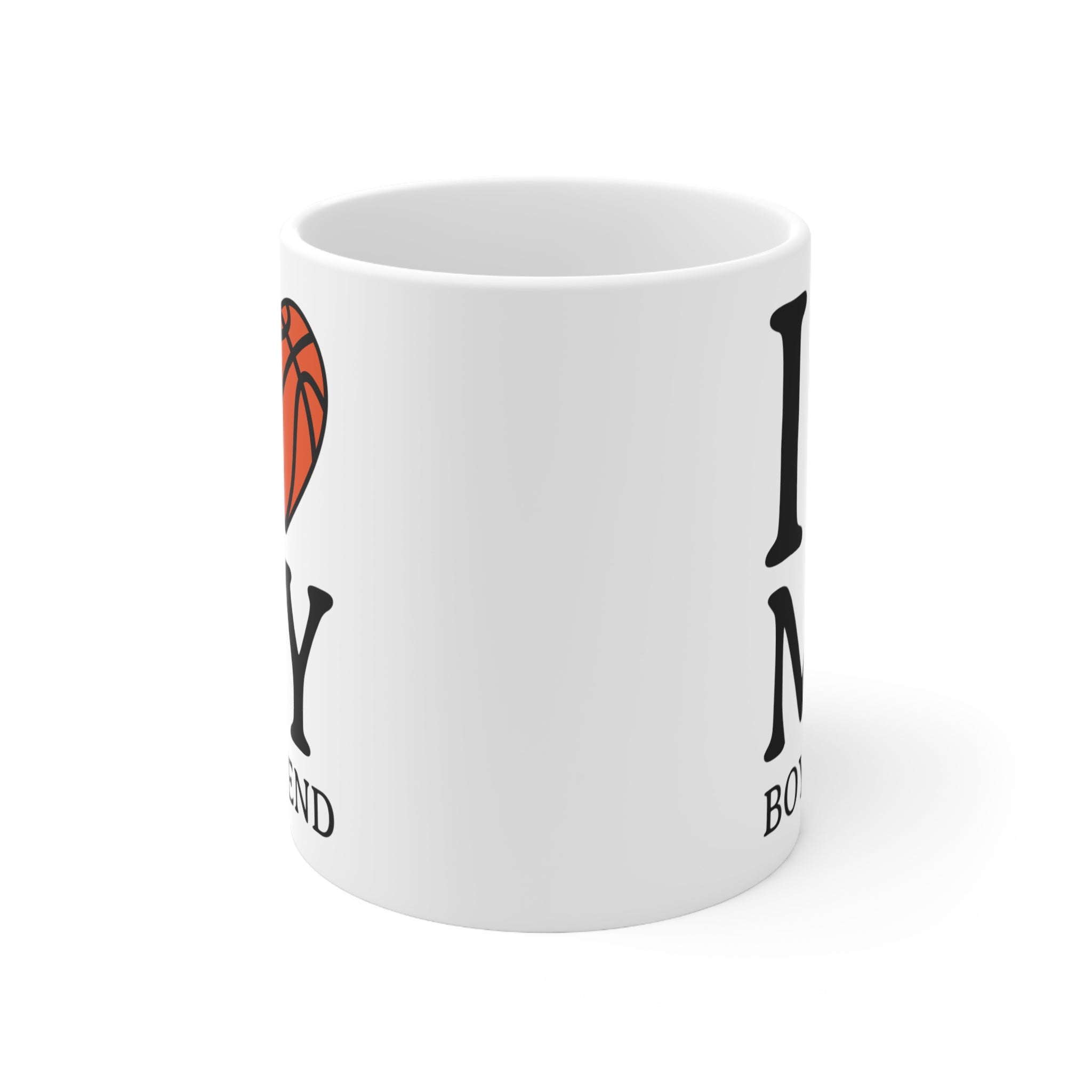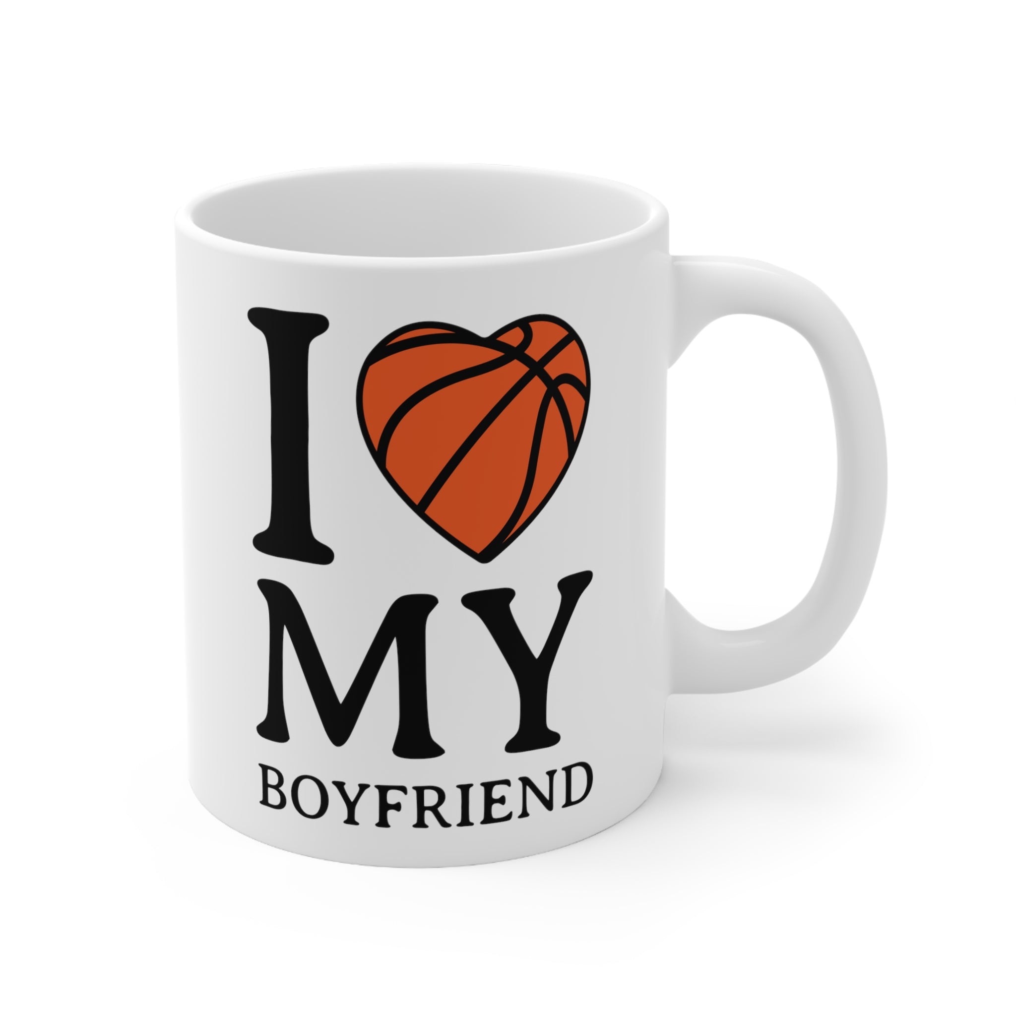The mug features a playful, sports – themed design that is sure to delight basketball enthusiasts and romantic partners alike. The base color of the mug body is a clean, white shade that serves as a perfect backdrop for the bold, decorative elements. The black, bold text “I”, “MY”, and “BOYFRIEND” stands out prominently, with “I” and “MY” in larger fonts. An orange basketball – shaped heart, complete with black lines mimicking a basketball’s texture, replaces the traditional “love” heart symbol.
