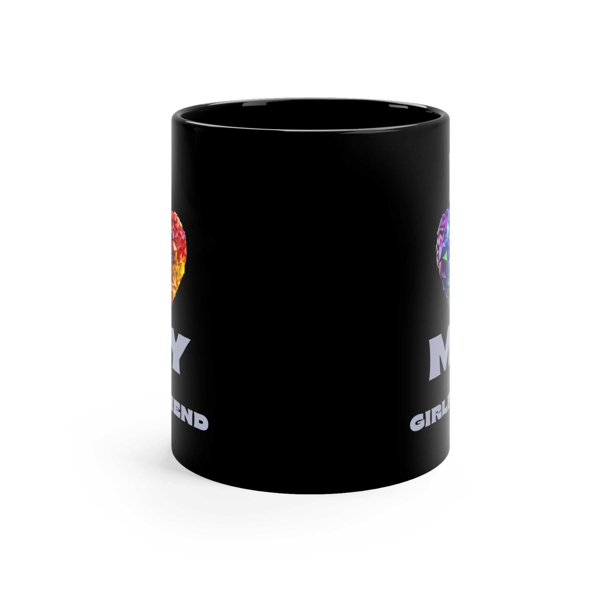 The mug is made of high – quality ceramic with a glossy, glazed finish. Its solid black exterior has a smooth, shiny surface, while the interior is also black, enhancing the visibility of the printed design. The design features a white “I” at the top, followed by a rainbow – hued, low – poly geometric heart with triangular facets in colors like purple, blue, green, yellow, and red. Below the heart, there are the words “MY” in large, bold, light gray/white uppercase letters and “GIRLFRIEND” in smaller, uppercase, light gray/white font. The design is centered on the front and mirrored on the back, providing a symmetrical and balanced look from different angles.