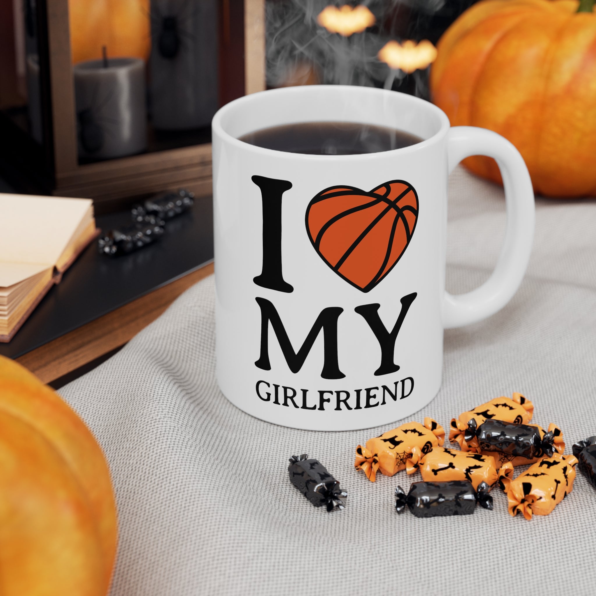 The mug features a high – contrast and playful design. The base color is a pristine white, which serves as a perfect backdrop for the printed elements. Bold black lettering spells out “I”, “MY”, and “GIRLFRIEND”, with the word “GIRLFRIEND” smaller and placed below “MY”. An orange basketball – shaped heart, complete with black lines mimicking a basketball’s texture, replaces the traditional heart in the “I love…” phrase. This unique design combines the worlds of sports and romance, creating a high – impact visual.