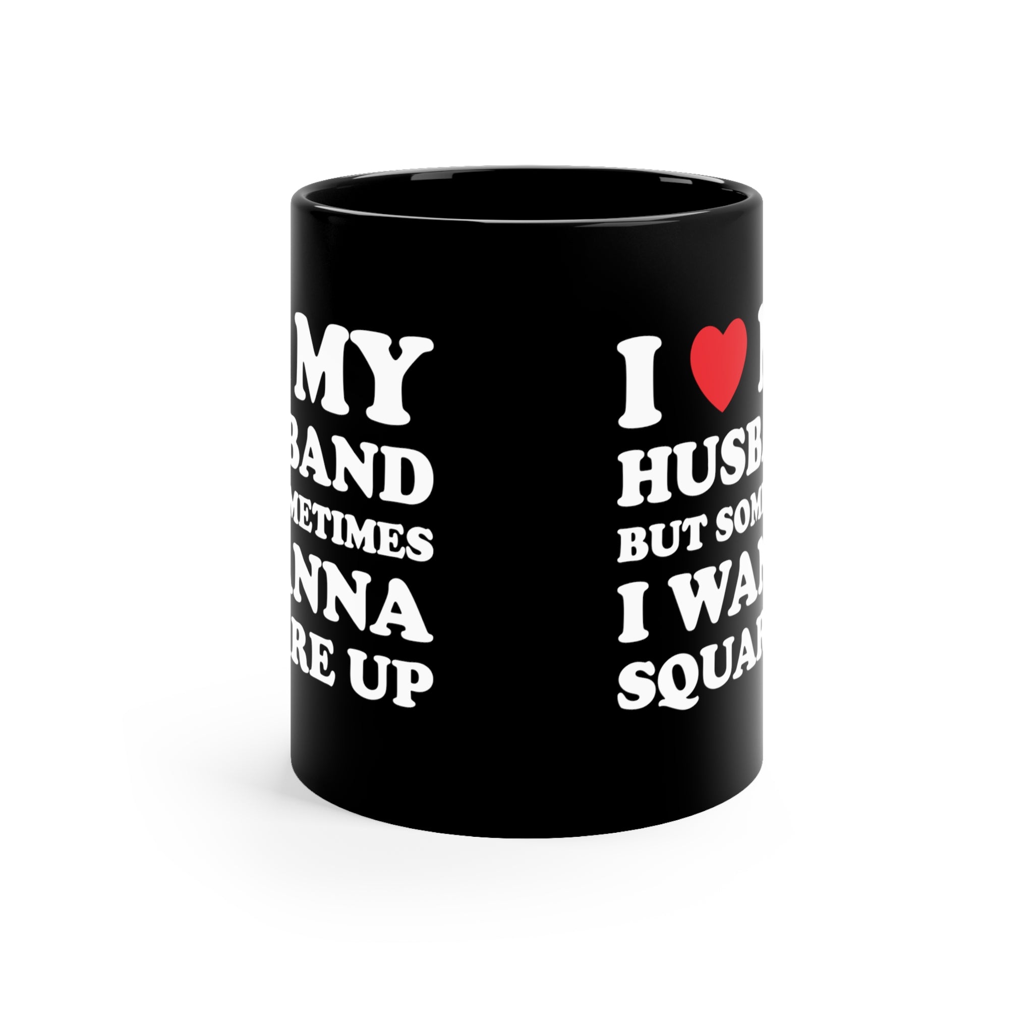 The design of the mug is eye – catching. With a solid black body, bold white sans – serif text, and a vibrant red heart replacing the “O” in “I ❤️ MY”, it creates a perfect contrast for excellent readability. The message “I ❤️ MY HUSBAND BUT SOMETIMES I WANNA SQUARE UP” is a light – hearted take on the dynamics of a married relationship, making it both humorous and affectionate.