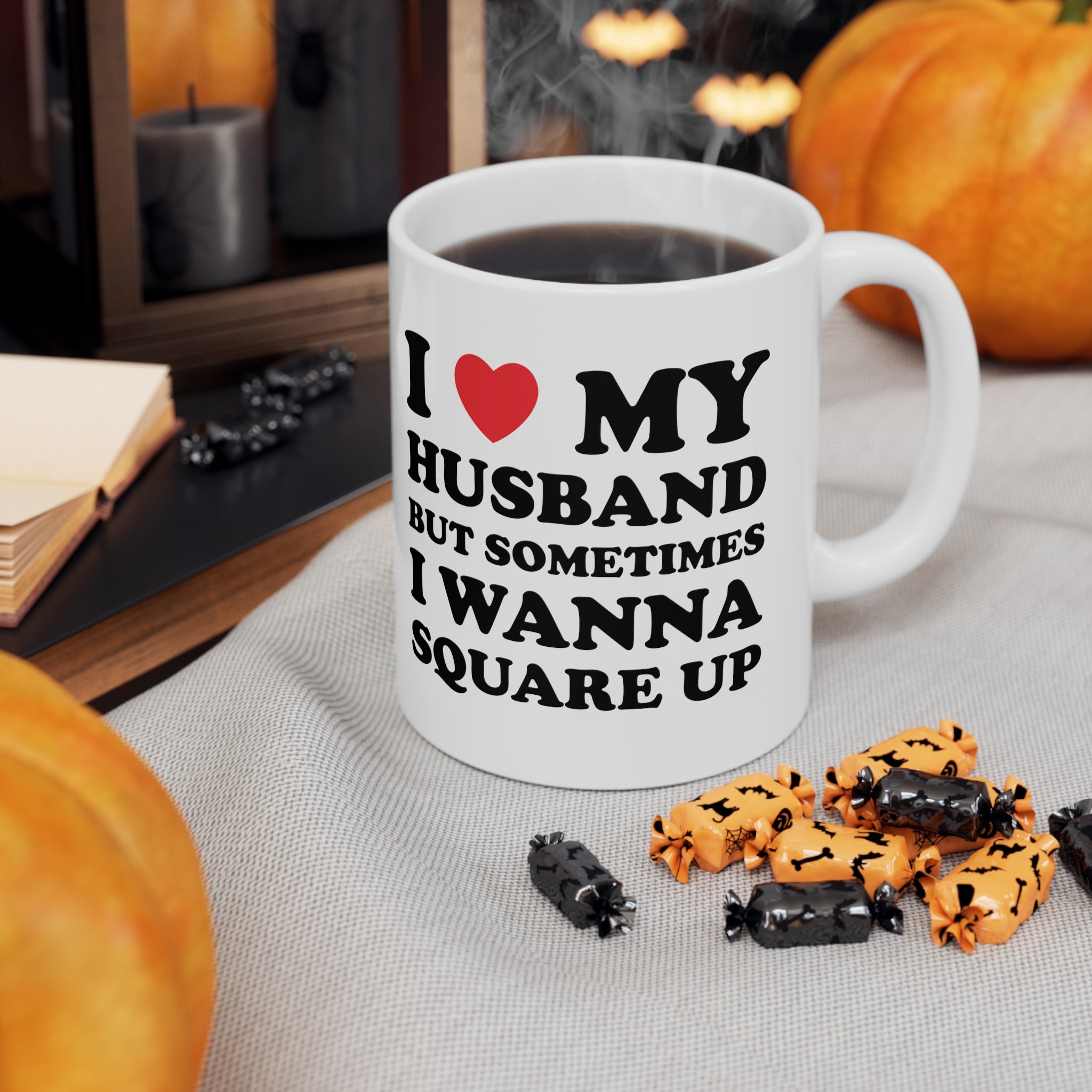 The mug is crafted from high – quality ceramic or porcelain, featuring a smooth, white, and glossy finish. The design, with bold black sans – serif text and a red heart, is applied via sublimation or direct ceramic printing, ensuring durability against daily use. The text is arranged vertically in a playful and retro – inspired style, with a red heart replacing the word “love”. It reads “I”, followed by the heart, then “MY”, “HUSBAND”, “BUT SOMETIMES”, “I WANNA”, and “SQUARE UP”.