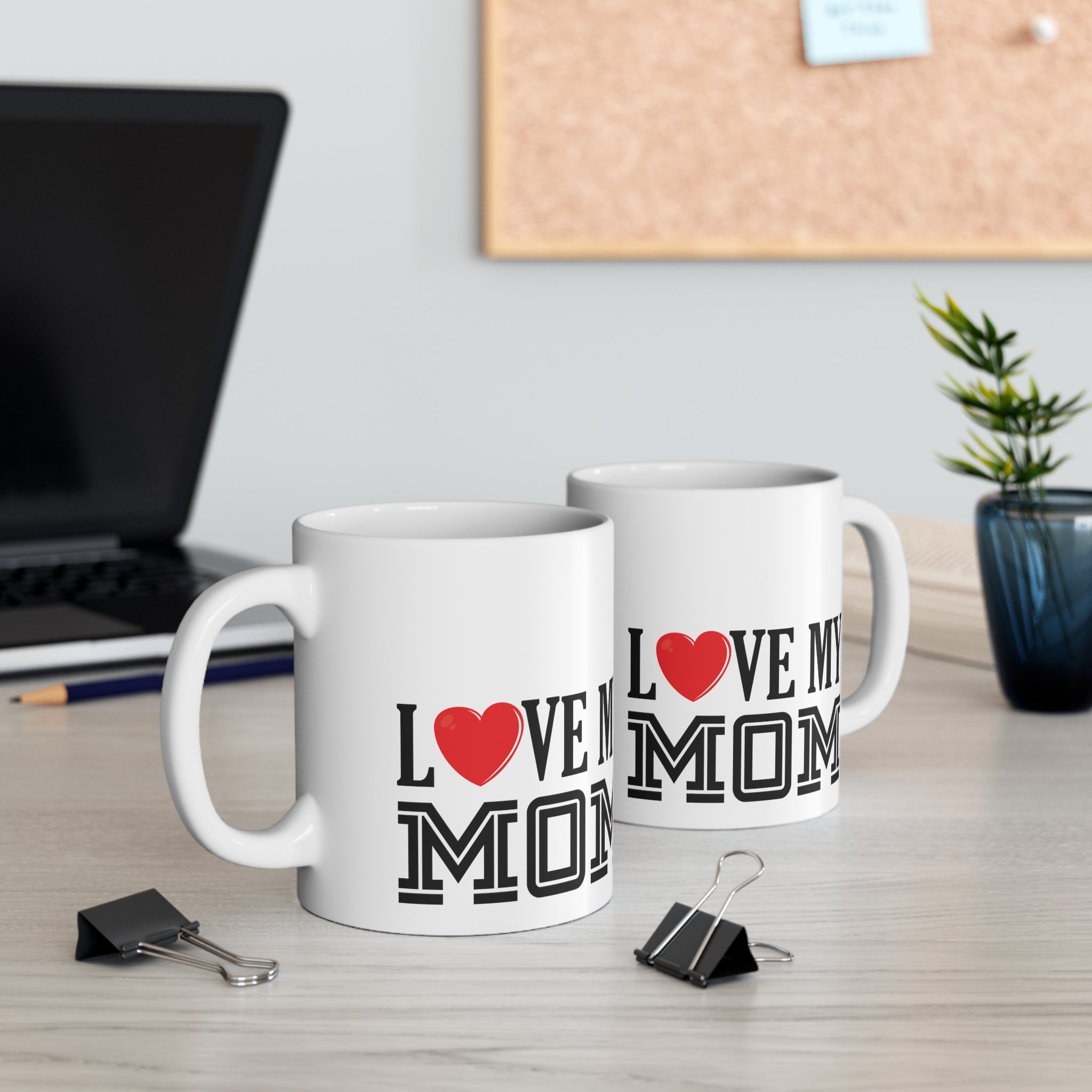 The design of this mug is both simple and sentimental. The primary color is white, serving as a perfect base for the bold black text that reads “I LOVE MY MOM.” A vibrant red heart replaces the “O” in “LOVE”, adding a pop of color and emphasis. The “MOM” text is in a larger, stylized, varsity – style font with thick black outlines, creating a high – contrast and eye – catching look.