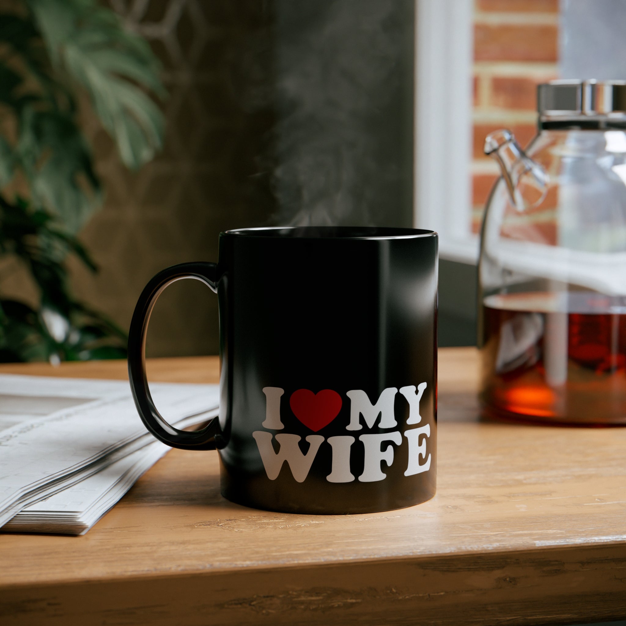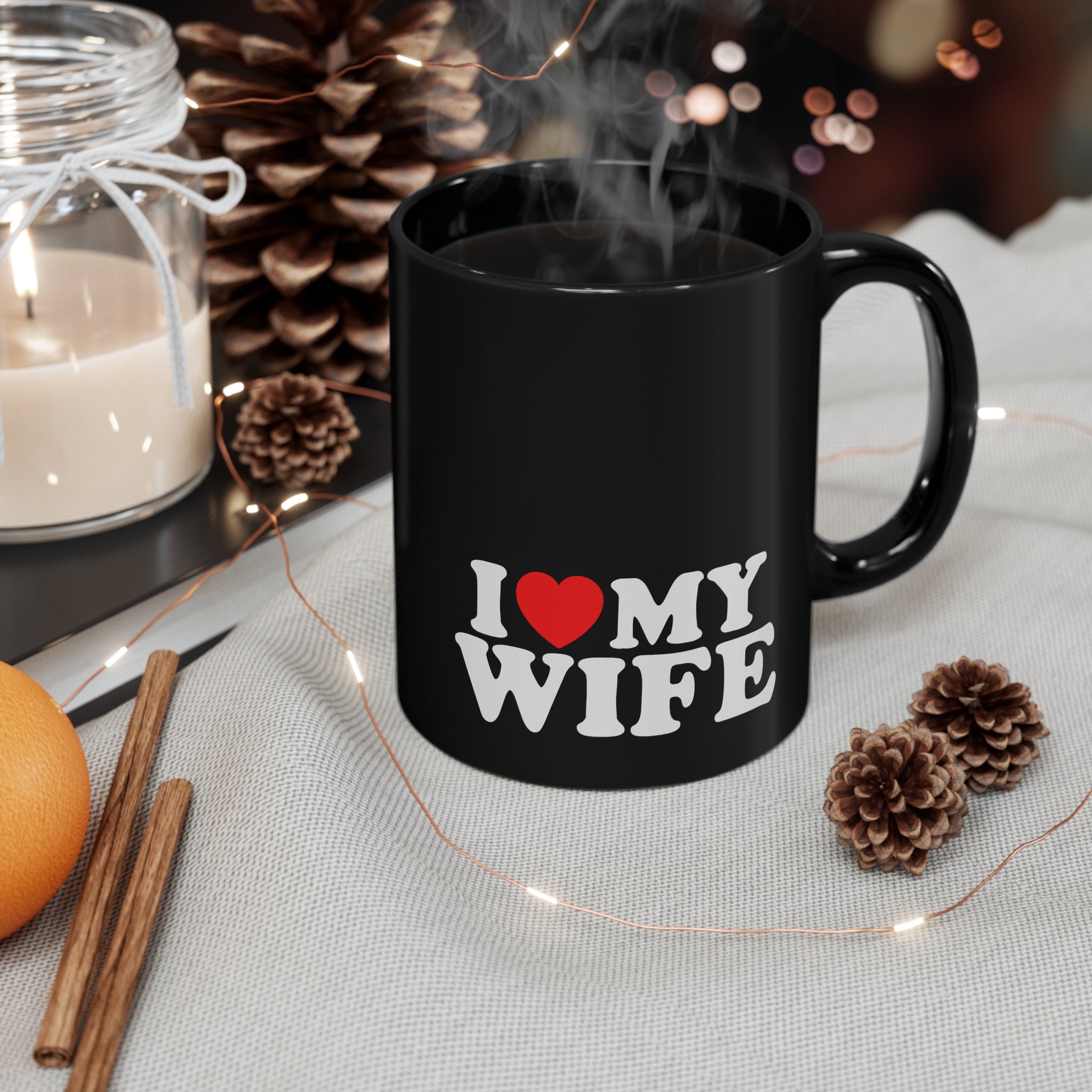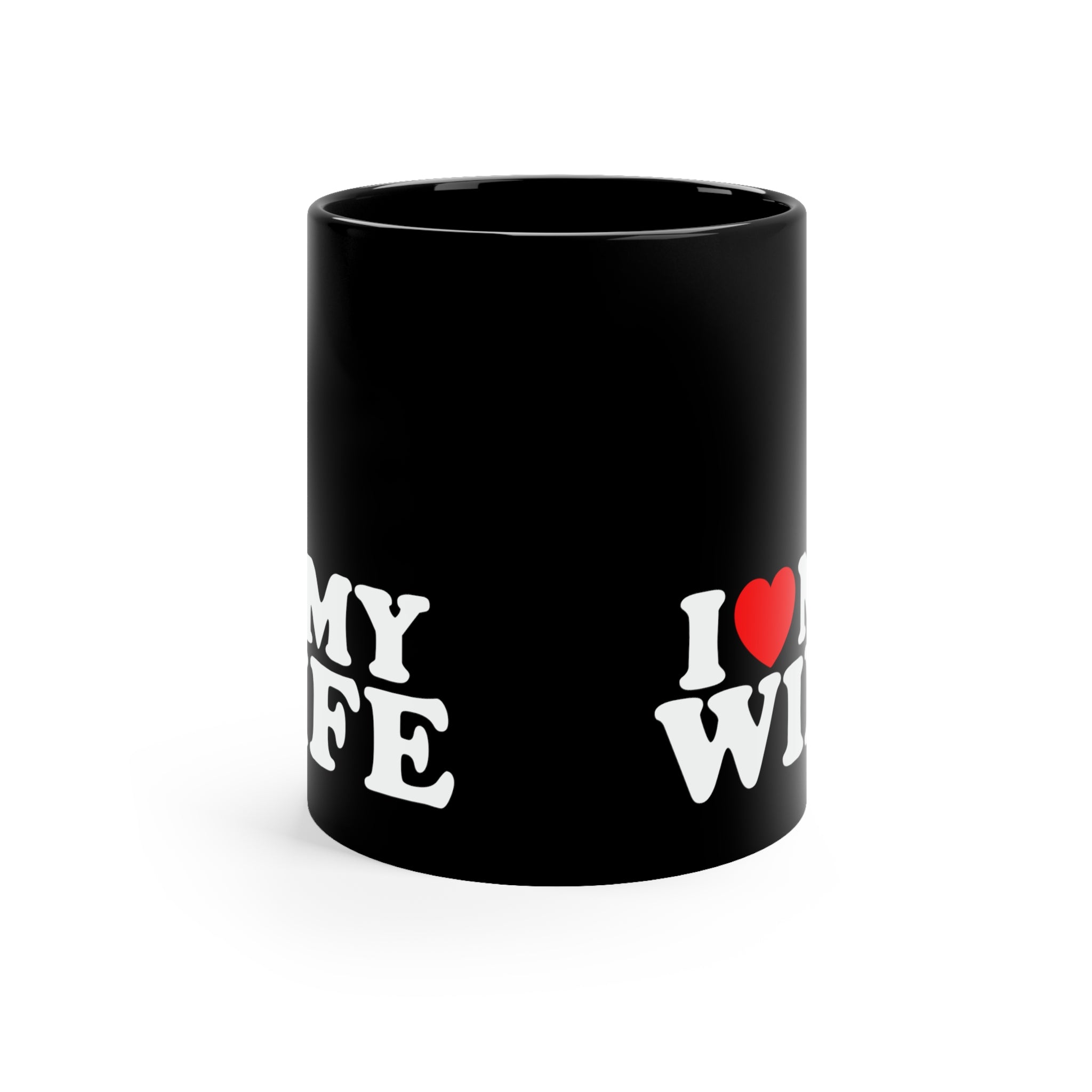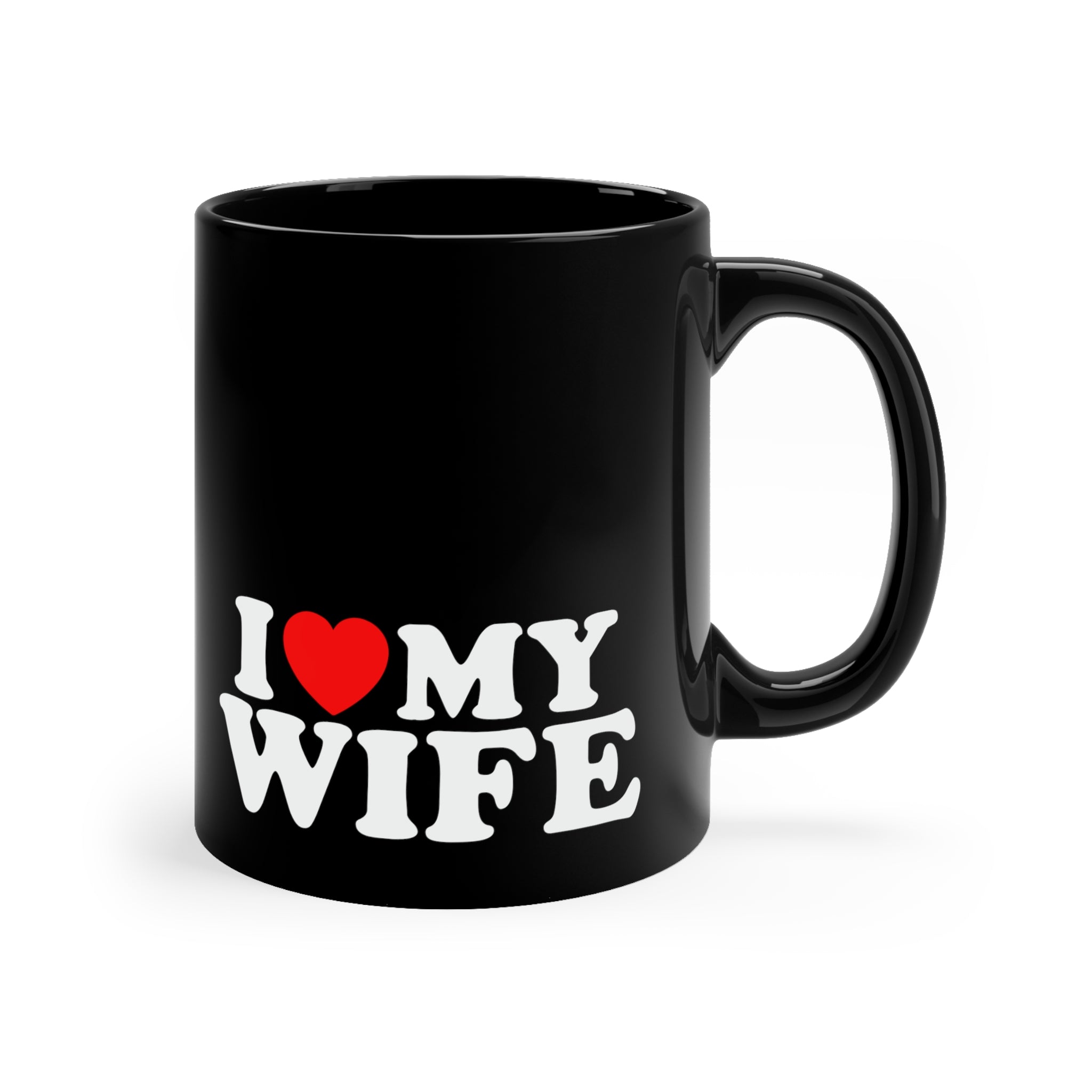 The mug is crafted from high – quality ceramic, known for its durability and heat – resistance, making it perfect for daily use. It features a solid black base with a glossy finish, creating a sleek and modern look. The white, bold, block – style text “I ❤️ MY WIFE” is crisply printed on the mug. The red heart, a classic symbol of love, is positioned between “I” and “MY”, and the white text has a slight shadow or outline for excellent visibility against the black background.