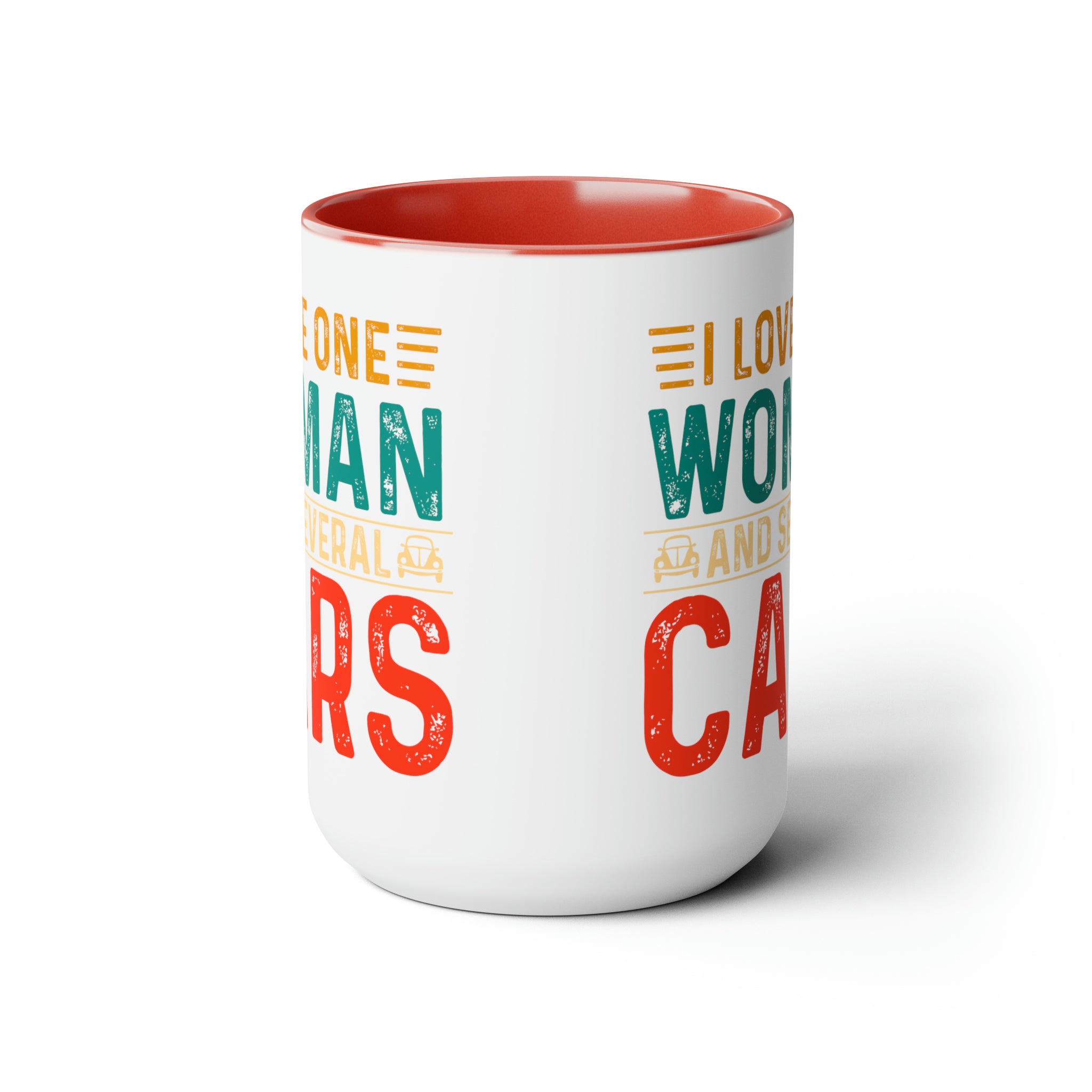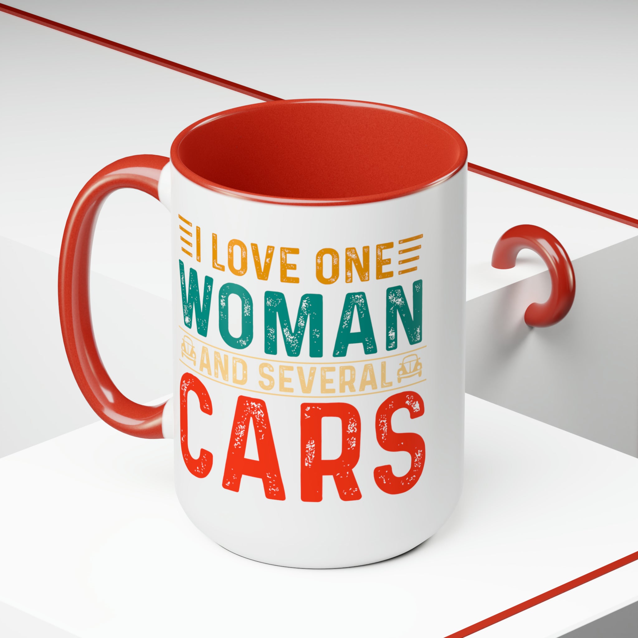 The two-tone color scheme of red interior and handle with a white exterior creates a striking visual contrast, while the vintage distressed graphics and small car icons add a nostalgic touch. The humorous phrase “I LOVE ONE WOMAN AND SEVERAL CARS” is sure to bring a smile to your face every time you take a sip of your favorite coffee, tea, or hot chocolate.