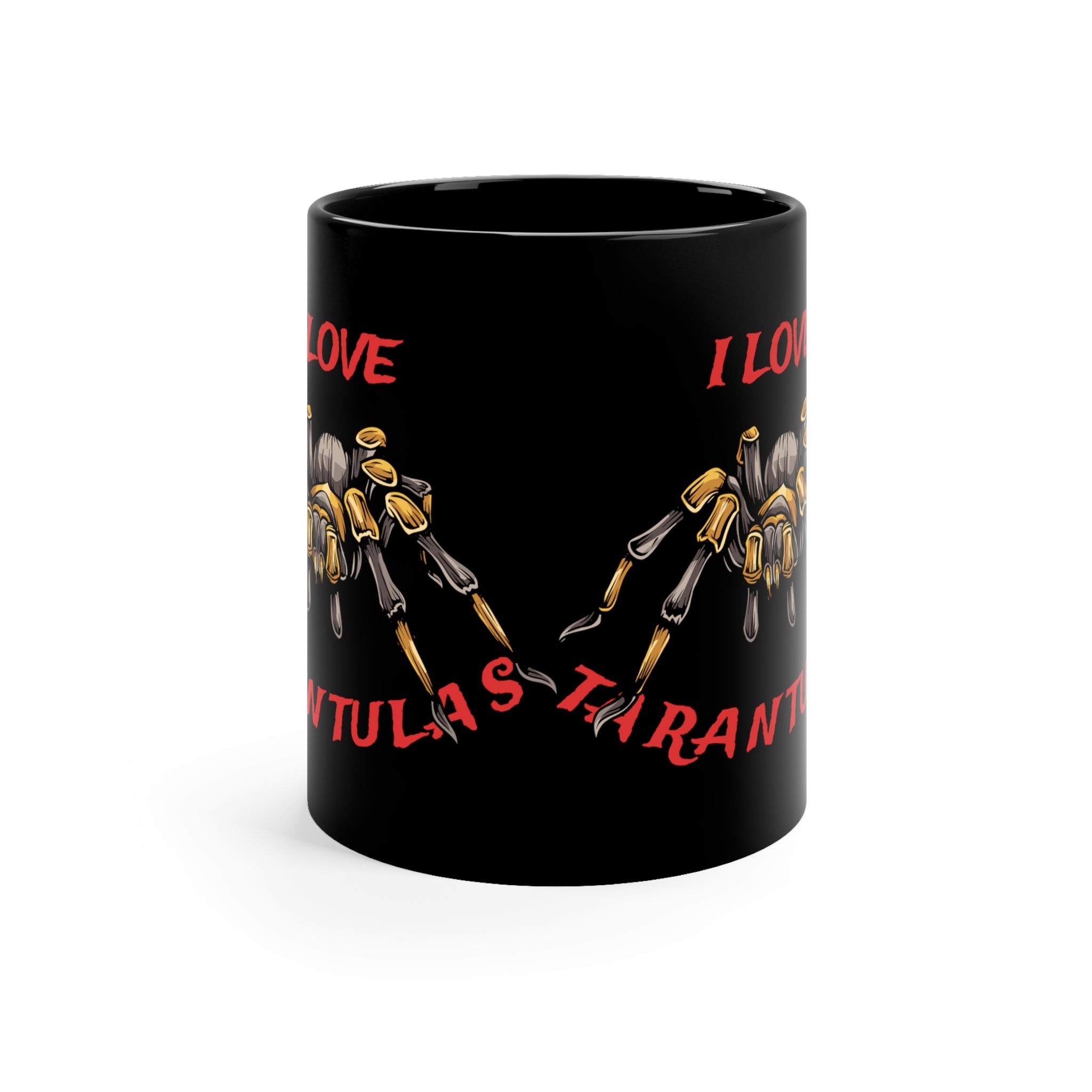The mug features a glossy black exterior and interior, providing a sleek and sophisticated look. The bold red lettering that reads “I LOVE” at the top and “TARANTULAS” curved beneath a detailed, cartoonish tarantula illustration makes a strong visual statement. The tarantula has a grayish – brown body and legs, with dark gray/black legs adorned with yellow – gold segmented “armor”. Its menacing, clawed front legs and spiny details add to the artistic, arachnid – focused aesthetic. The black background makes the red text and the tarantula’s yellow/gray hues truly pop, ensuring the design is eye – catching and vibrant.