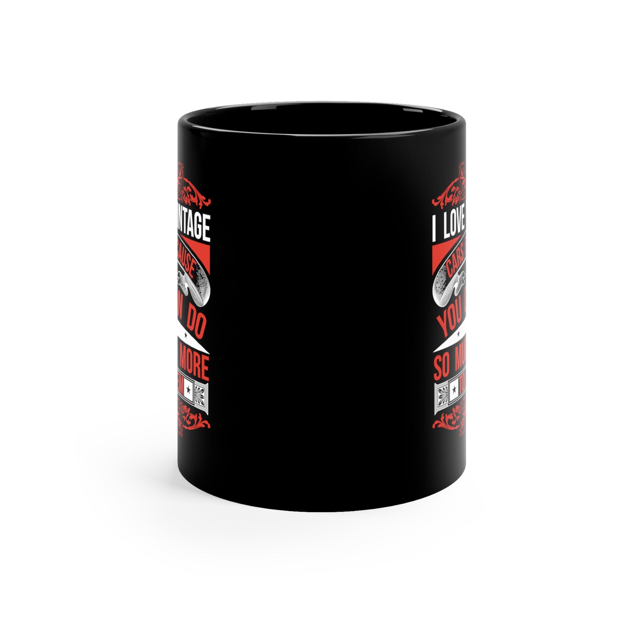 The color scheme and design of this mug are truly eye – catching. The base color is a solid, glossy black that serves as a perfect backdrop for the bold text and graphic elements. The text comes in white, red, and black, arranged vertically with decorative dividers. ‘I LOVE VINTAGE’ in white bold letters sits at the top, followed by ‘CARS BECAUSE’ in red on a curved white scroll with a red background. ‘YOU CAN DO’, ‘SO MUCH MORE’ are in red bold, and ‘TO THEM’ is centered on a white banner with red borders. Ornate red scrollwork/filigree at the top and bottom, along with small star symbols, add a vintage and decorative touch, enhancing the overall retro aesthetic.
