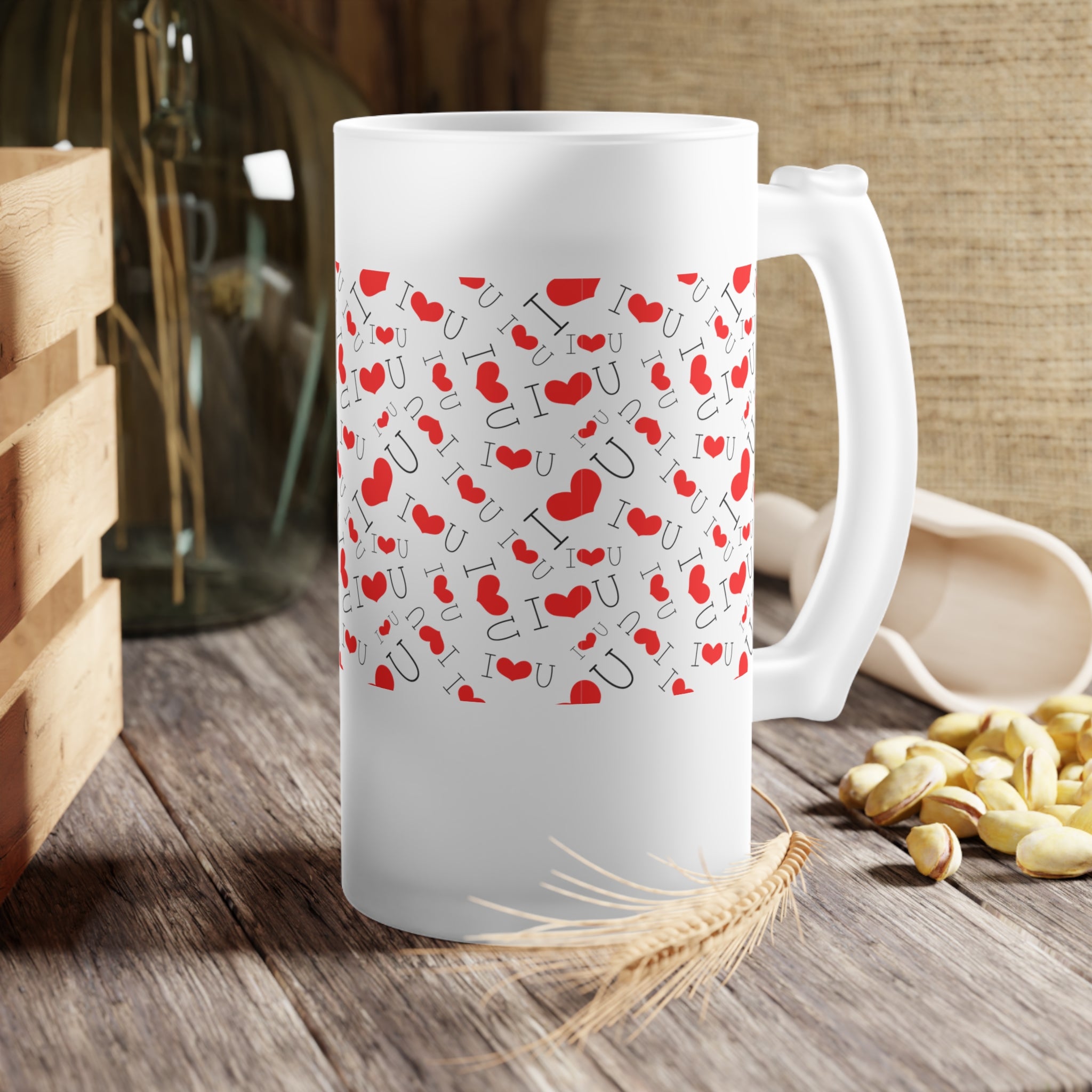 Introducing the I Love You Frosted Glass Beer Mug, a perfect blend of style and functionality. This mug is not just an ordinary drinking vessel; it’s a statement piece that adds a touch of romance and festivity to any occasion.