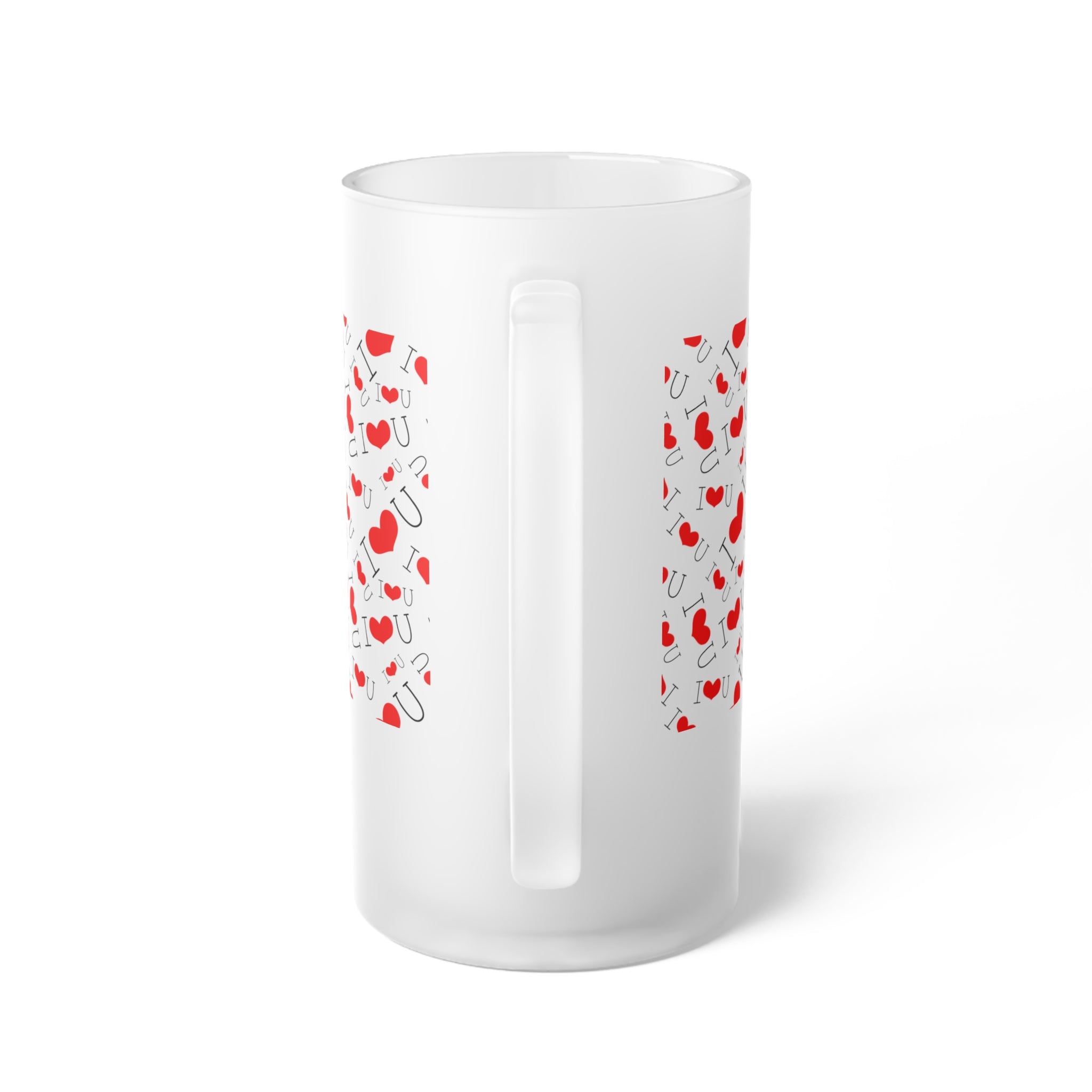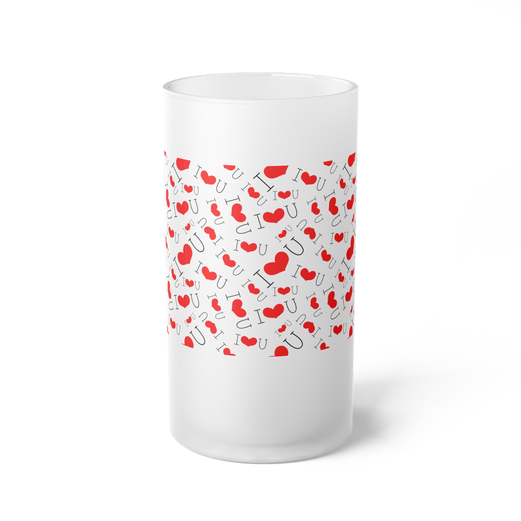 The primary colors of the mug are white (from the frosted base) and red, with a repeating pattern of red hearts in varying sizes and “I ❤️ U” motifs. The “I” and “U” are in black, and the heart symbol replaces the “love” element, creating a cohesive and playful Valentine’s Day – themed design.