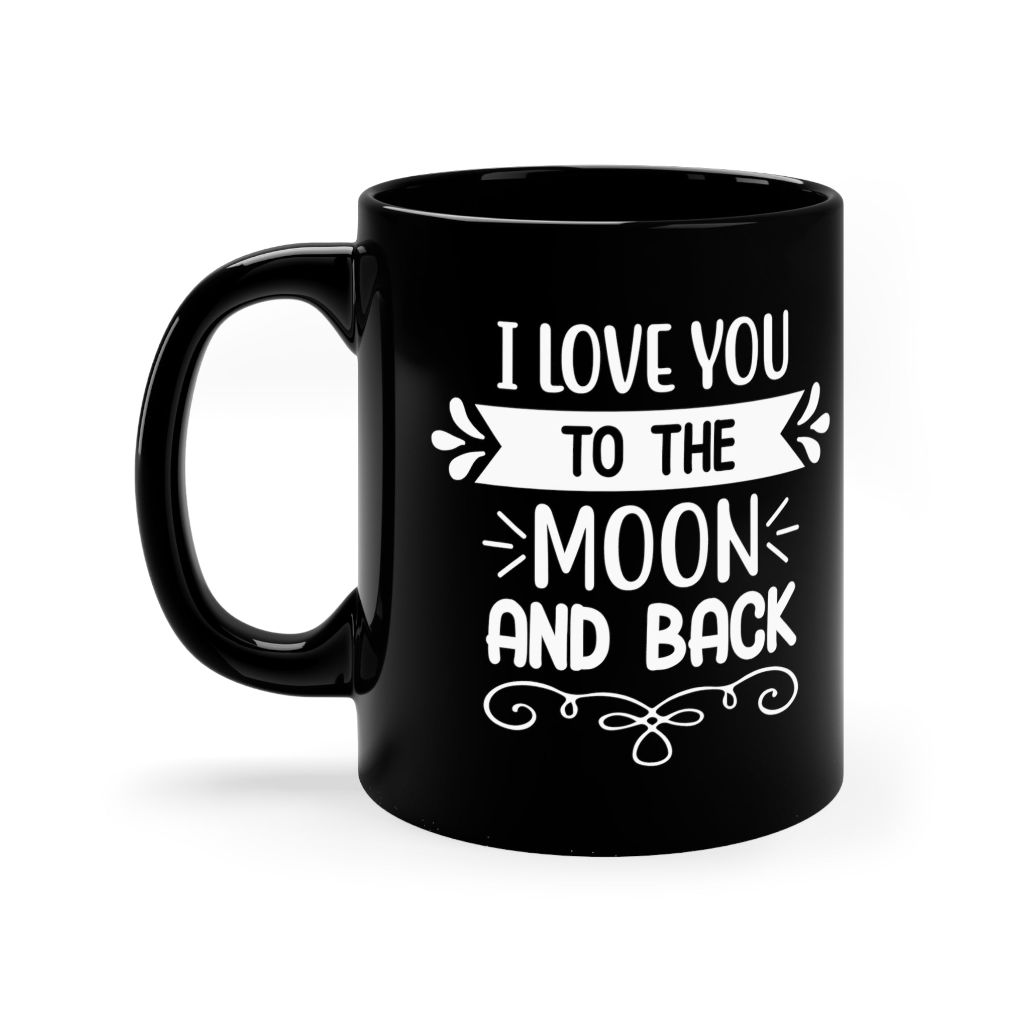 The white printed text and decorative elements on the mug are truly eye – catching. The phrase “I LOVE YOU TO THE MOON AND BACK” is split into segments. “I LOVE YOU” is printed at the top in bold white font, followed by a white banner with “TO THE” centered and flanked by decorative arrow – like flourishes. “MOON” is in the middle, bold with small white accent lines for emphasis, and “AND BACK” at the bottom in a playful white font. An ornate white swirly design at the bottom adds a romantic and whimsical touch.