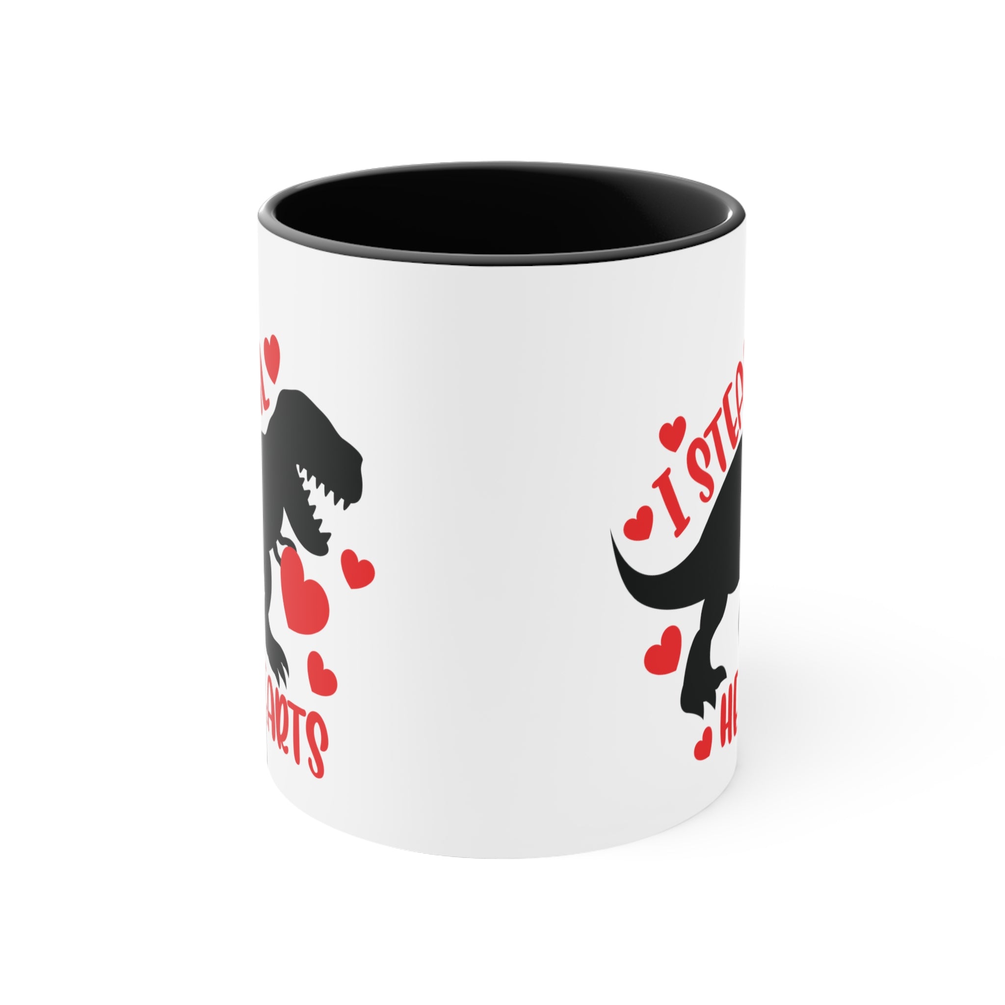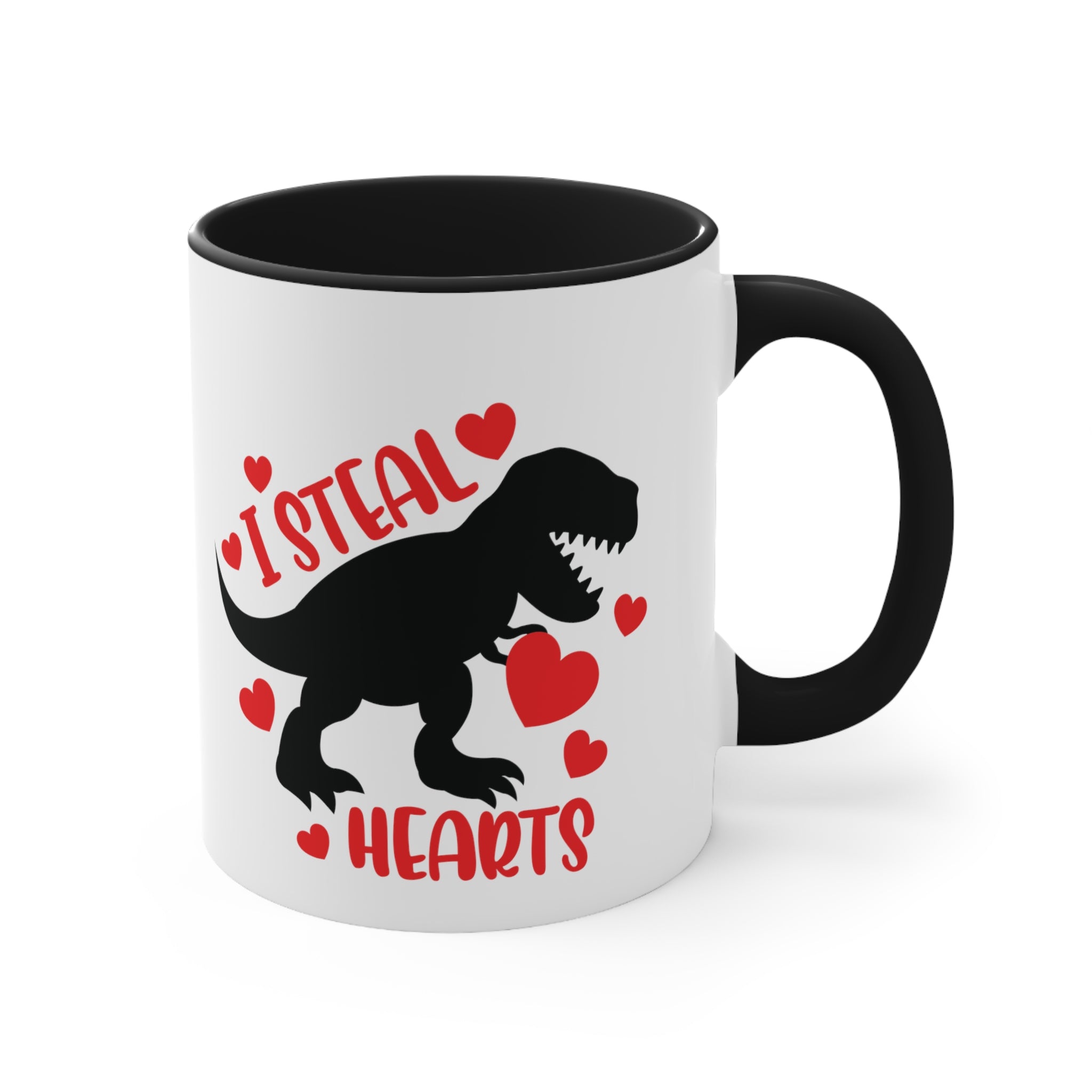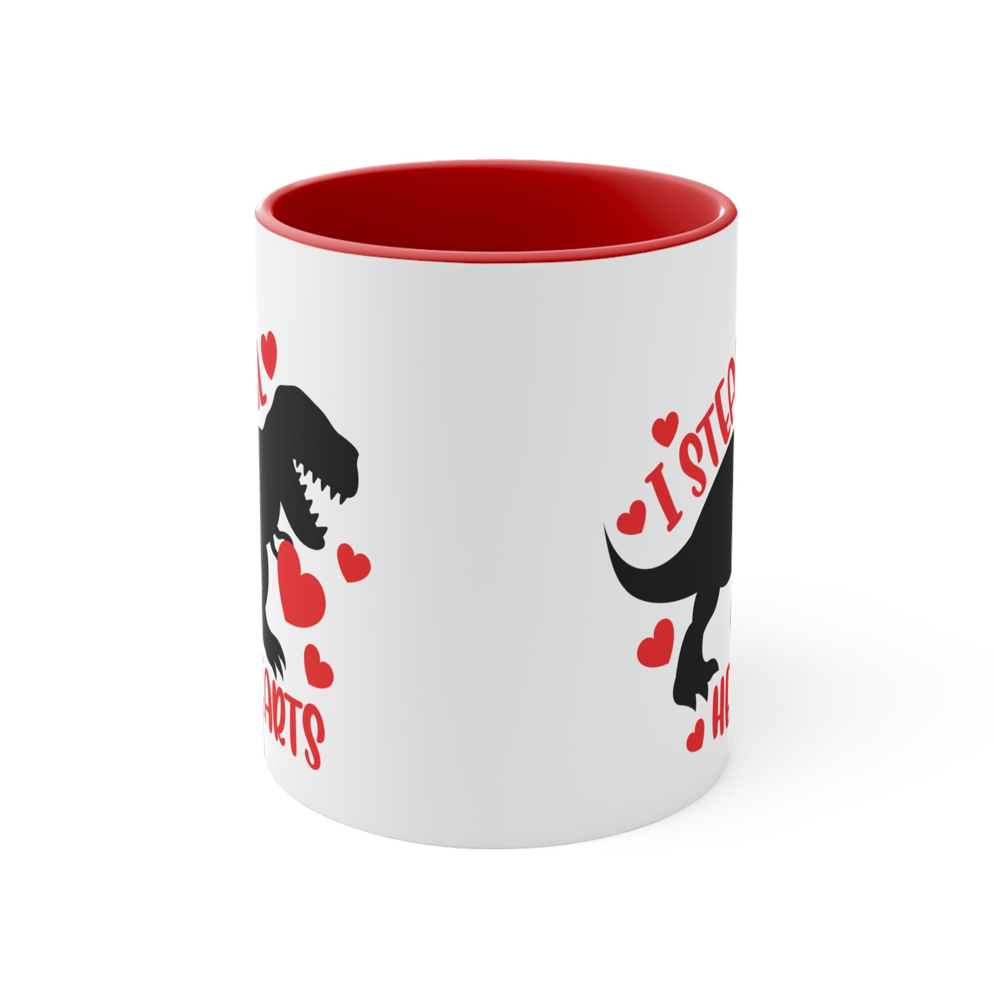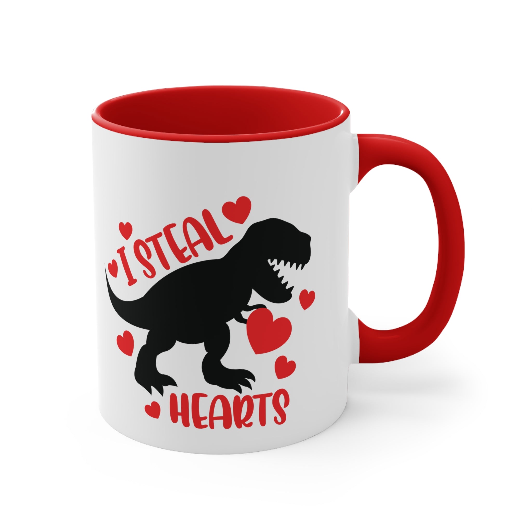 The printed design on the mug is truly eye – catching. A bold black silhouette of a T – Rex holds a large red heart, surrounded by smaller red hearts. The playful red text “I STEAL HEARTS” in a rounded, whimsical font adds humor and charm. The T – Rex silhouette and heart motifs are centered, ensuring visibility from all typical viewing angles.