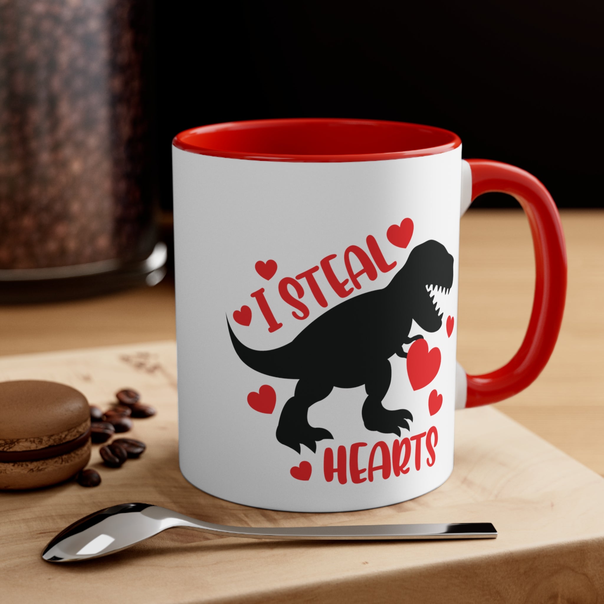 Introducing the I Steal Hearts Accent Coffee Mug, a delightful blend of functionality and charm! This 11oz ceramic mug is a perfect addition to your daily beverage routine or a wonderful gift for dinosaur lovers, fans of cute designs, or those who adore Valentine’s Day-themed items.
