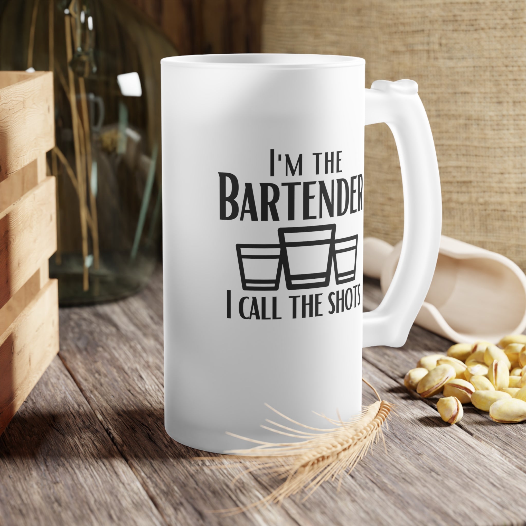 Made from frosted glass, it has a sleek, modern look. The white, opaque, and smooth frosted finish not only gives it a minimalist aesthetic but also reduces glare and reflections. The mug features bold black text that reads, “I’M THE BARTENDER I CALL THE SHOTS”, with “BARTENDER” being the largest word. Below the text, there’s a graphic of three shot glasses, two smaller on the sides and one larger in the center, adding to its playful bartender theme.