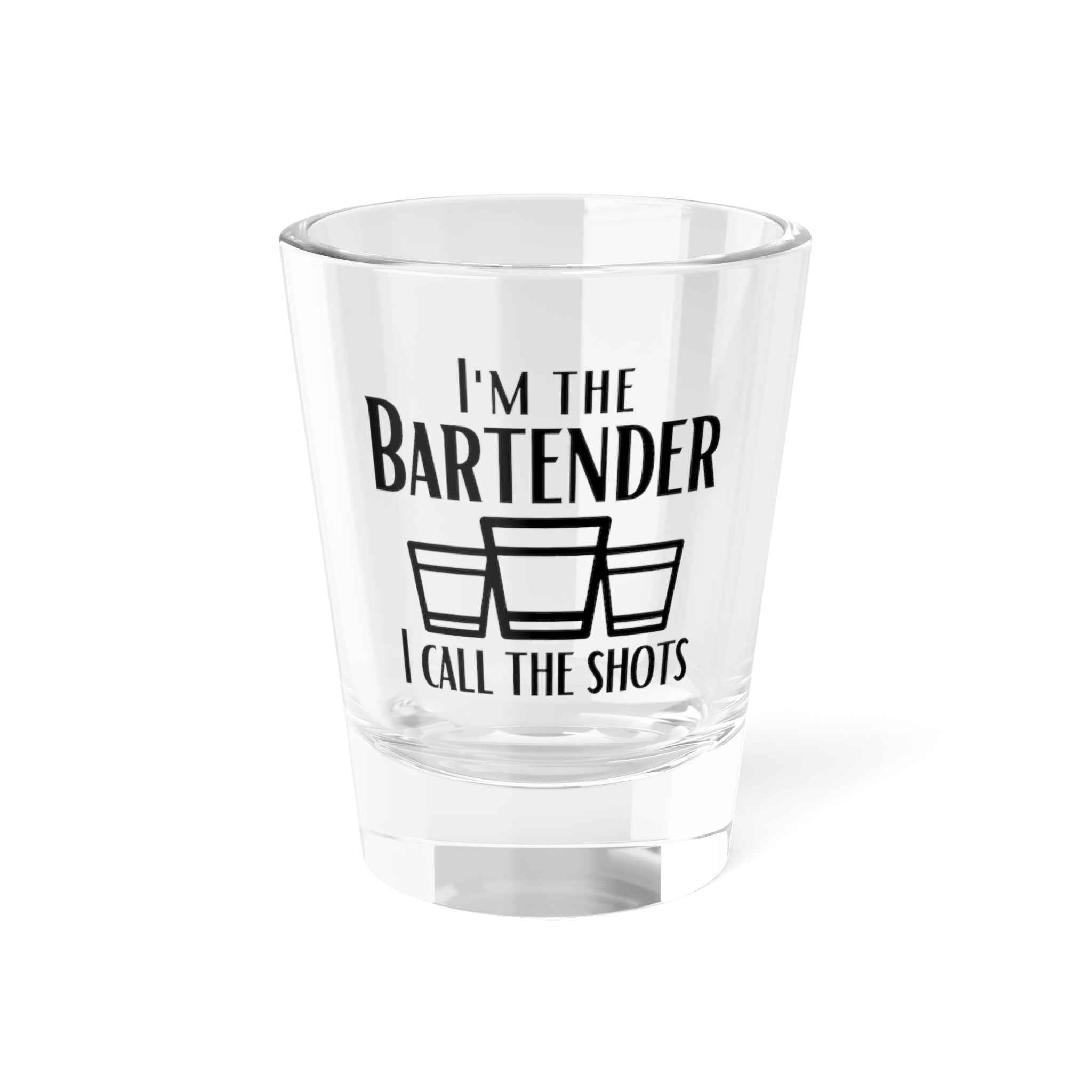 The shot glass features bold black text and line art of shot glasses. The text reads, “I’M THE BARTENDER I CALL THE SHOTS”, with a central shot glass flanked by two smaller ones, creating a playful and humorous design that emphasizes the bartending theme. Some views show mirrored or lighter text (e.g., white), suggesting alternate printing techniques or orientations. The printed graphics and text are clear, crisp, and well – aligned, and are likely the result of high – quality screen printing or etching, making them resistant to wear from washing.
