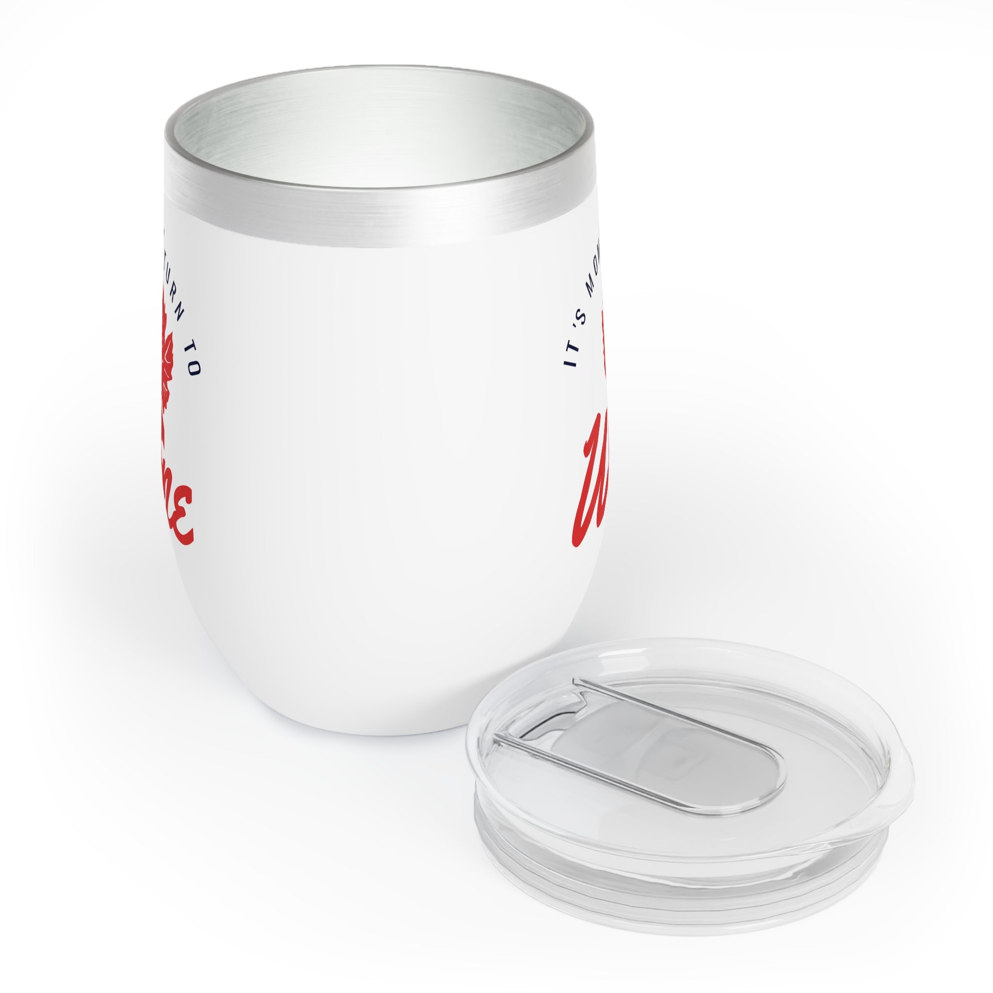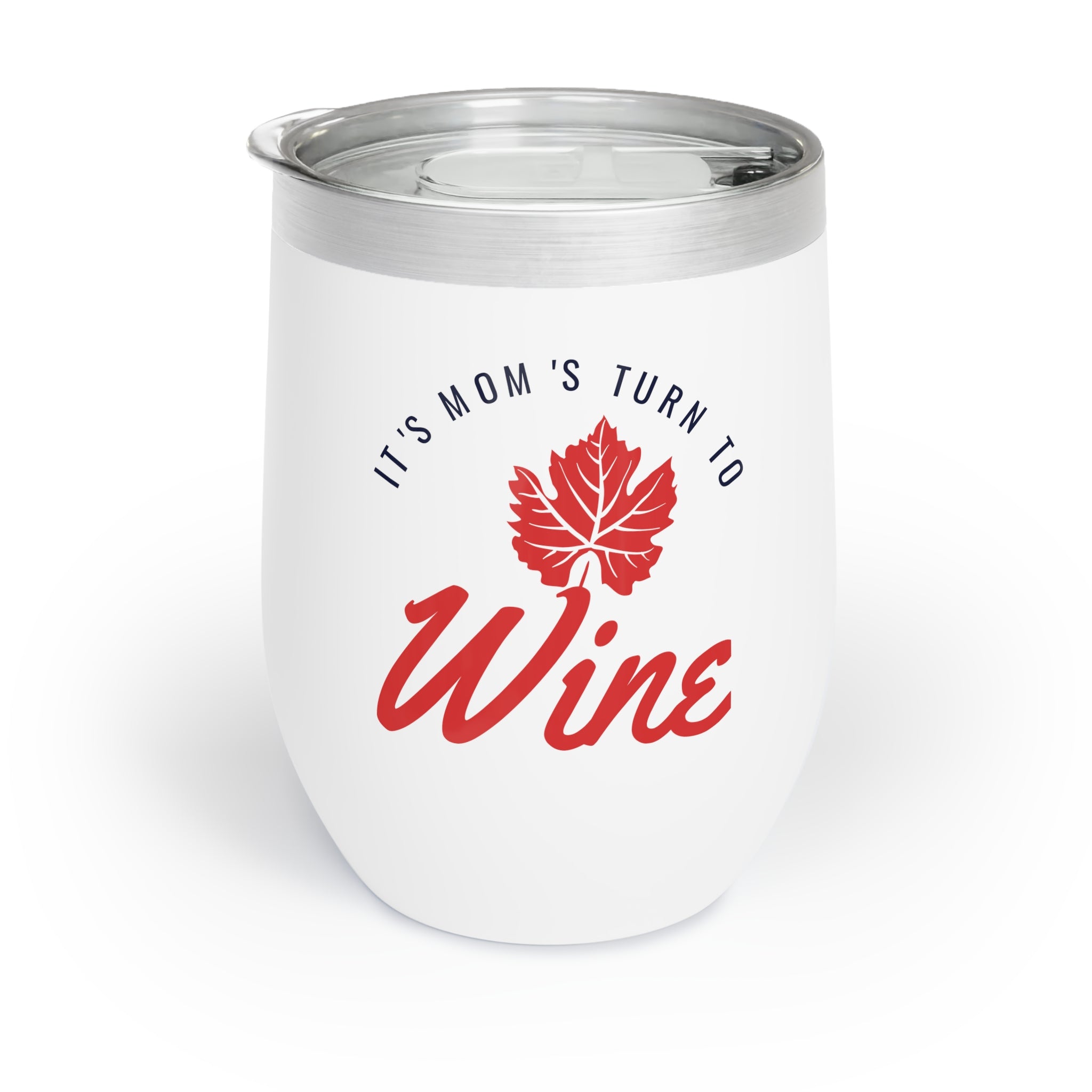 The tumbler’s design is a visual delight. The primary color is white, accented with metallic silver/gray on the rim, red for the grape leaf graphic and the word “Wine”, and navy blue for the text “It’s Mom’s Turn to”. A detailed red grape leaf is centered on the front, with the text “It’s Mom’s Turn to” in a curved navy – blue font at the top and “Wine” in large, red cursive below the leaf. The design is mirrored on the sides, ensuring full readability from multiple perspectives.