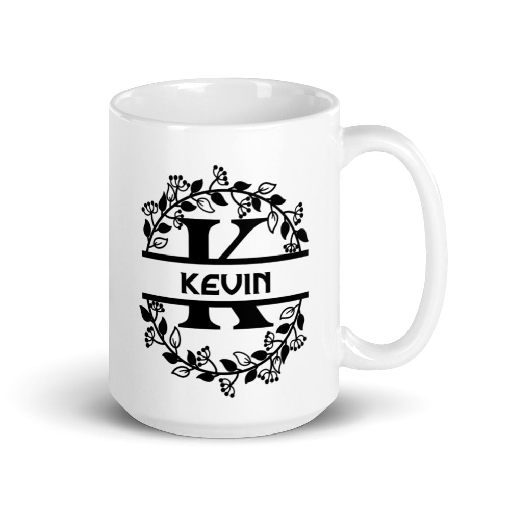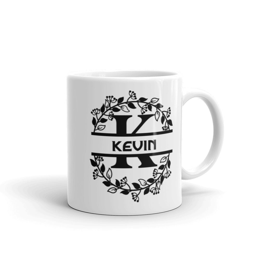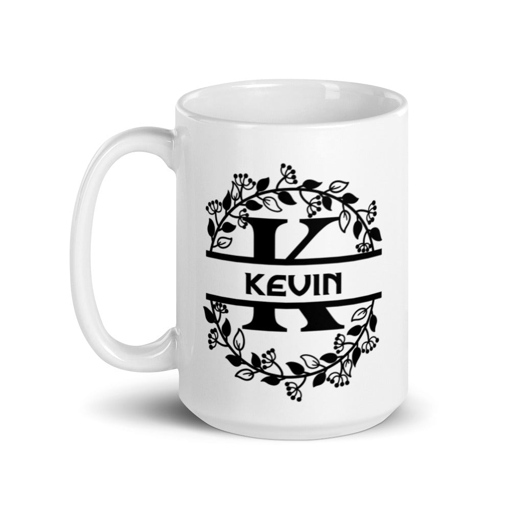 - Design: A decorative black floral and typographic design with a stylized ‘K’ and the name ‘KEVIN’, framed by a circular floral wreath that wraps around the mug