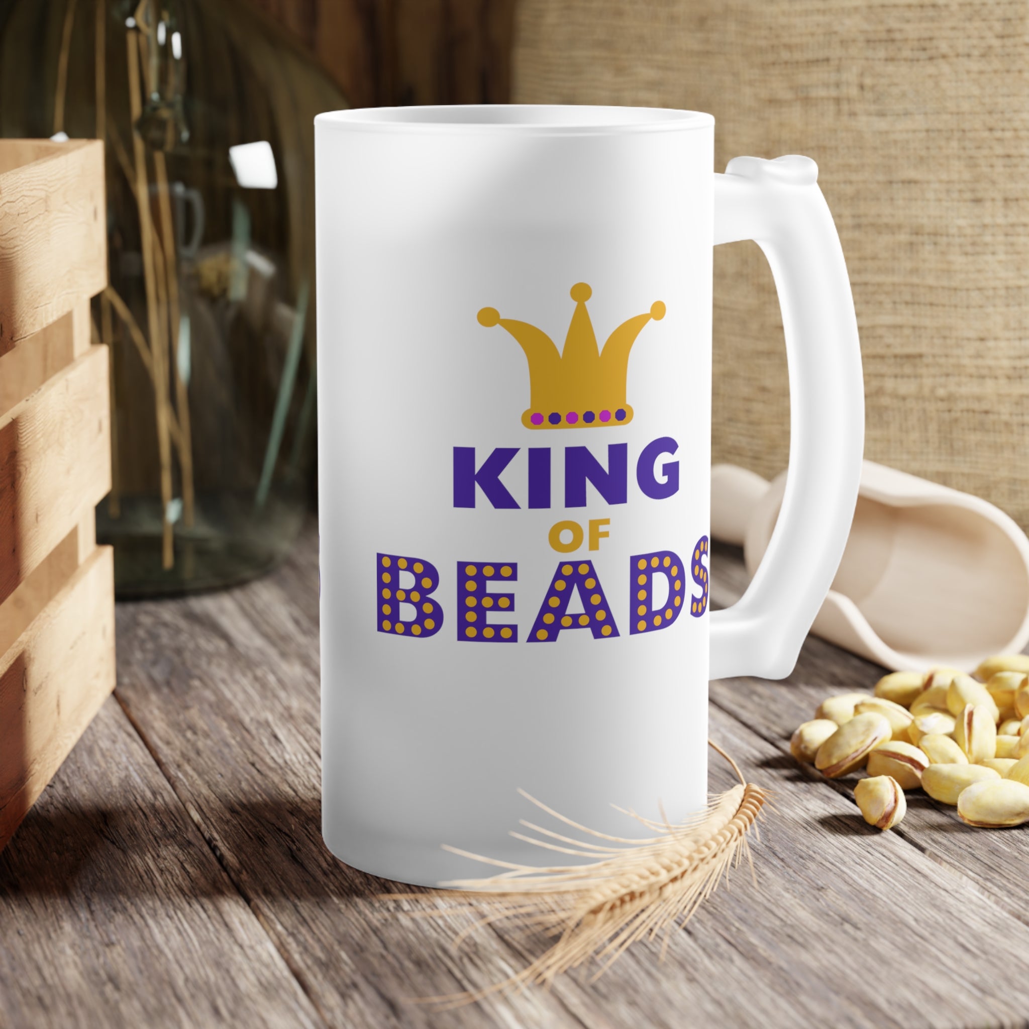 Elevate your beverage – drinking experience with our King of Beads Frosted Glass Beer Mug. This isn’t just an ordinary mug; it’s a blend of functionality and festive charm, perfect for a variety of uses and settings.