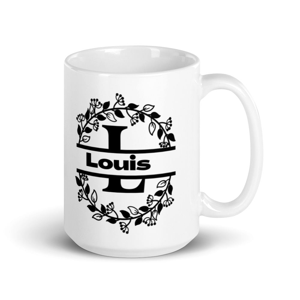 - Design: Features a classic, decorative aesthetic with a circular floral wreath, stylized ‘L’ monogram elements, and the word ‘Louis’ in bold black graphics