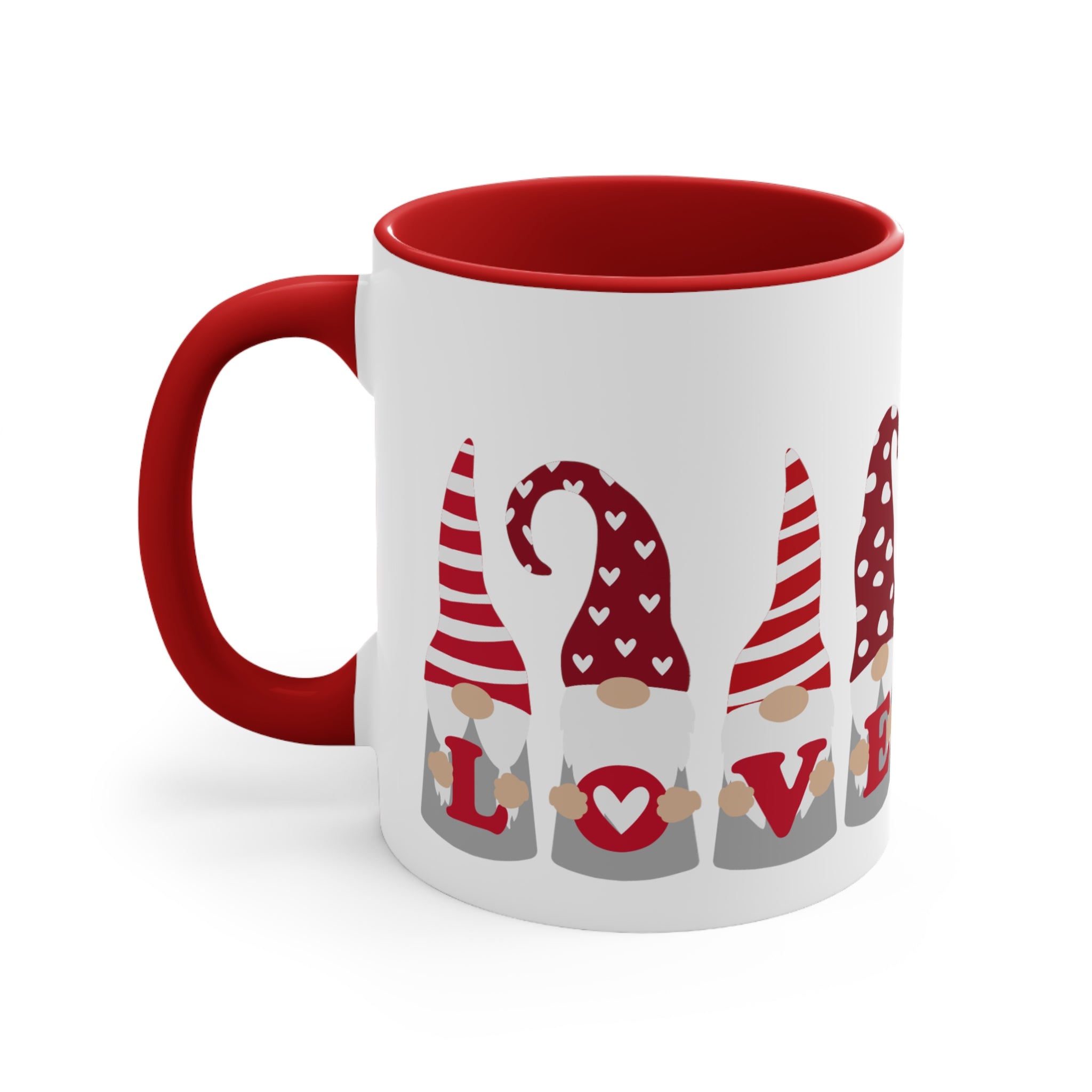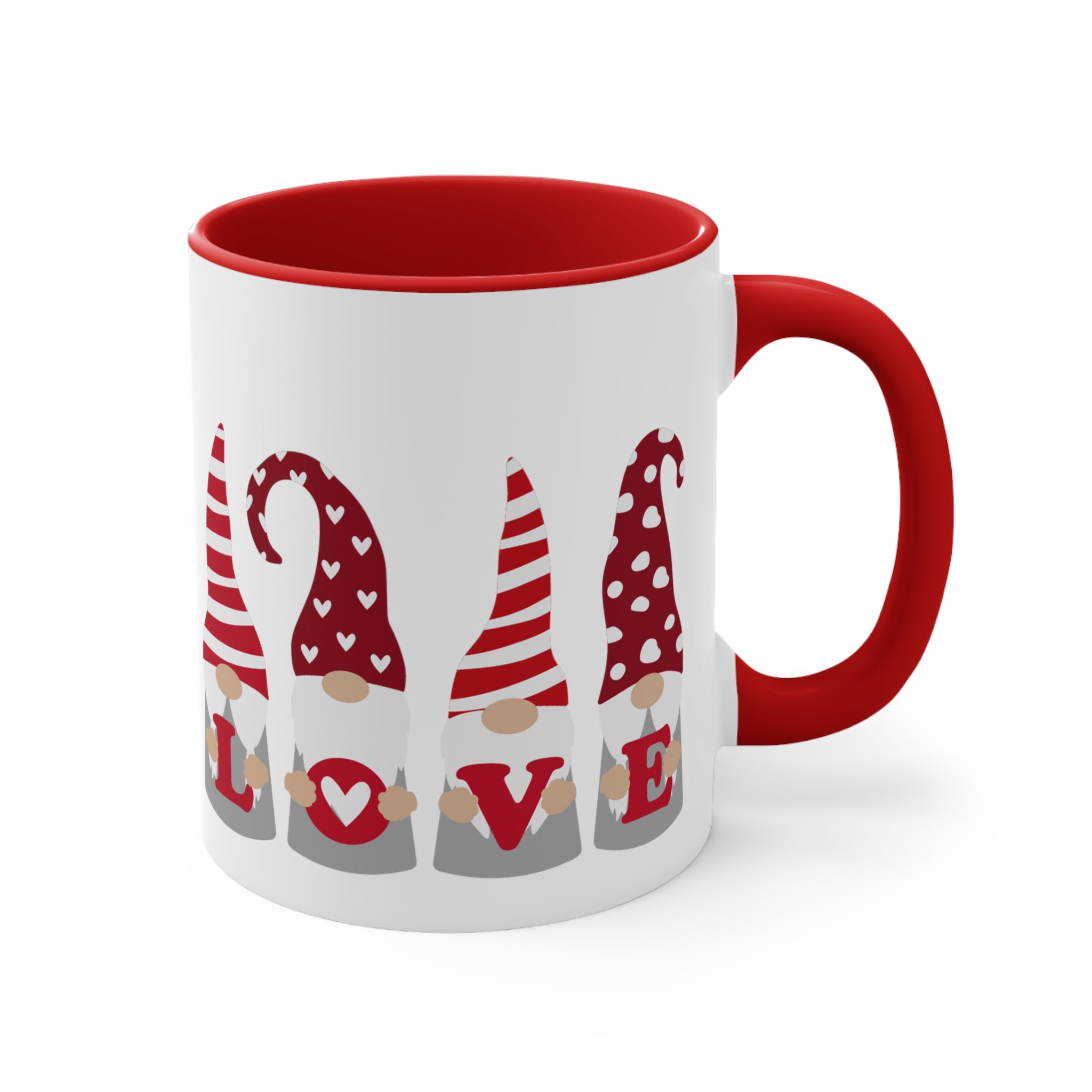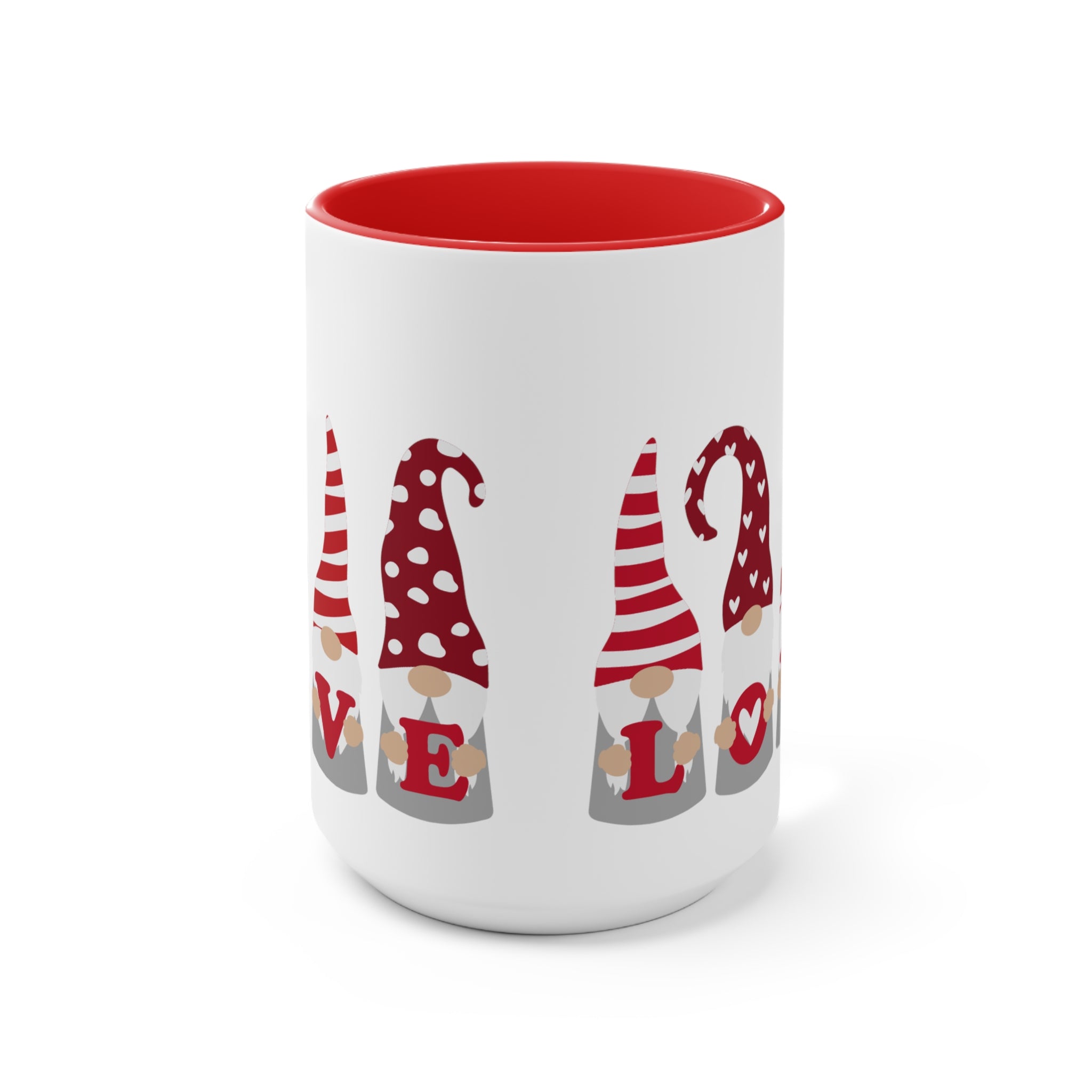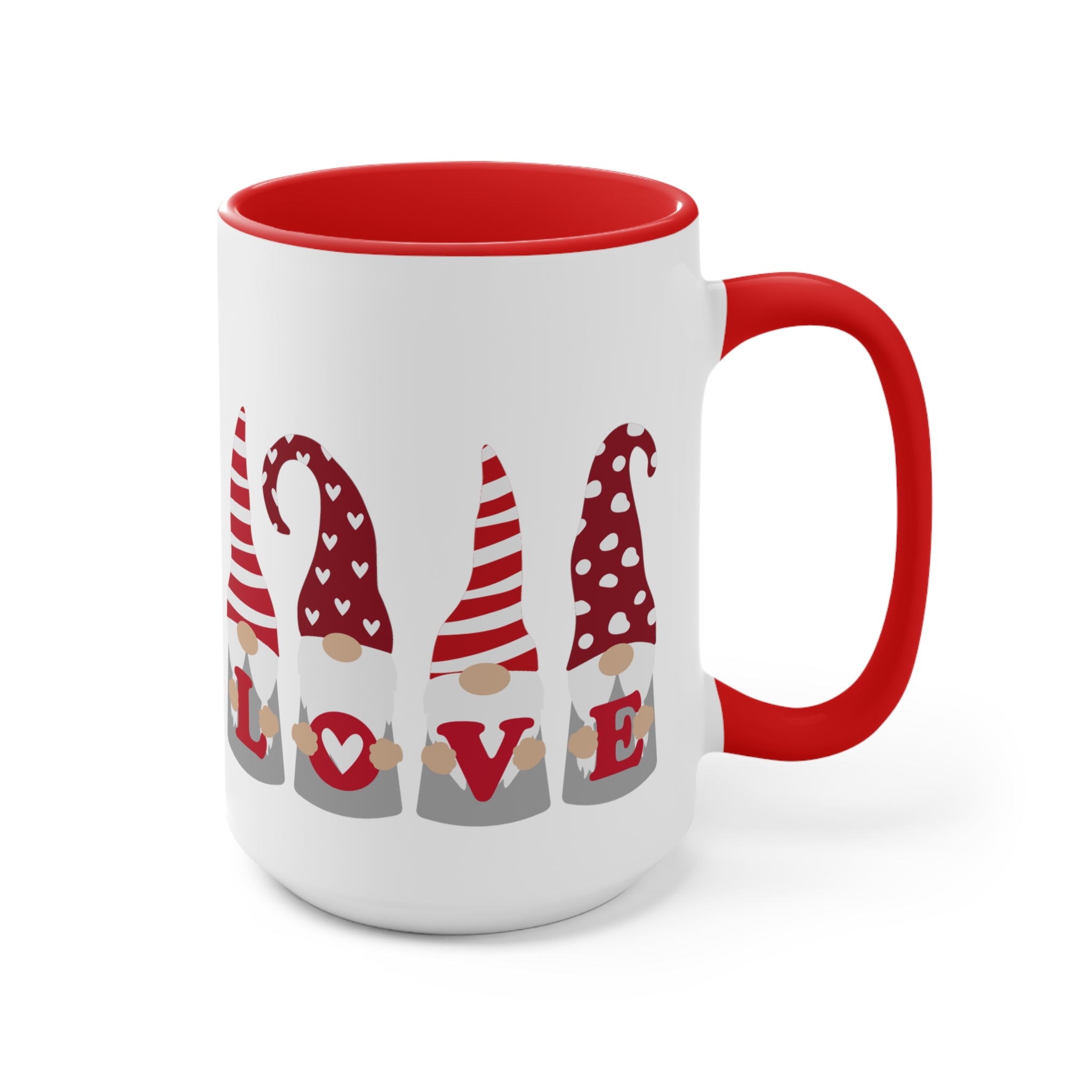 These mugs are well – crafted, with no visible defects such as uneven edges or smudged prints. The handle is securely attached, and the “LOVE” design is precisely aligned, with a consistent pattern across the gnomes. The even color distribution on the red interior and the exterior of the mug adds to its overall quality.