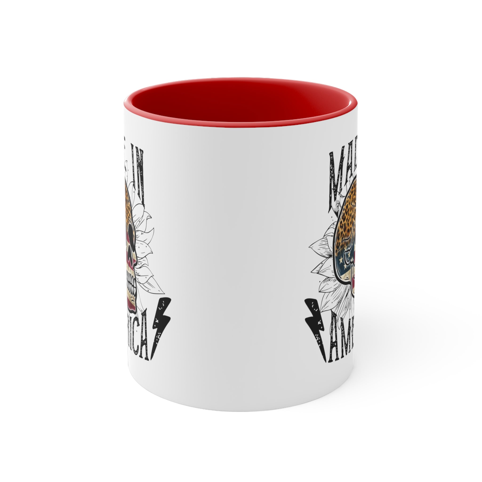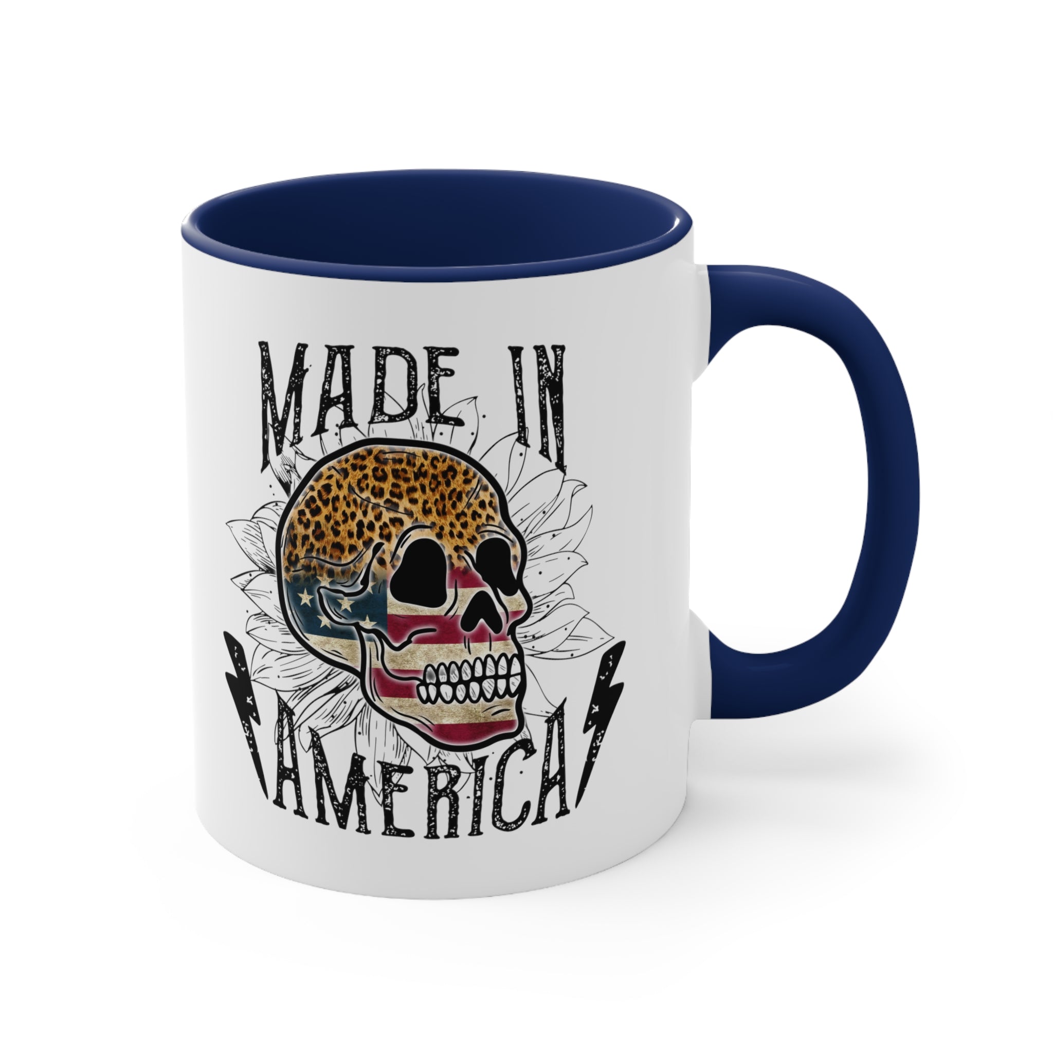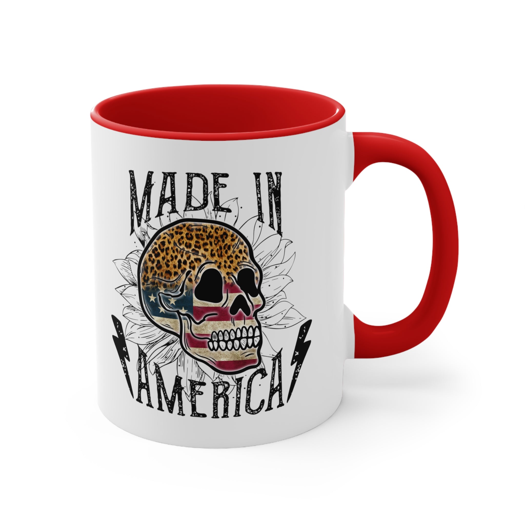 The mug features a two – tone design with a solid white ceramic exterior. The exterior showcases a detailed, vintage – inspired graphic design that combines a rugged and patriotic aesthetic. At the center is a stylized skull, with the top half in leopard print and the lower half in an American flag pattern of stars and stripes. Surrounding the skull are white floral (sunflower – like) outlines, adding a delicate touch to the bold design. The text “MADE IN AMERICA” is printed in bold, distressed, black typography, flanked by two black lightning bolts, giving it an edgy, tattoo – inspired look.