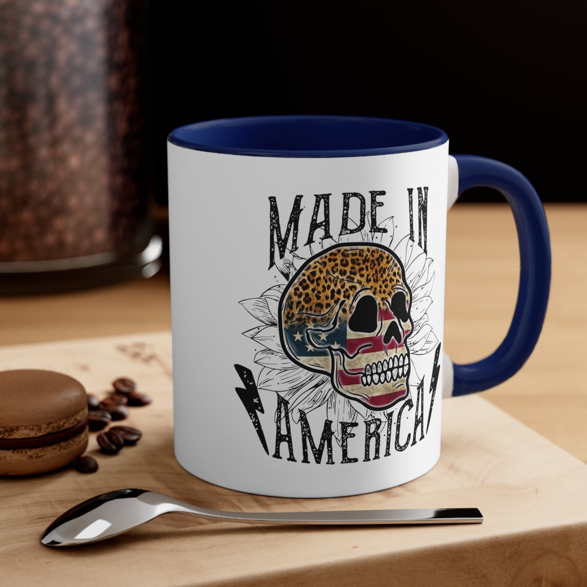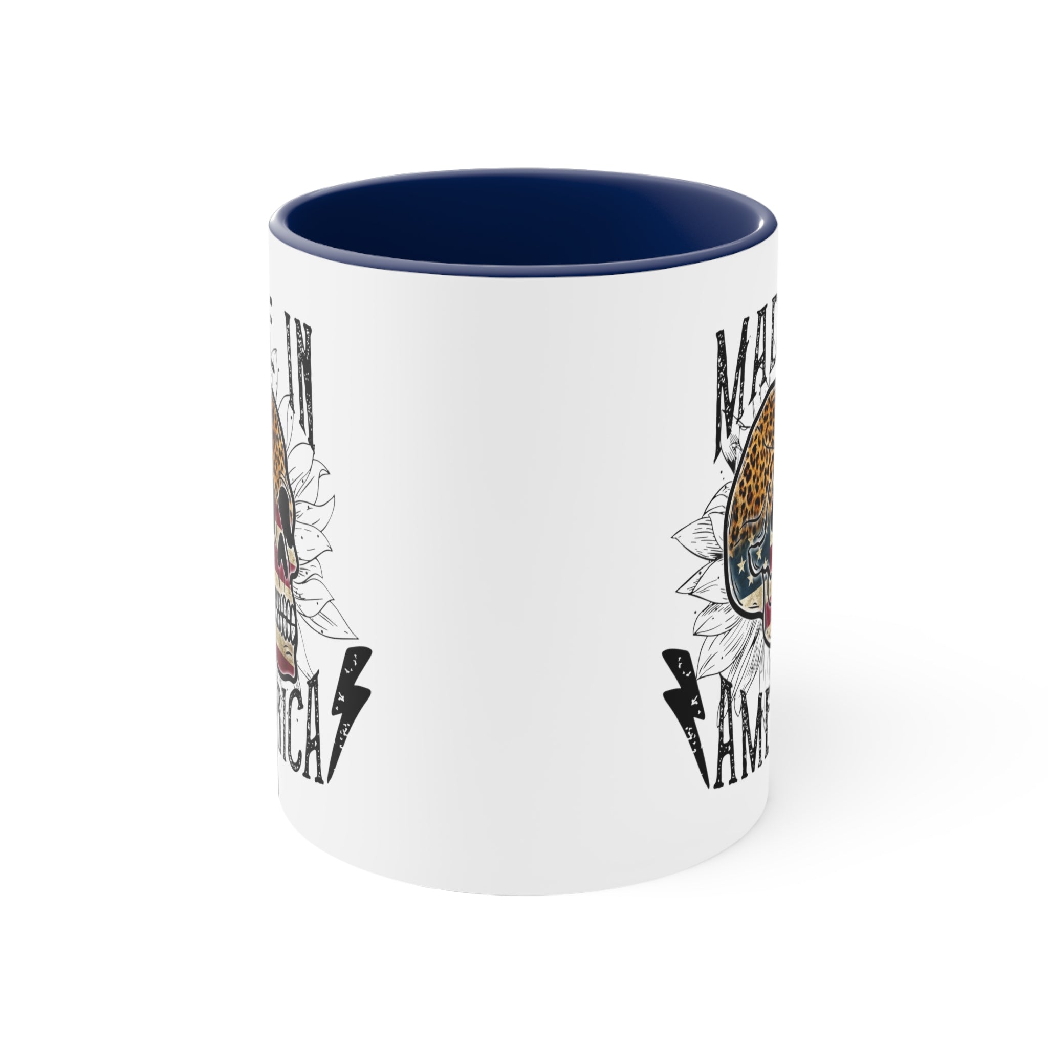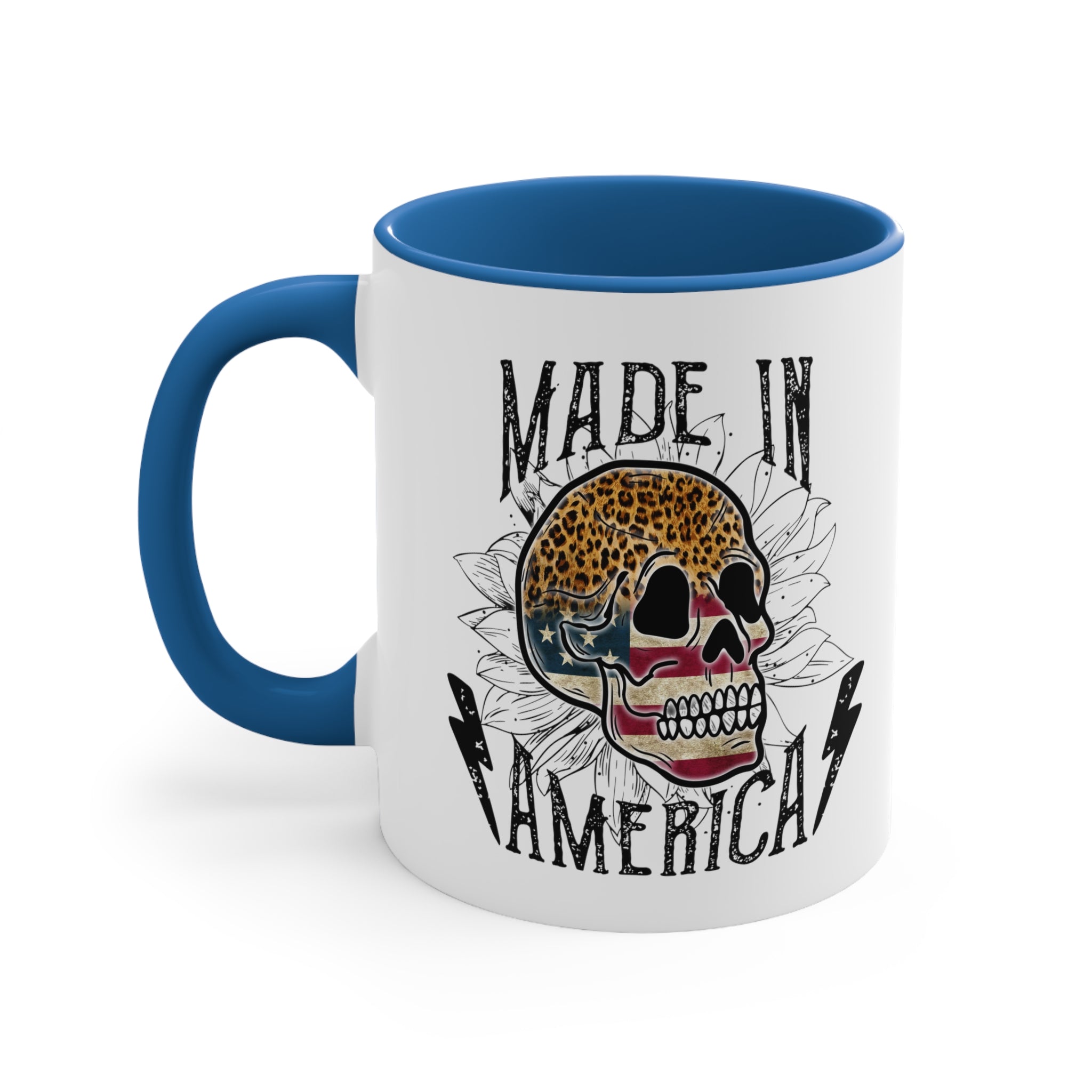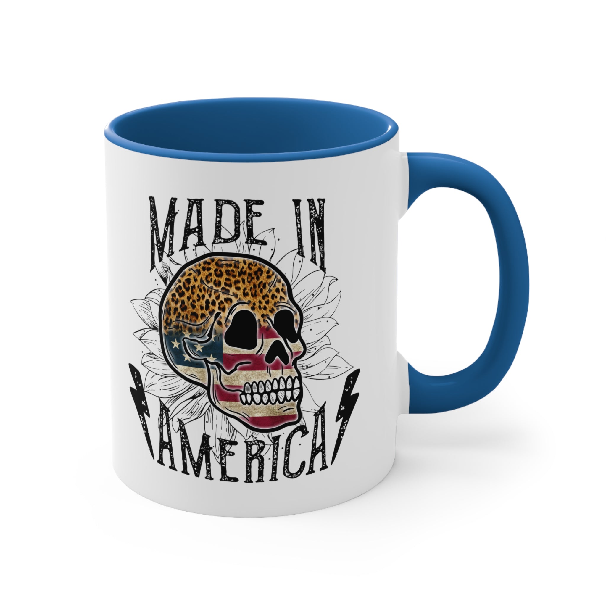 The mug features a two – tone design with a solid white ceramic exterior. The exterior showcases a detailed, vintage – inspired graphic design that combines a rugged and patriotic aesthetic. At the center is a stylized skull, with the top half in leopard print and the lower half in an American flag pattern of stars and stripes. Surrounding the skull are white floral (sunflower – like) outlines, adding a delicate touch to the bold design. The text “MADE IN AMERICA” is printed in bold, distressed, black typography, flanked by two black lightning bolts, giving it an edgy, tattoo – inspired look.