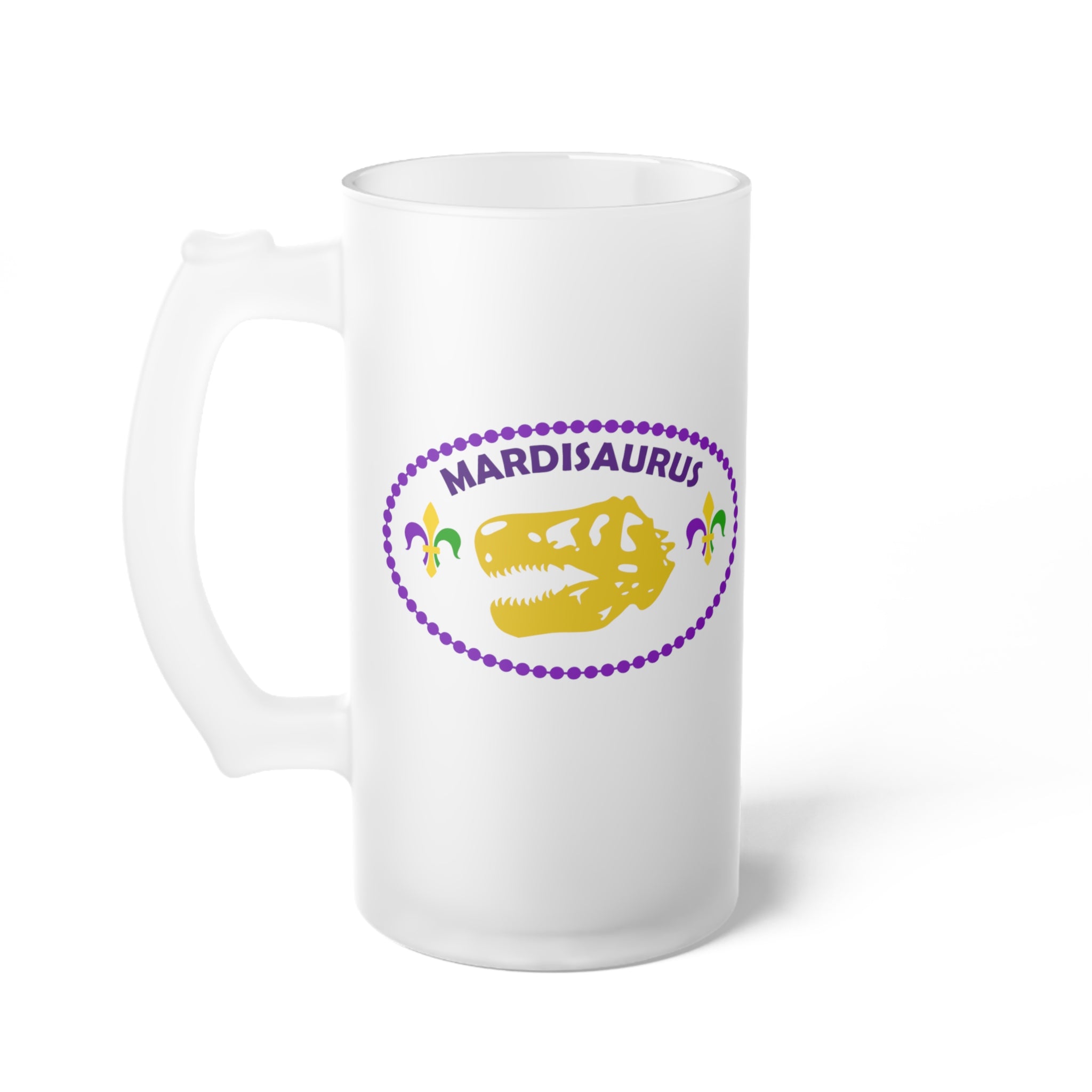 Introducing the Mardisaurus Frosted Glass Beer Mug, a unique and festive addition to your drinkware collection! This tall, slender mug, with its classic beer – stein shape, is designed for both hot and cold beverages, making it perfect for daily use at home or in the office, as well as for special occasions like Mardi Gras parties.