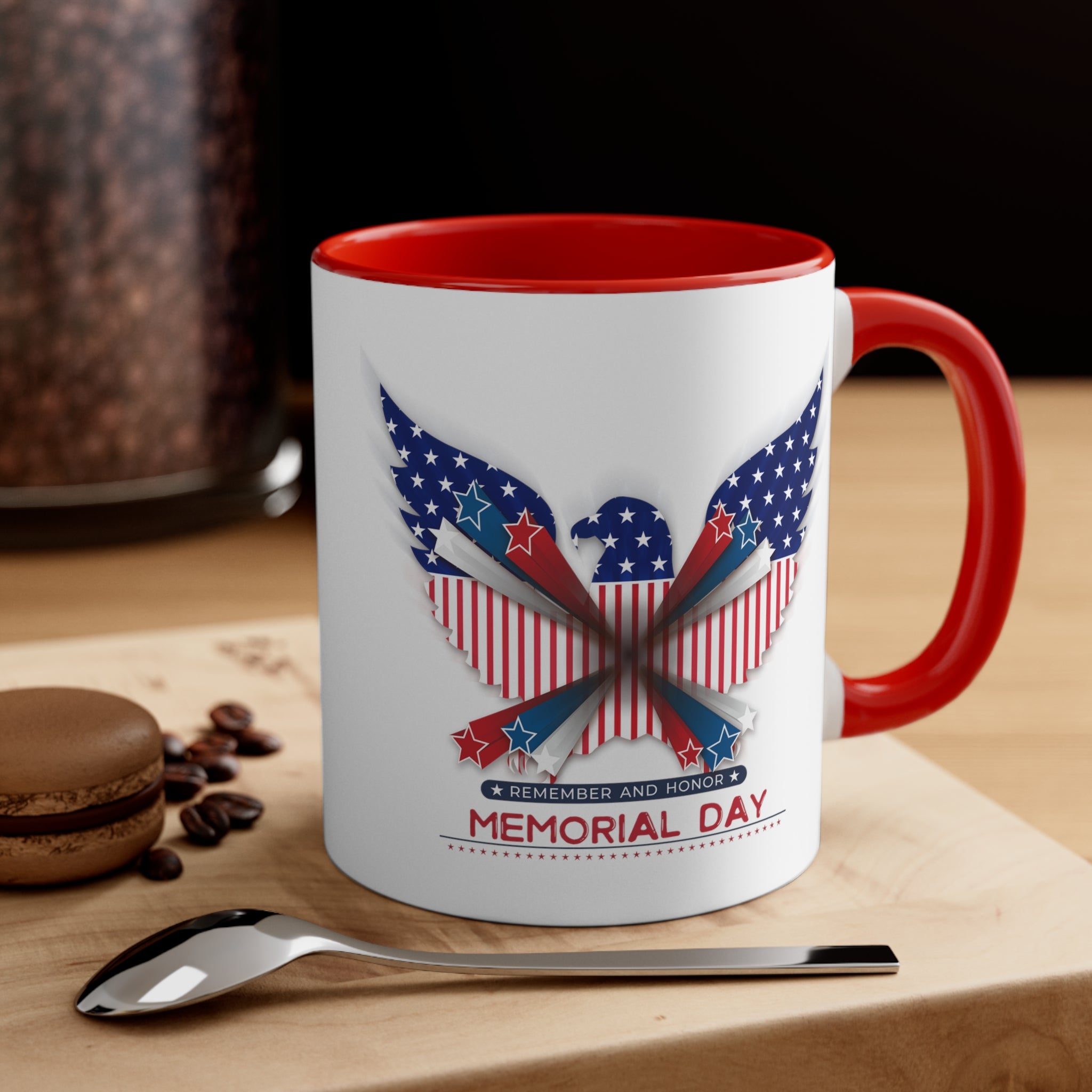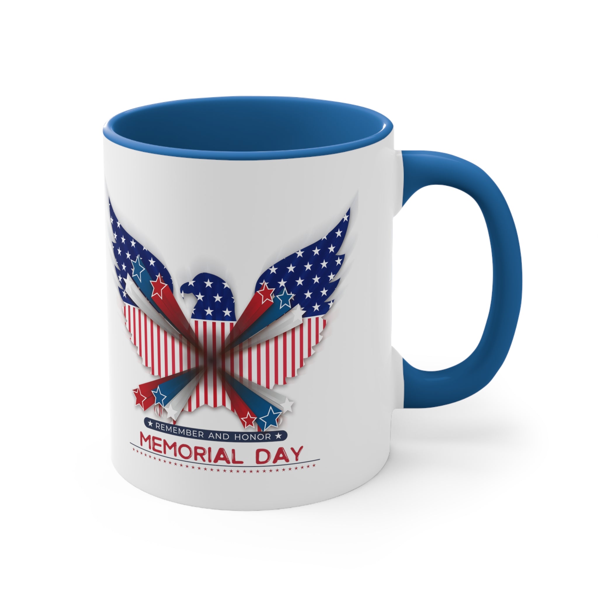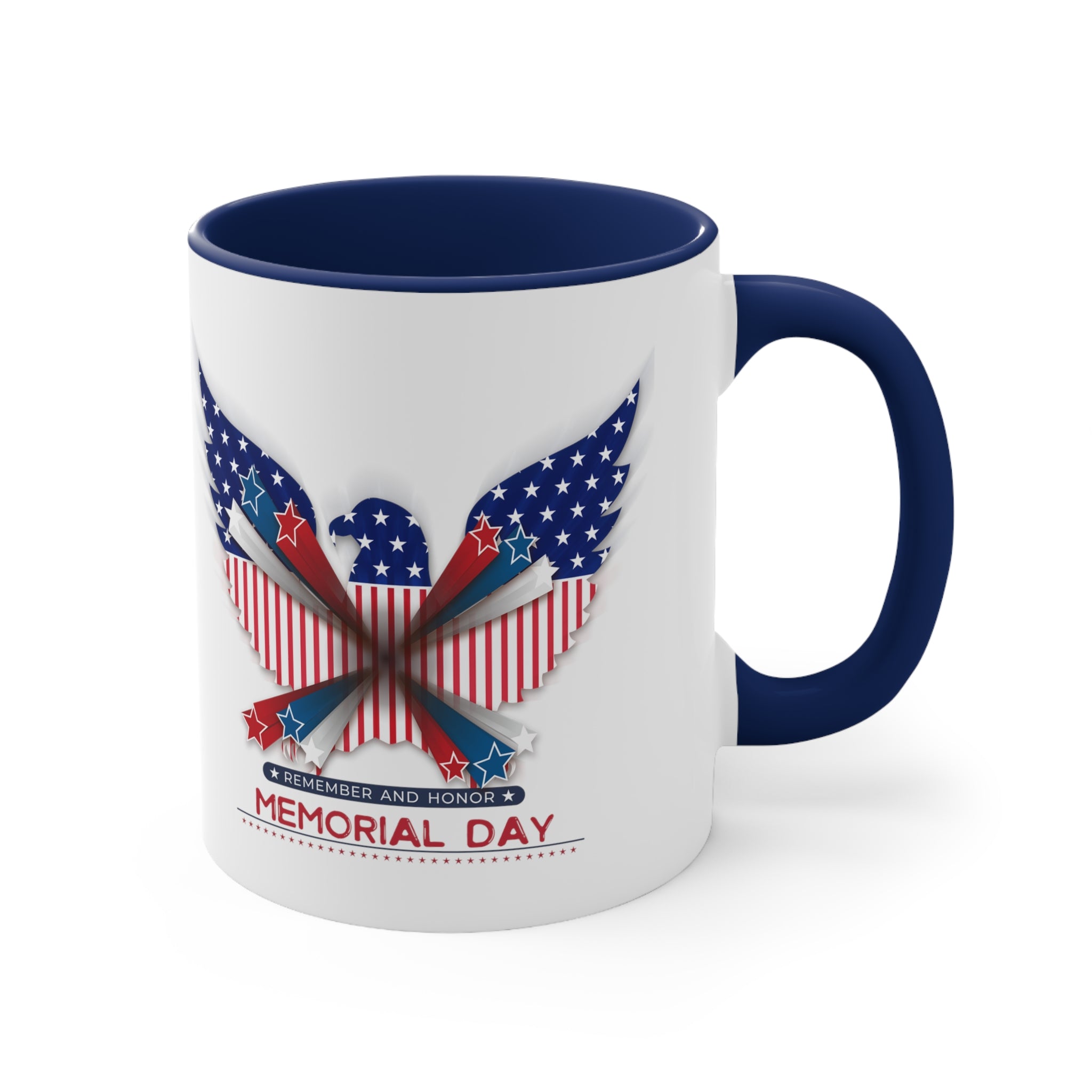 The centerpiece of the mug is a stylized 3D eagle crafted from American flag motifs. The eagle’s head and wings are a blue field adorned with white stars, representing the US flag field, while its body features red and white stripes, symbolizing the US flag stripes. Additional decorative elements, such as red, blue, and white stars and stripes radiating from the eagle, further enhance the patriotic 3D effect. Complementing the eagle design are two banners of text: a smaller blue banner with stars that reads “REMEMBER AND HONOR,” and a larger red text below it that says “MEMORIAL DAY,” bordered by a star pattern.
