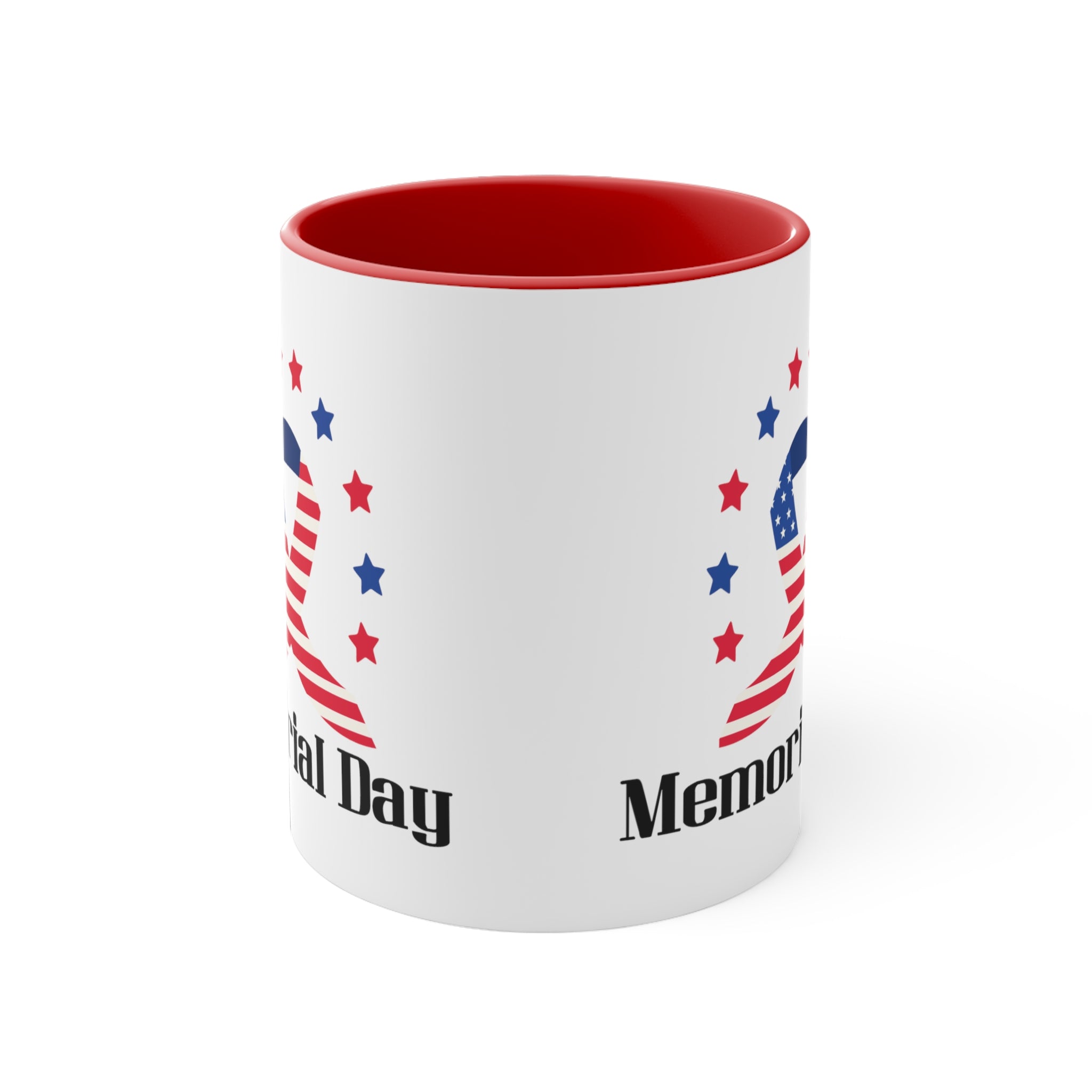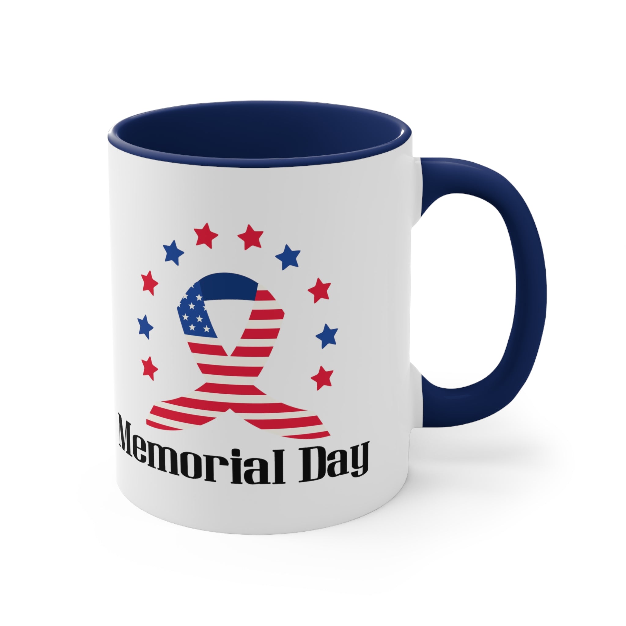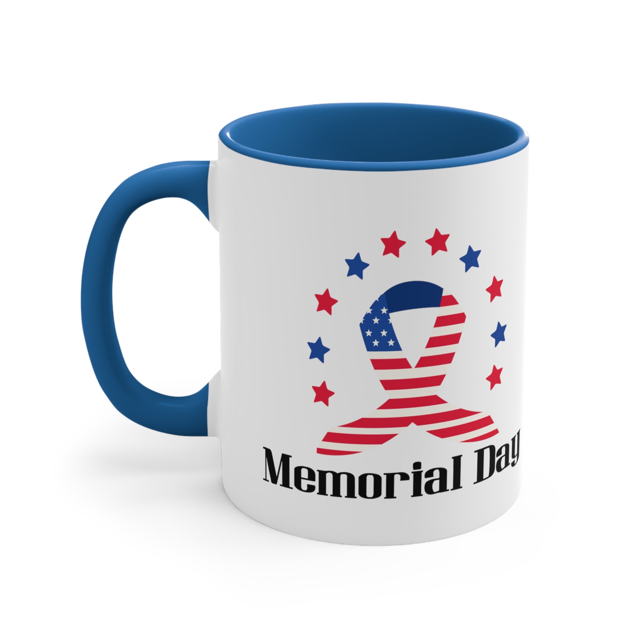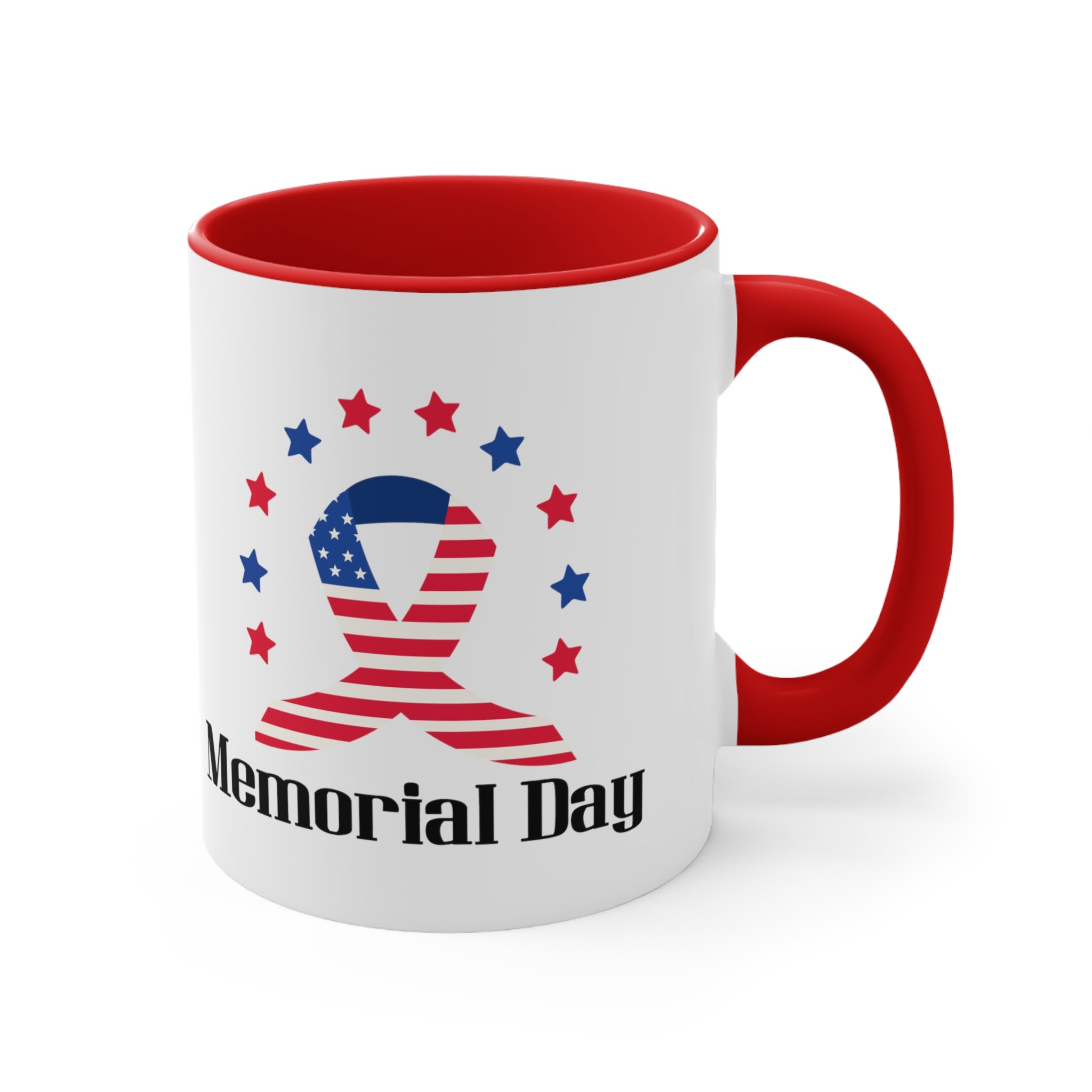 The mug features a two – tone construction, with a white exterior and a choice of red or blue interior and handle, separated by a clean white border. The exterior showcases a stunning American flag–themed ribbon, combining red and white stripes with a blue field of white stars. Surrounding the ribbon are alternating red and blue stars, creating a patriotic “halo” effect. Below the ribbon, bold black text reads “Memorial Day,” making it a clear and powerful symbol of the occasion.