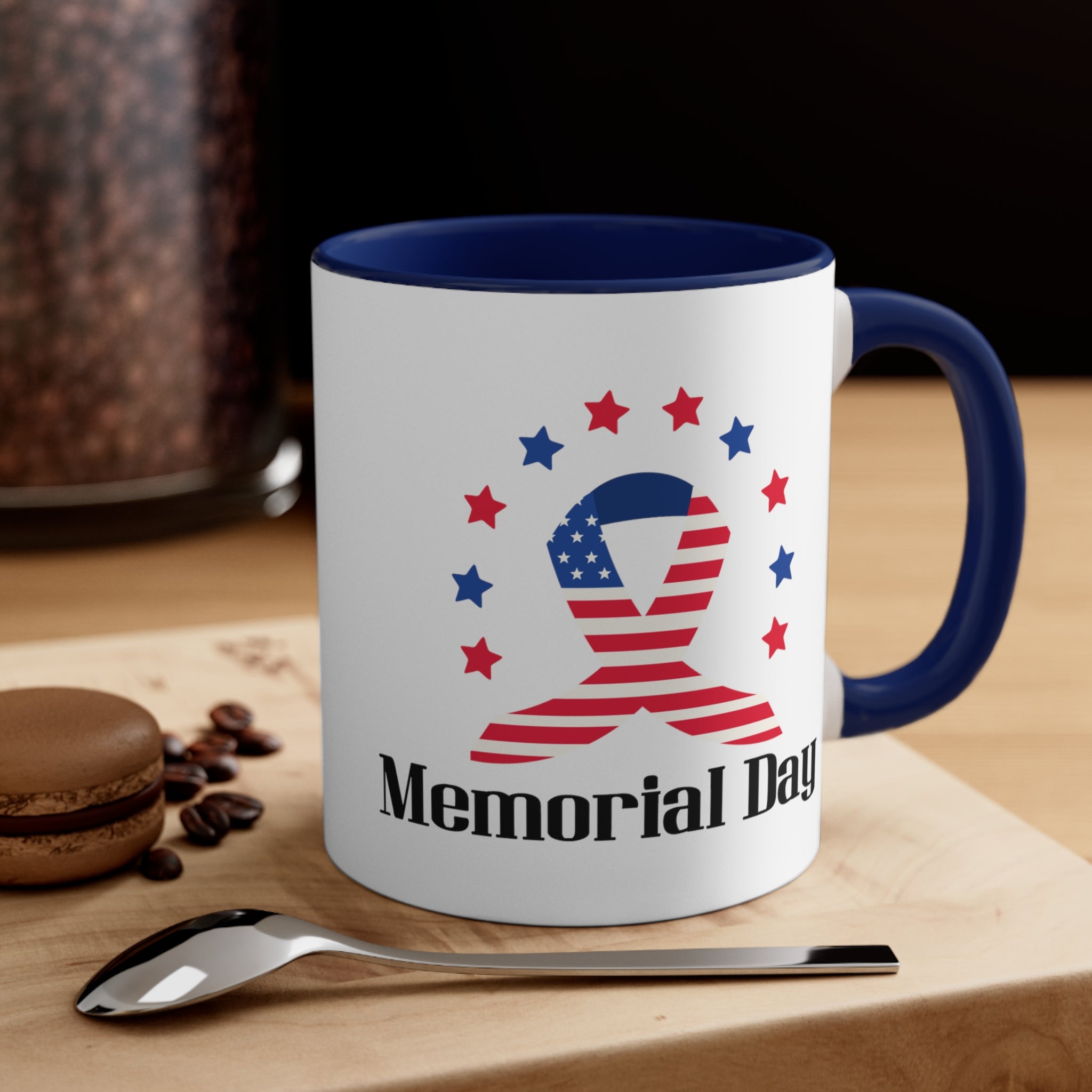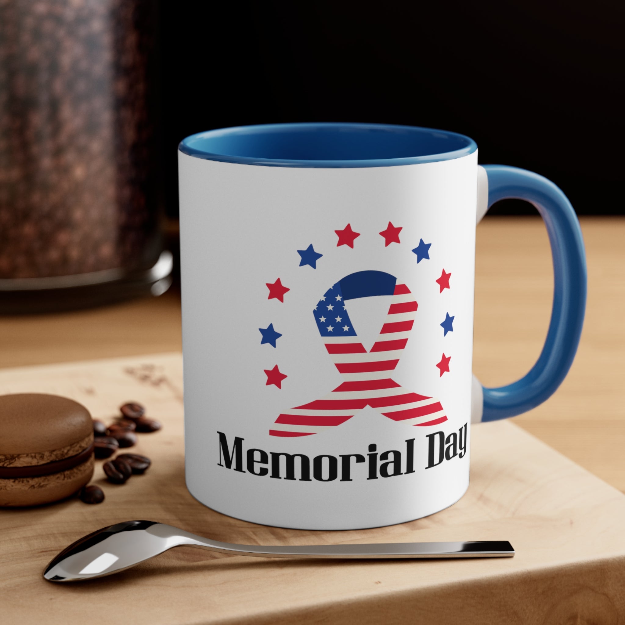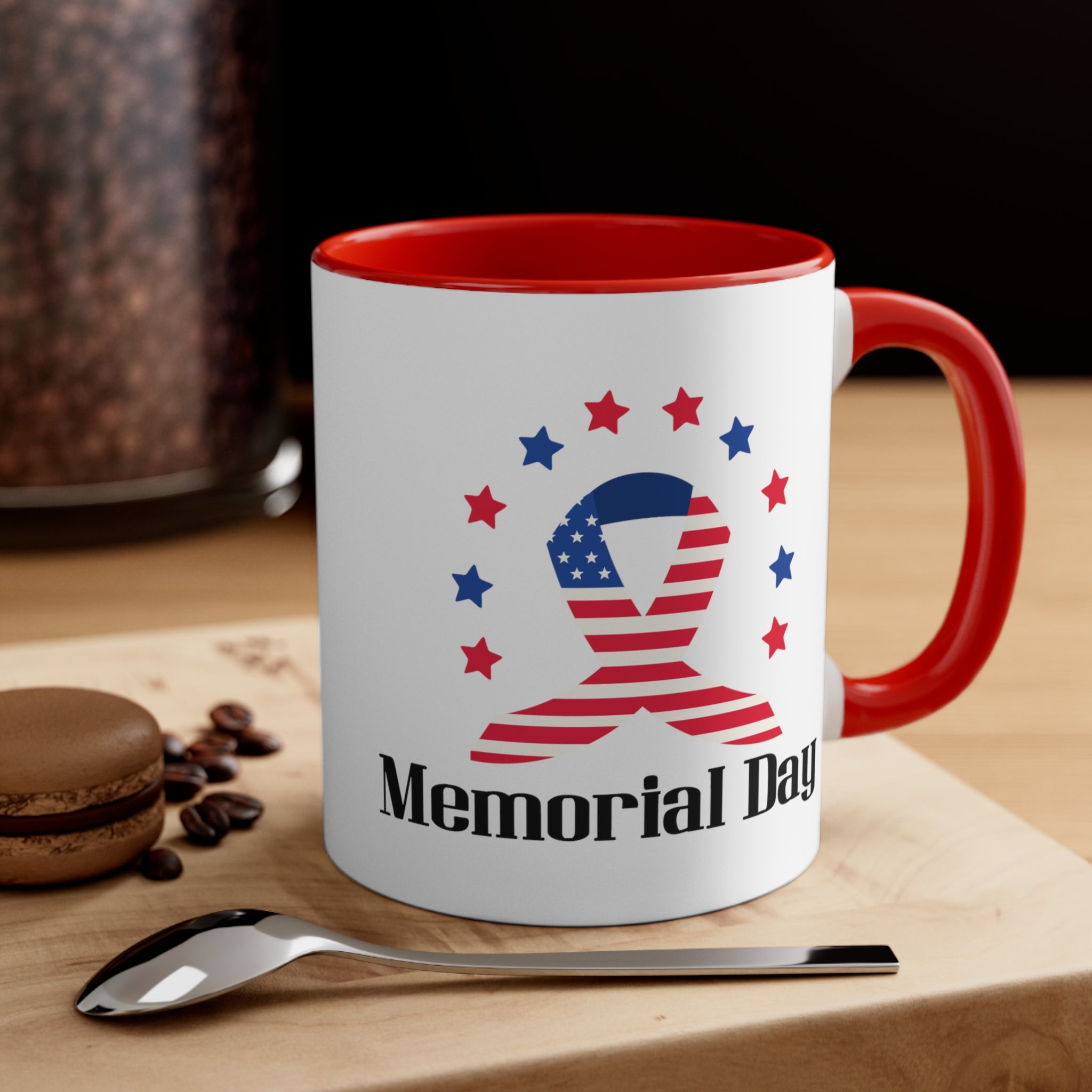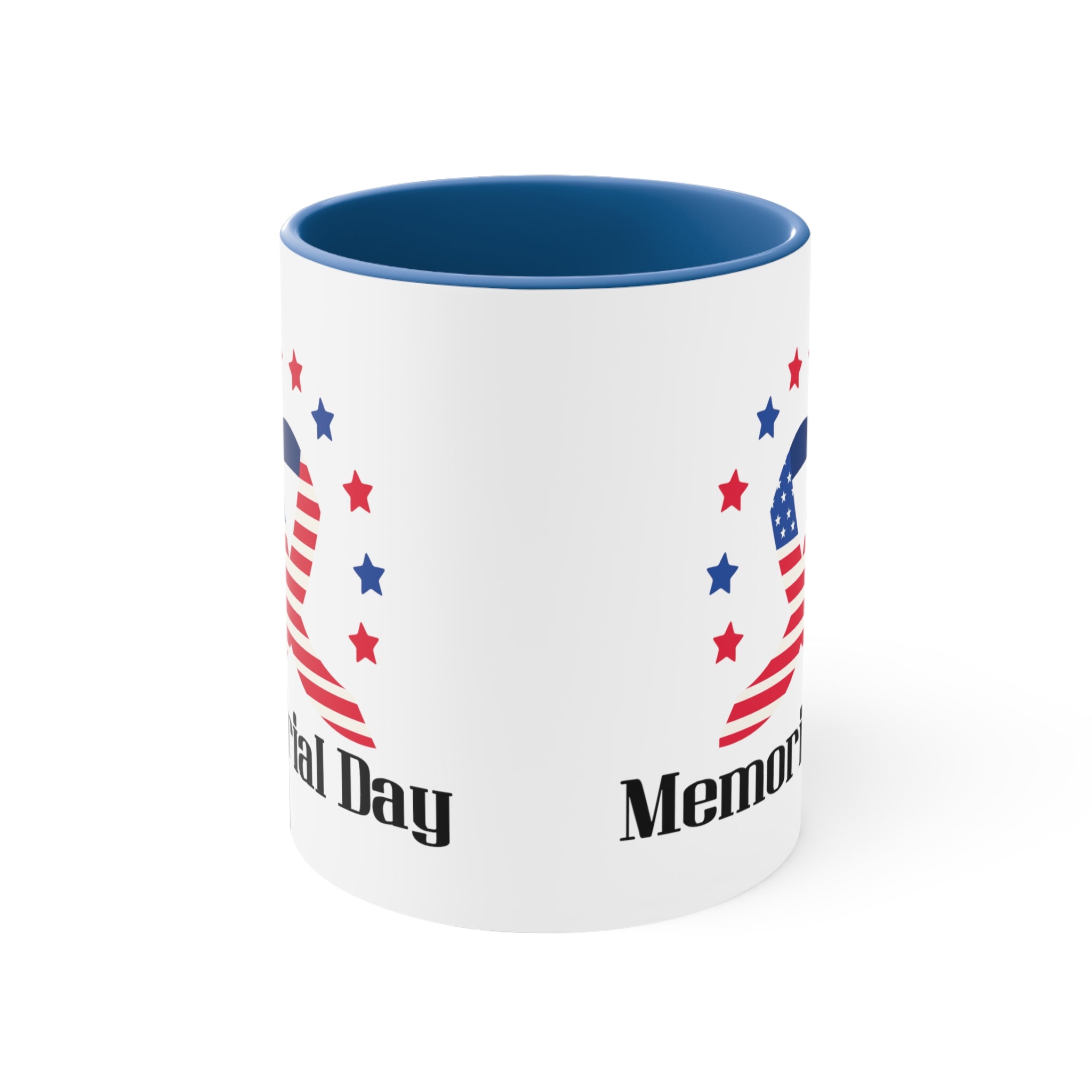 The mug features a two – tone construction, with a white exterior and a choice of red or blue interior and handle, separated by a clean white border. The exterior showcases a stunning American flag–themed ribbon, combining red and white stripes with a blue field of white stars. Surrounding the ribbon are alternating red and blue stars, creating a patriotic “halo” effect. Below the ribbon, bold black text reads “Memorial Day,” making it a clear and powerful symbol of the occasion.