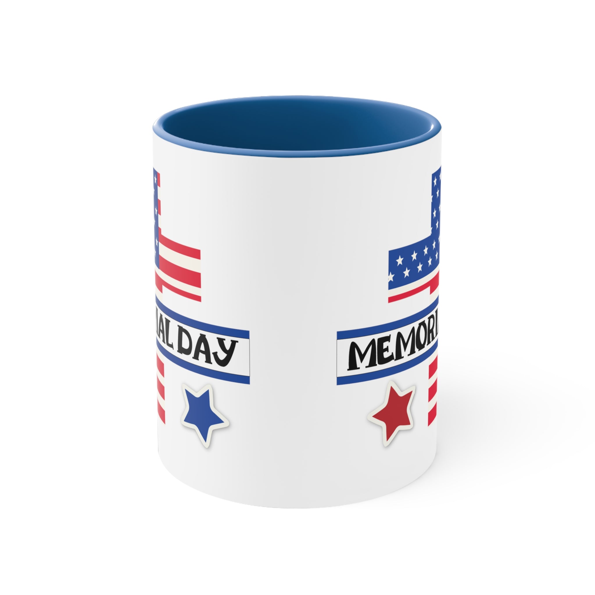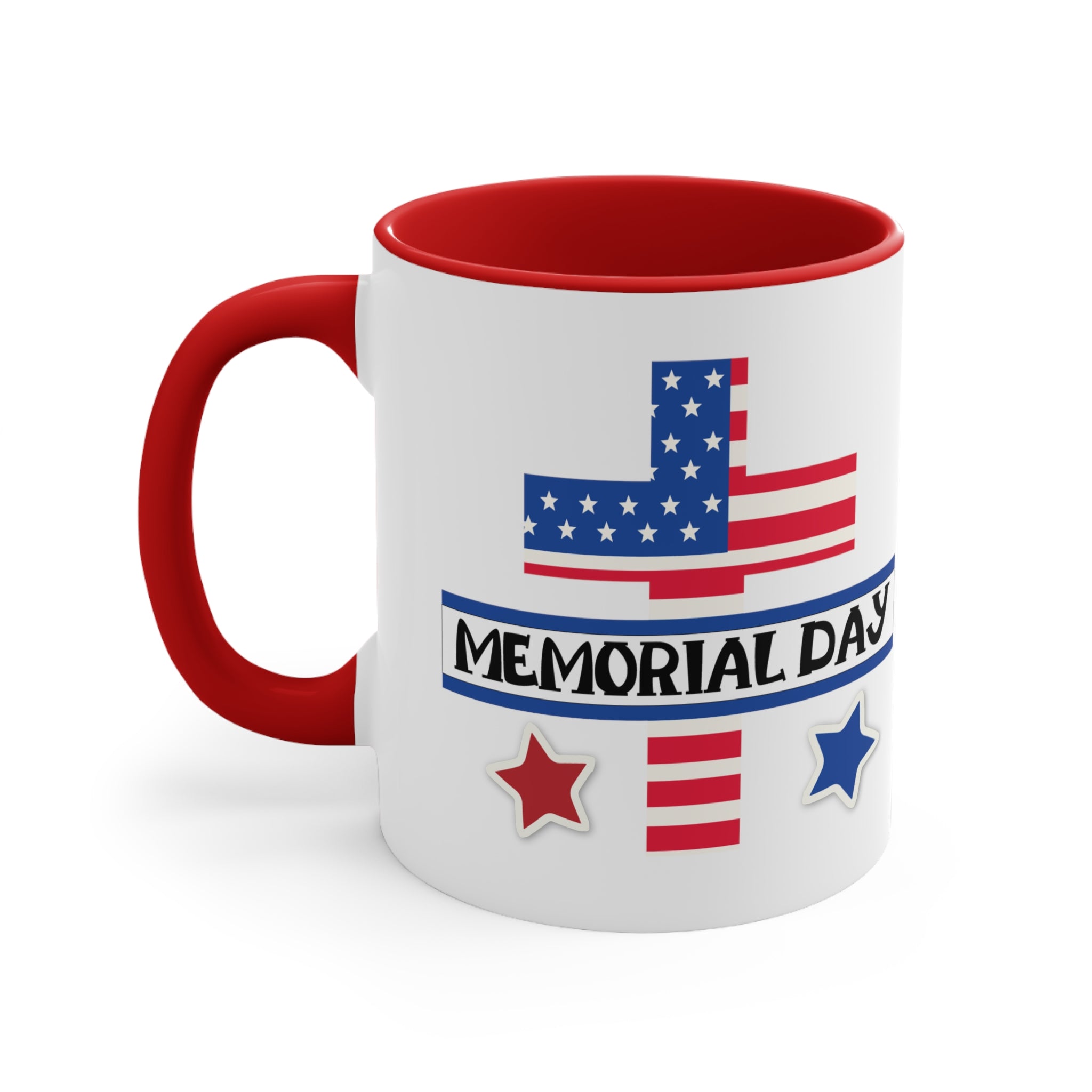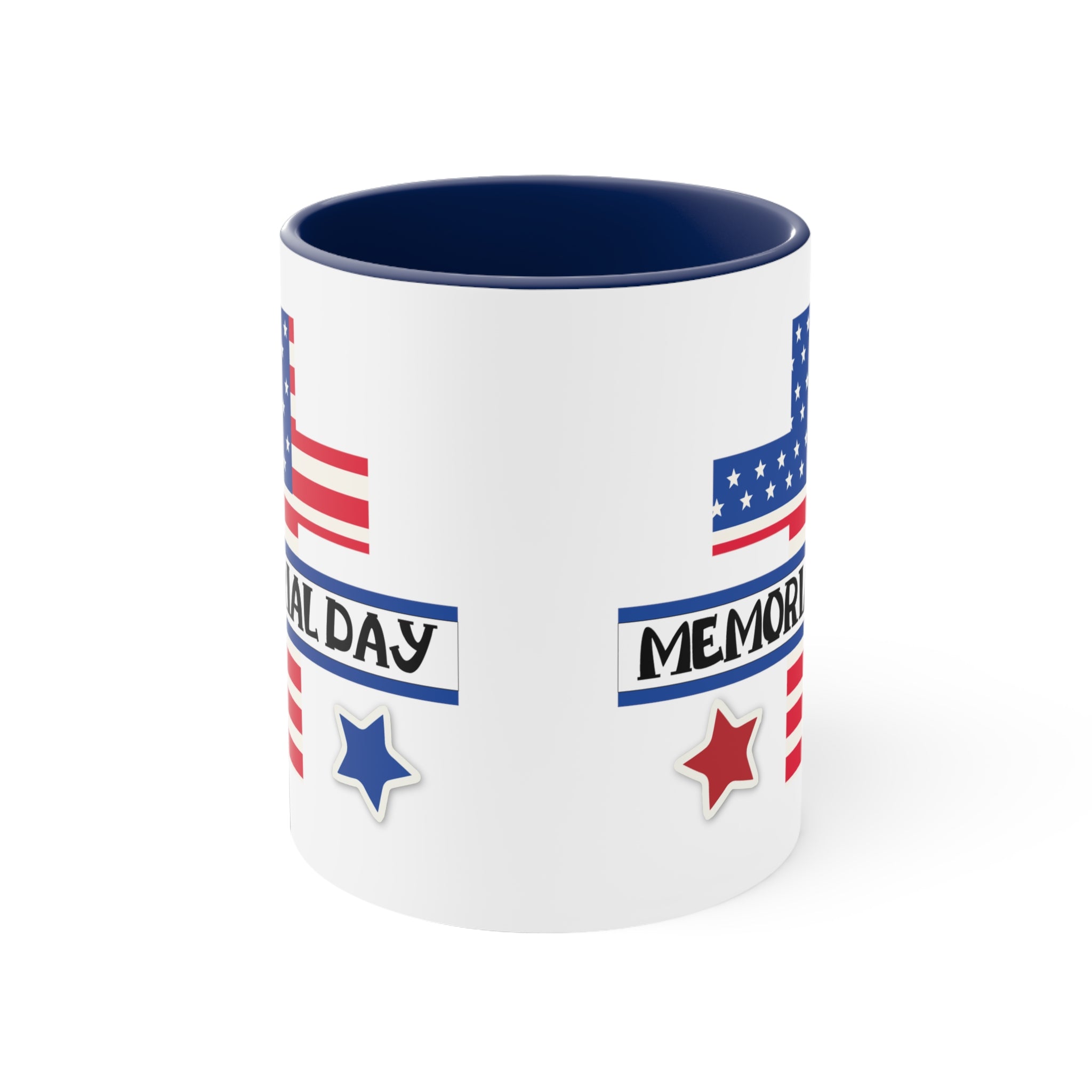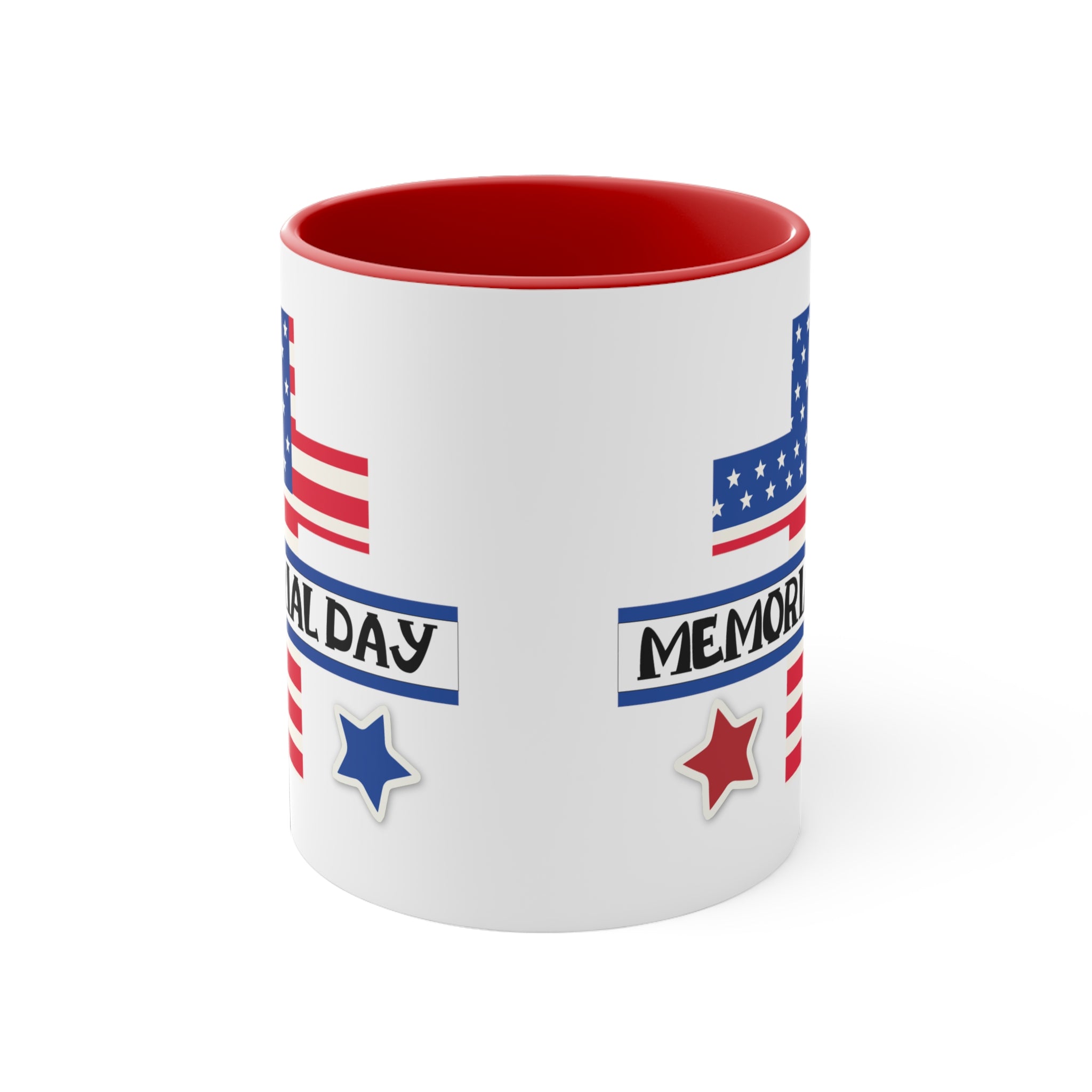 The mug is crafted from high – quality ceramic with a smooth, glossy glazed finish. The main body of the mug is white, while the handle and interior rim come in two vibrant color options – blue (navy or royal) or red, adding a beautiful two – tone contrast. The decorative print on the mug features a stylized cross incorporating the U.S. flag, with 13 red stripes and 50 white stars, symbolizing remembrance. Bold black lettering spelling “MEMORIAL DAY” is centered below the flag cross, and two star shapes (one red, one blue) with white outlines are positioned below the text, adding a playful yet meaningful touch.