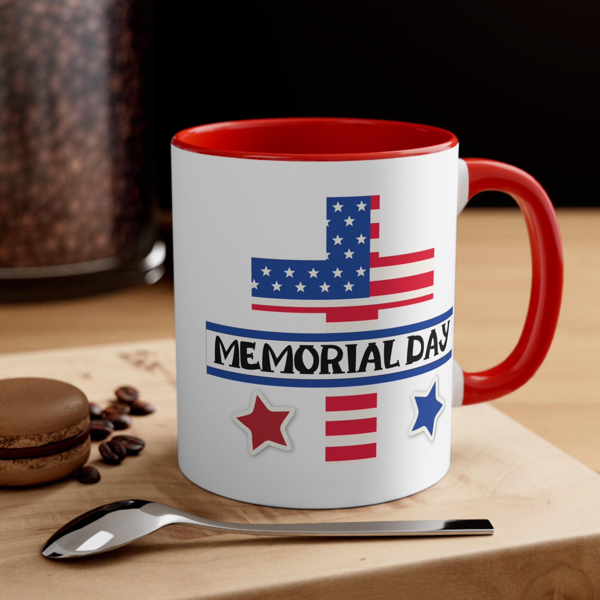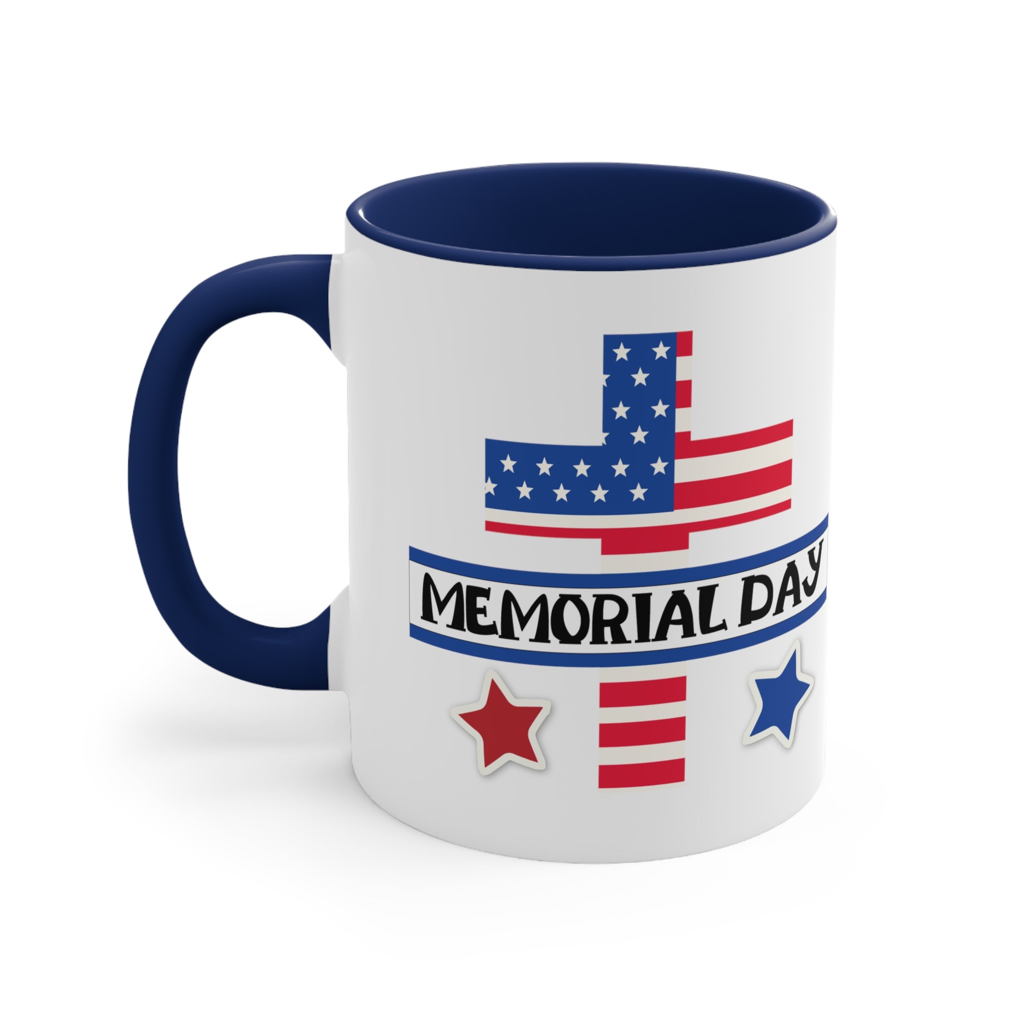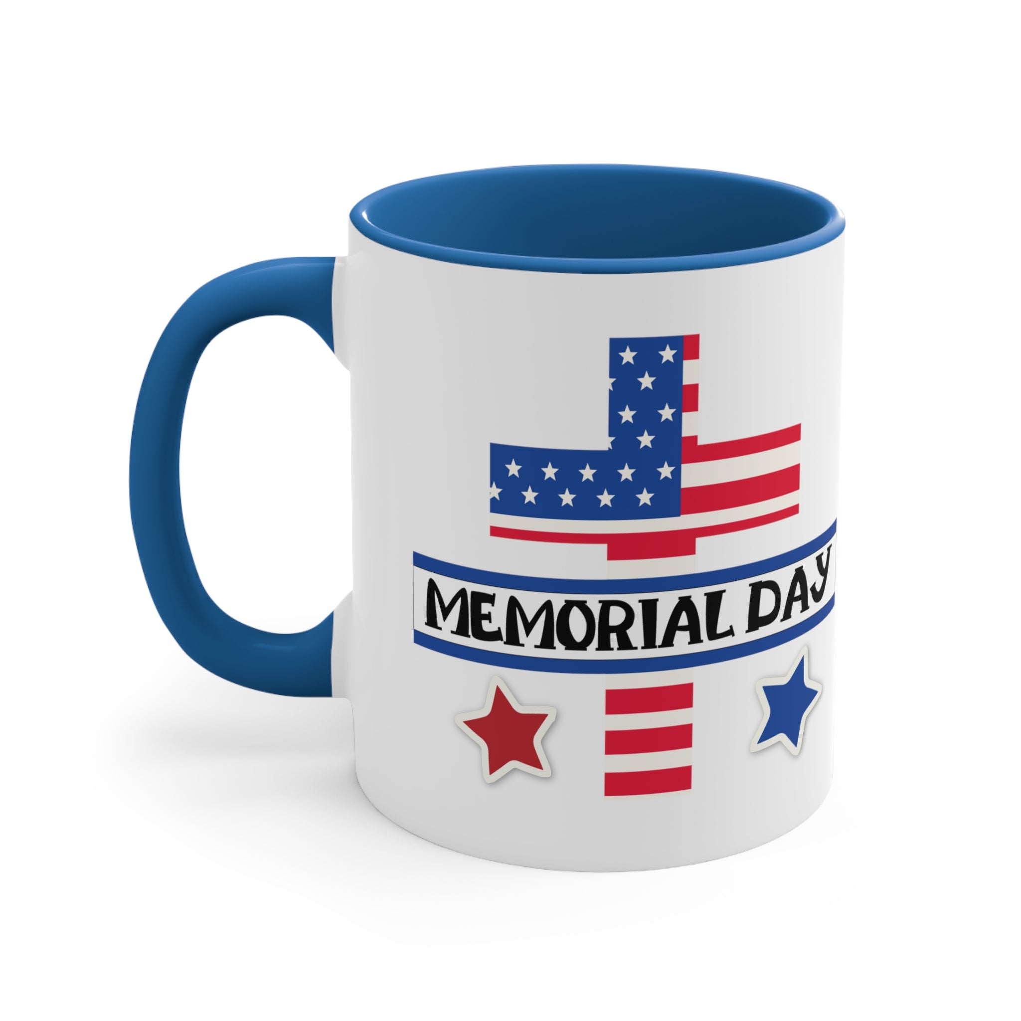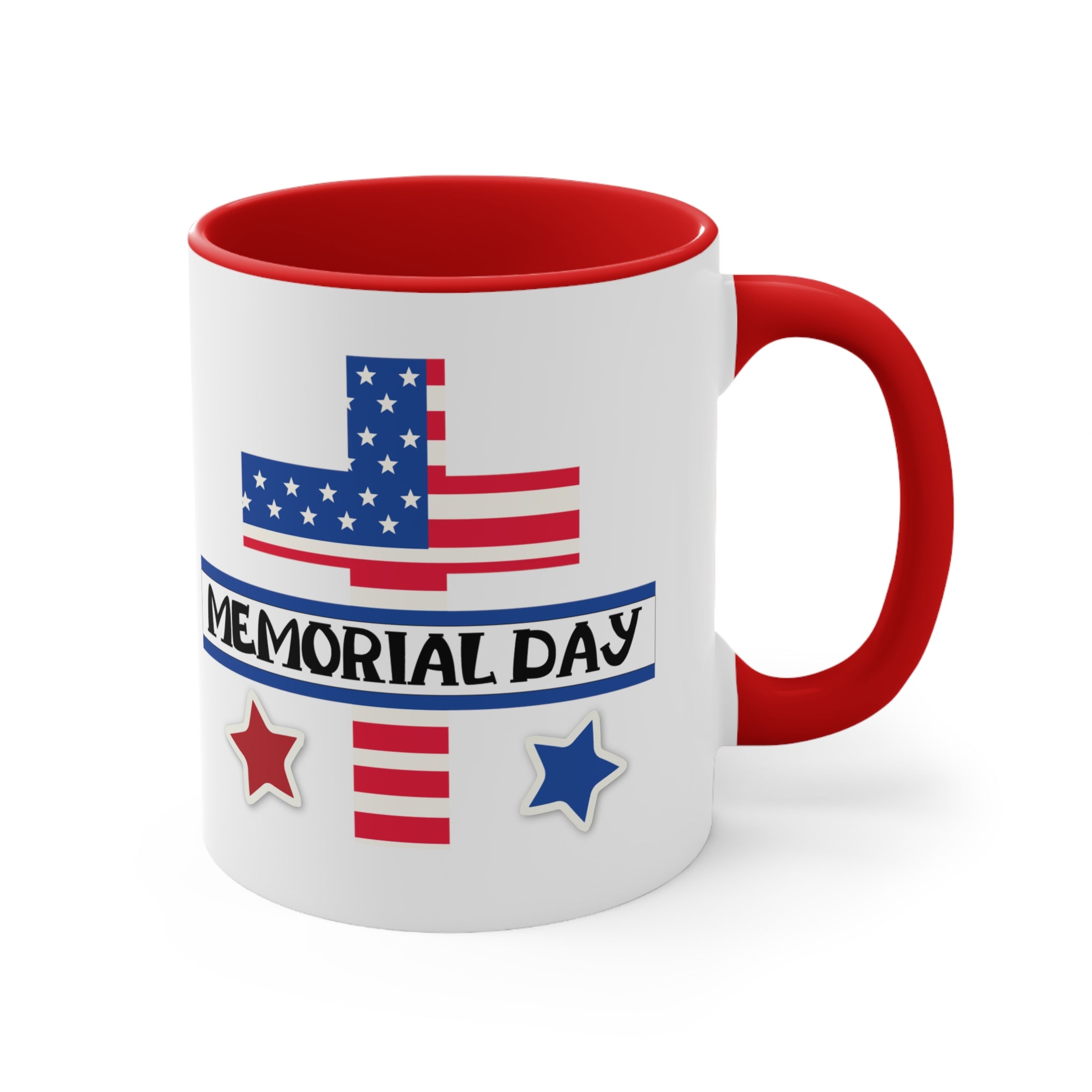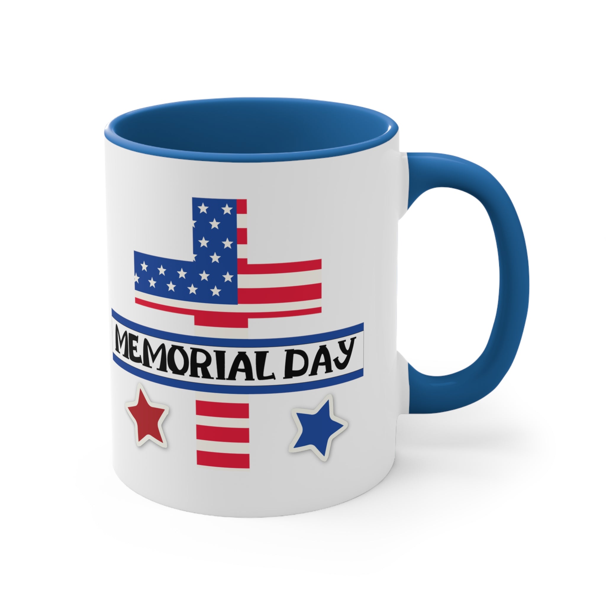 The mug is crafted from high – quality ceramic with a smooth, glossy glazed finish. The main body of the mug is white, while the handle and interior rim come in two vibrant color options – blue (navy or royal) or red, adding a beautiful two – tone contrast. The decorative print on the mug features a stylized cross incorporating the U.S. flag, with 13 red stripes and 50 white stars, symbolizing remembrance. Bold black lettering spelling “MEMORIAL DAY” is centered below the flag cross, and two star shapes (one red, one blue) with white outlines are positioned below the text, adding a playful yet meaningful touch.