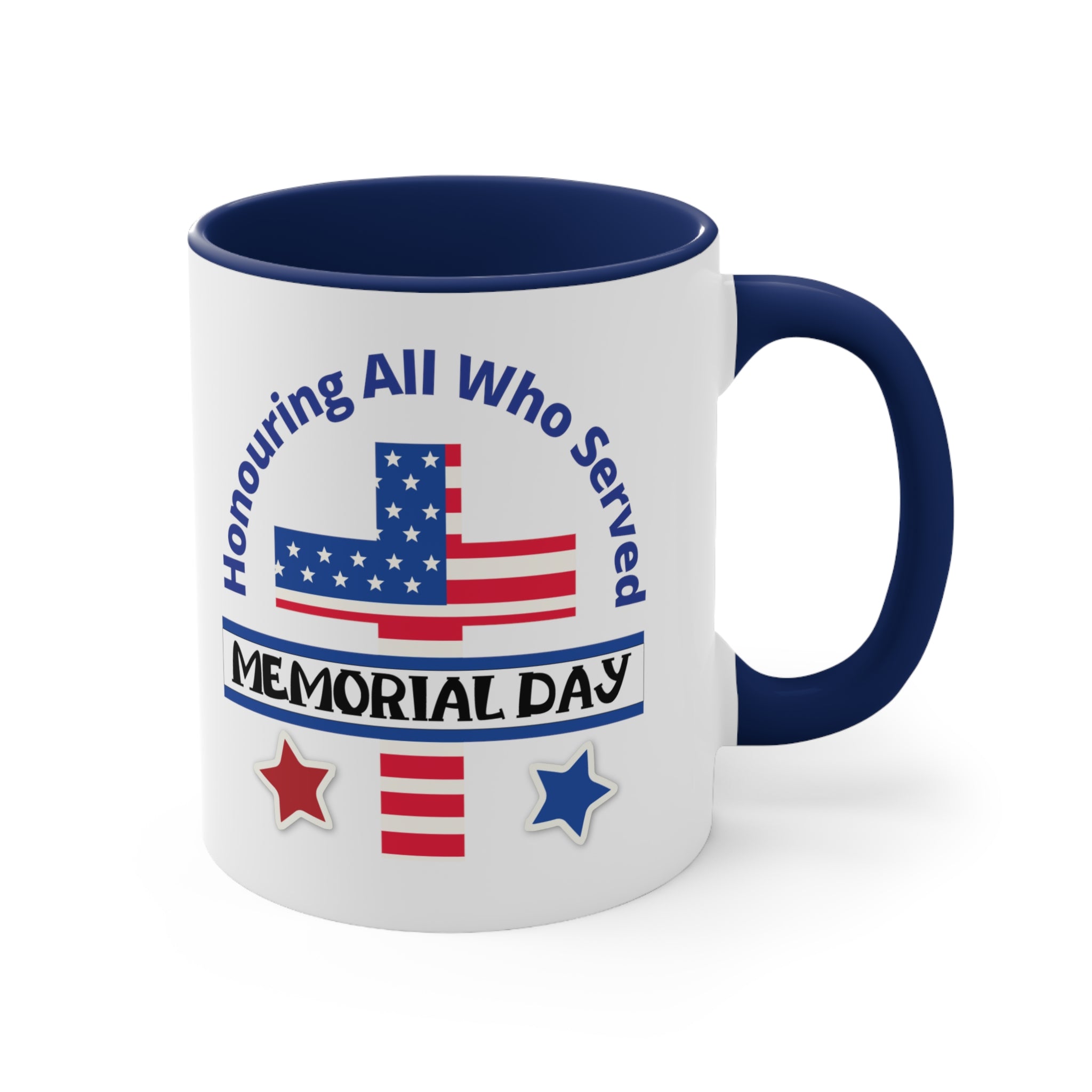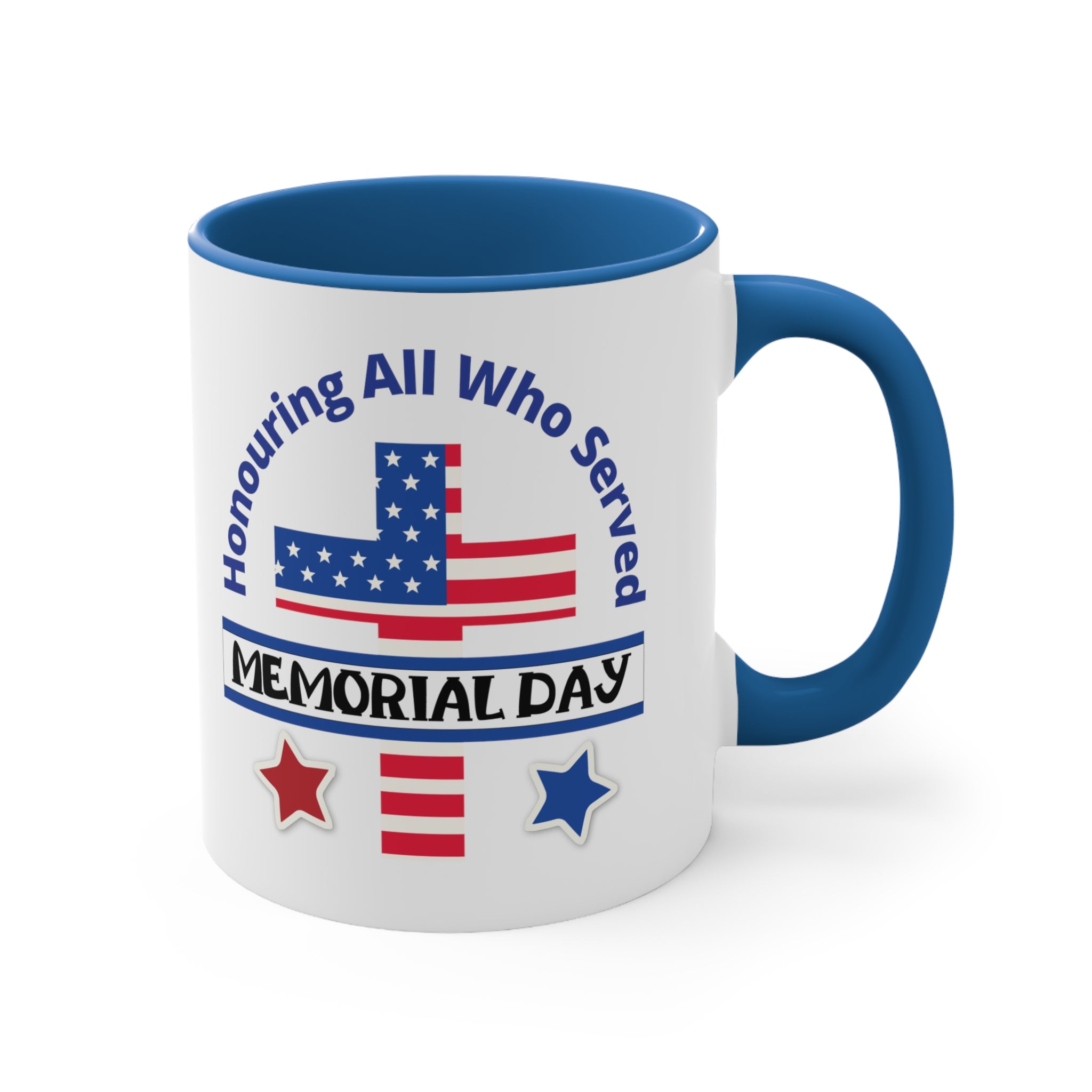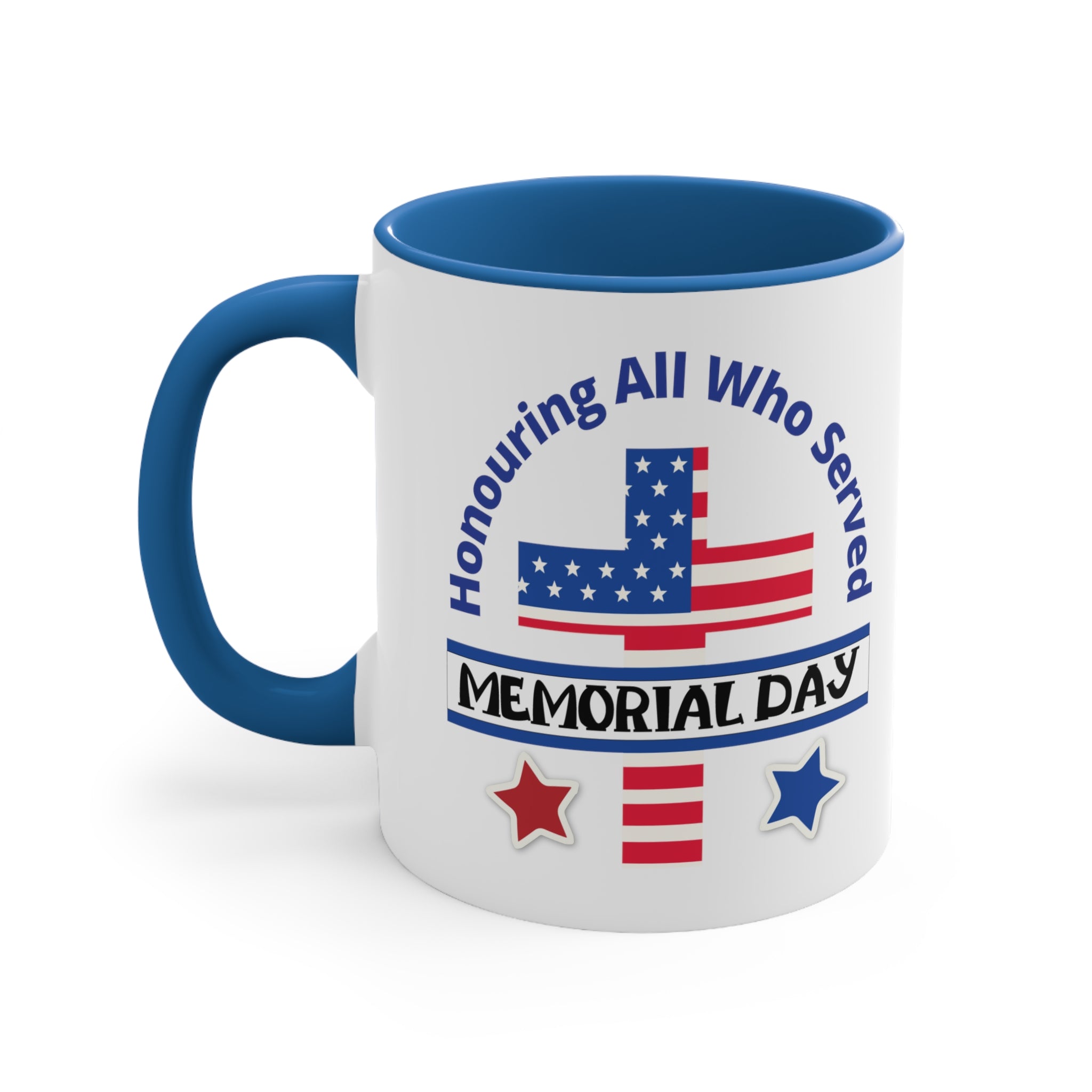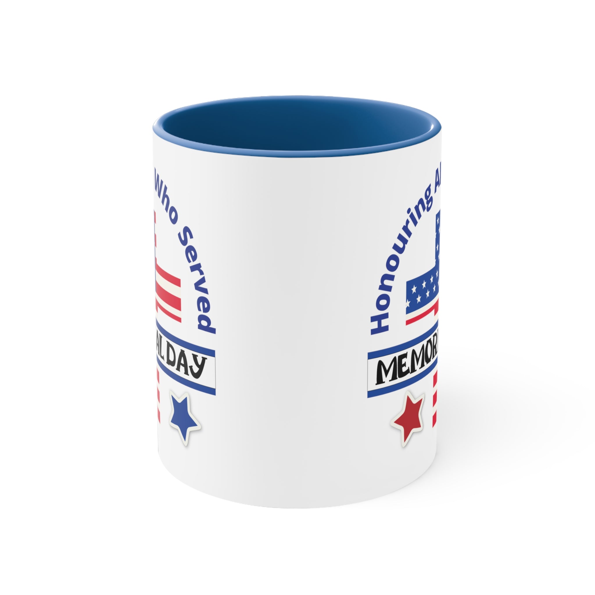 The exterior of the mug is crafted from white ceramic with a glossy finish, giving it a smooth and polished look. The interior and handle come in a choice of blue, navy, or red, creating a striking dual – tone effect that adds visual appeal. The printed design on the front is a high – resolution, vibrant display of patriotic imagery and text. It features a stylized American flag, with a blue field of white stars and red stripes, along with curved blue text that reads “Honouring All Who Served” and a black “MEMORIAL DAY” banner. Red and blue stars with white outlines complete the design, emphasizing the remembrance of military service.