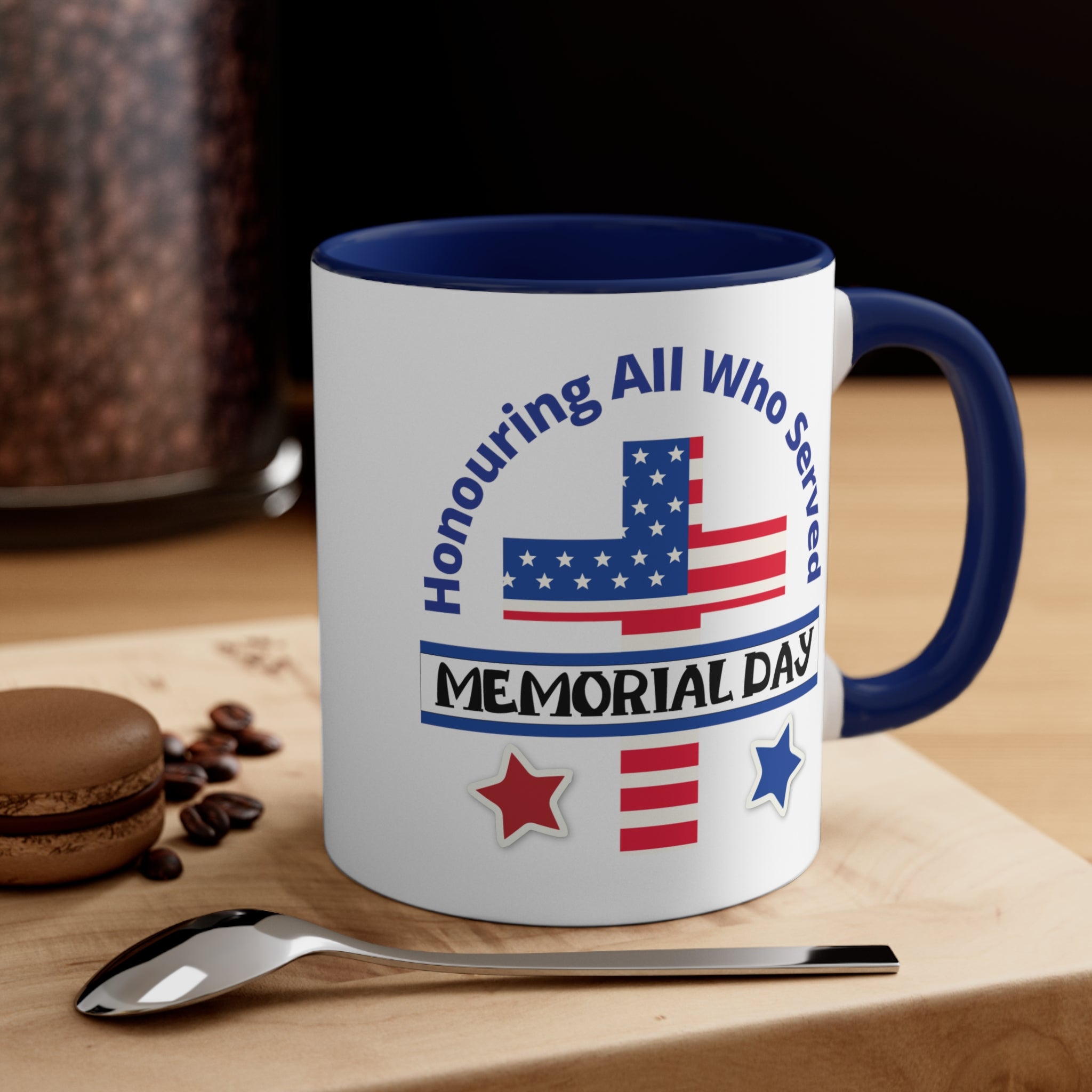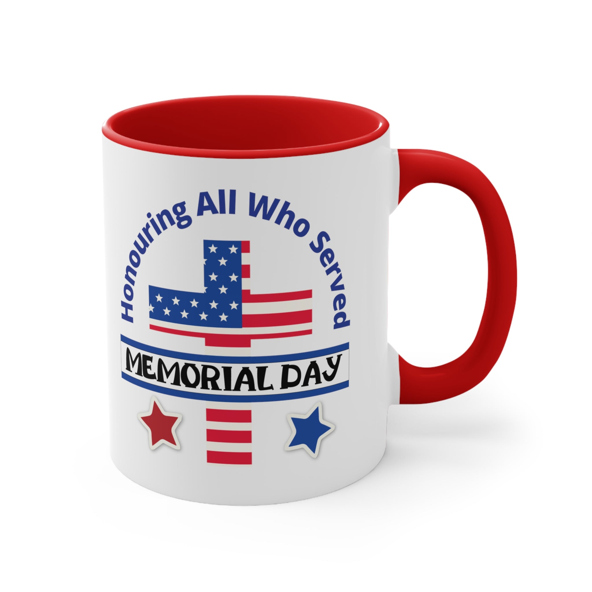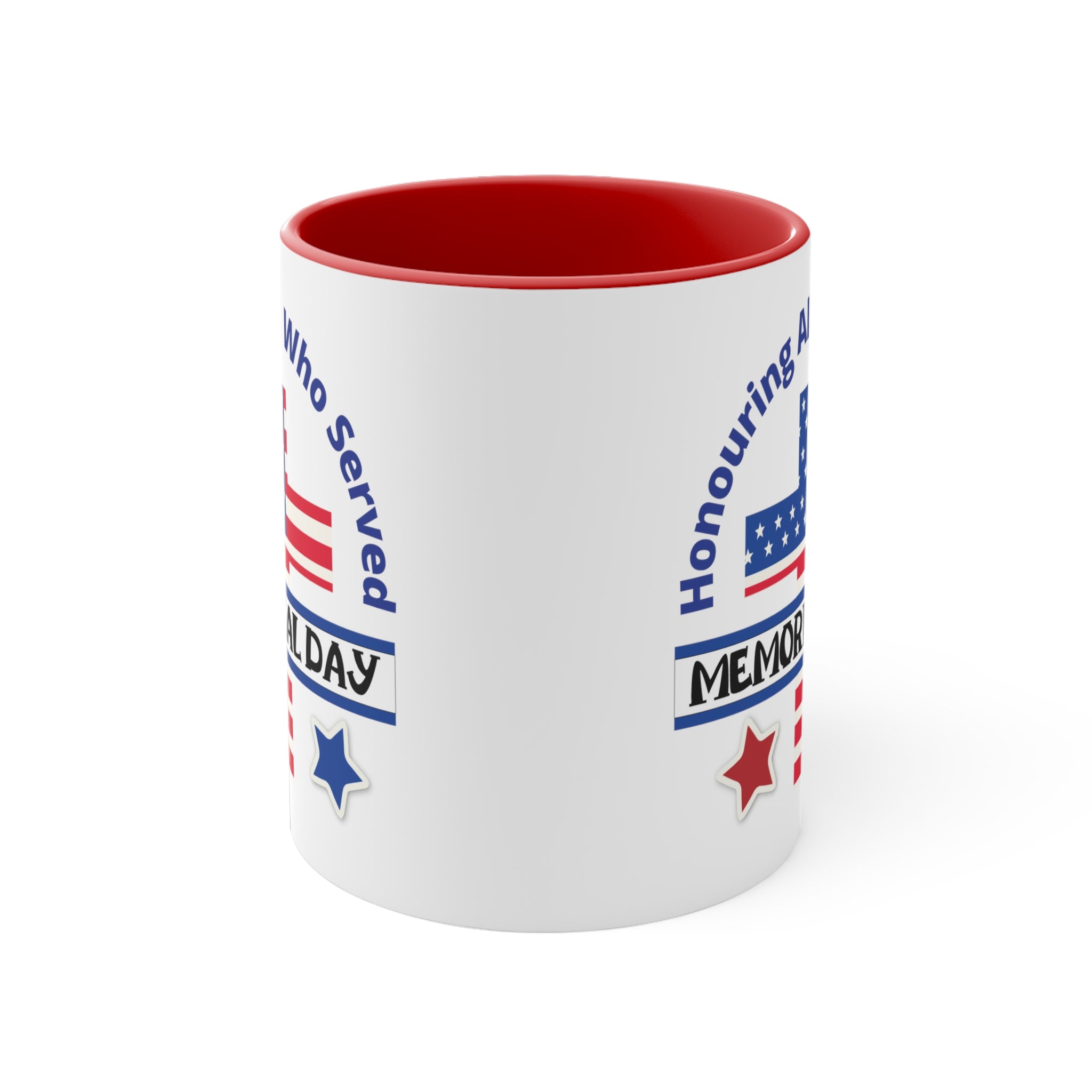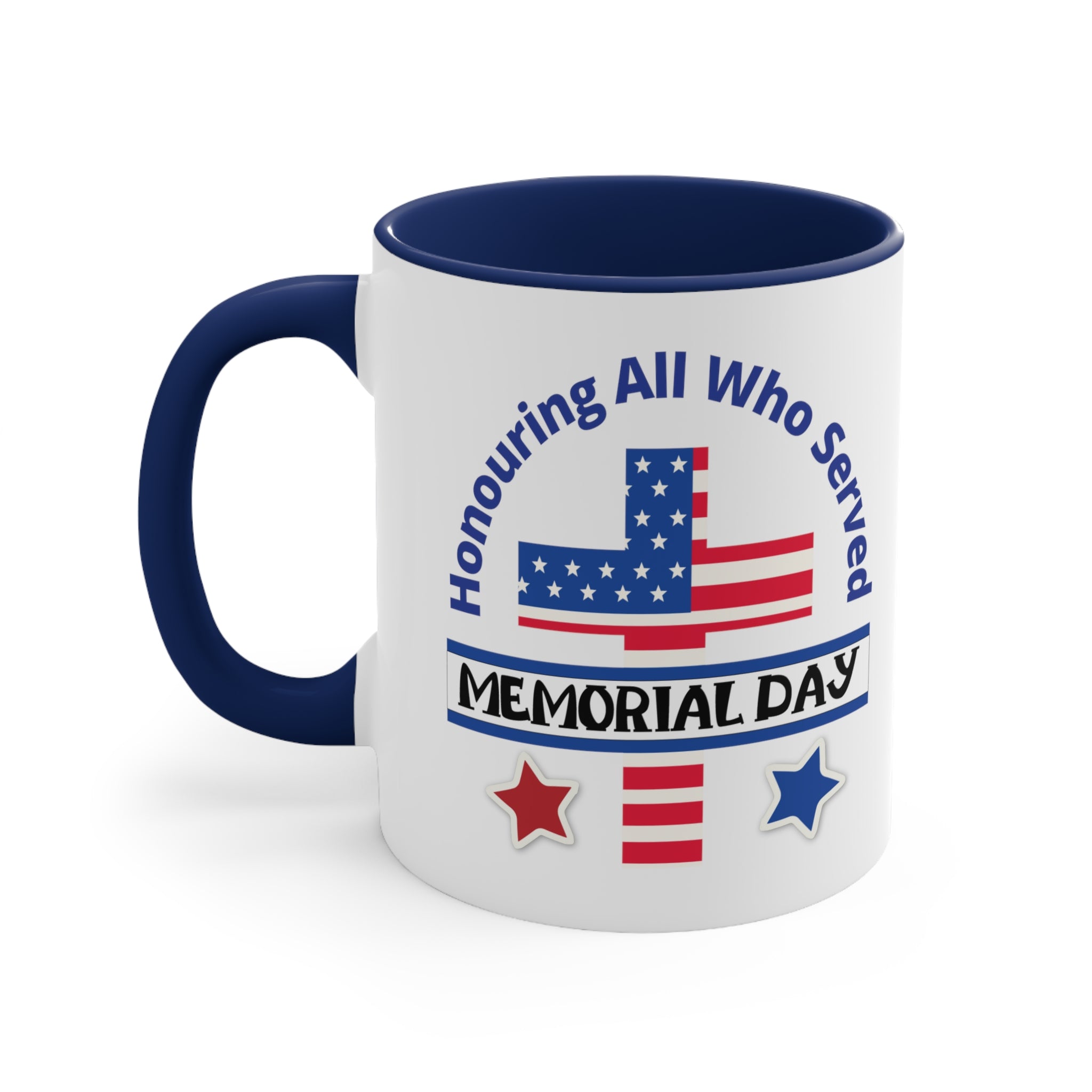 The exterior of the mug is crafted from white ceramic with a glossy finish, giving it a smooth and polished look. The interior and handle come in a choice of blue, navy, or red, creating a striking dual – tone effect that adds visual appeal. The printed design on the front is a high – resolution, vibrant display of patriotic imagery and text. It features a stylized American flag, with a blue field of white stars and red stripes, along with curved blue text that reads “Honouring All Who Served” and a black “MEMORIAL DAY” banner. Red and blue stars with white outlines complete the design, emphasizing the remembrance of military service.