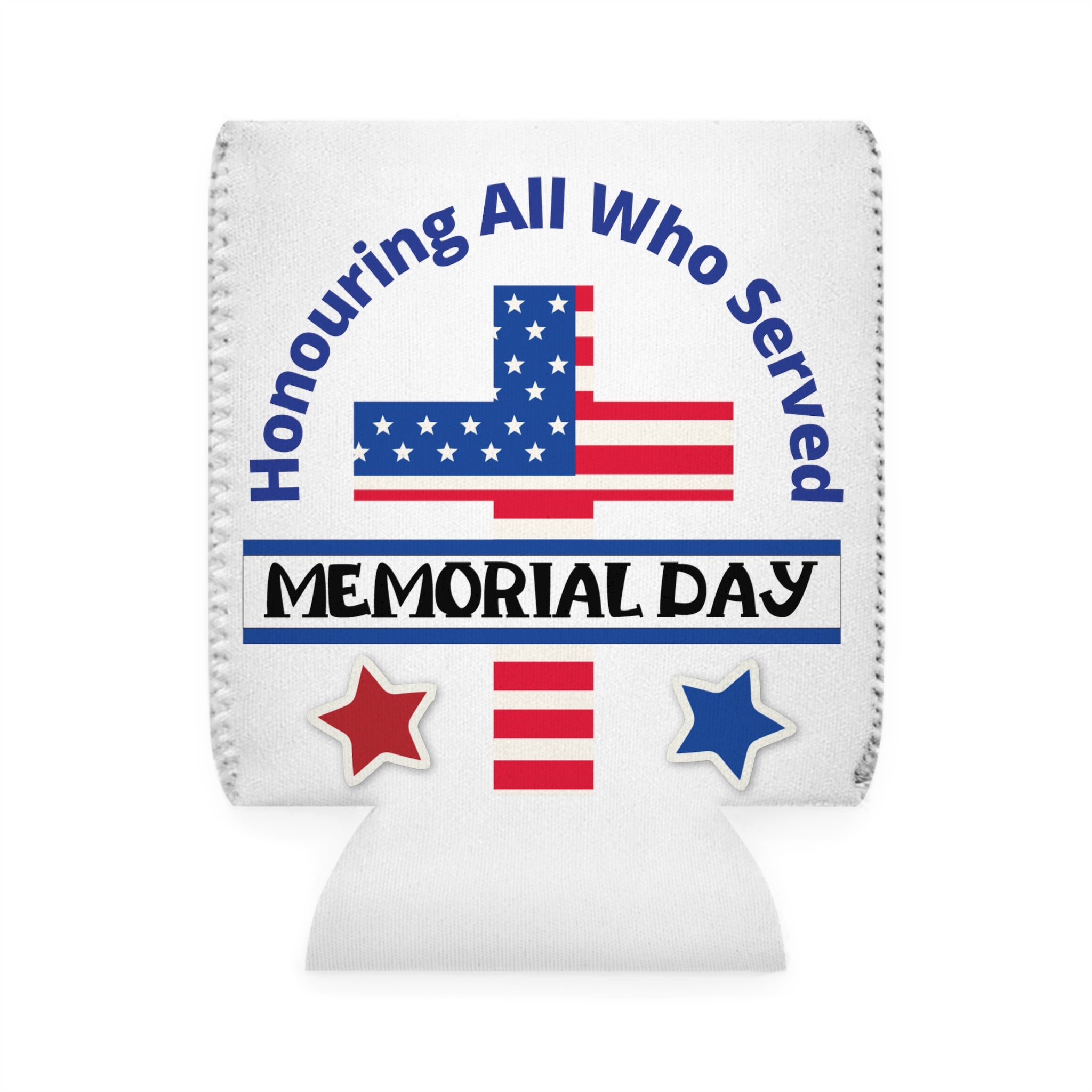 The cooler features a vibrant and sharp printed design. The primary colors are red, white, and blue, with black for text, following a patriotic theme. It showcases a central American flag–inspired cross, with blue star fields and red/white stripes, symbolizing memorial honors. Curved blue text “Honouring All Who Served” wraps around the top of the cross, and bold black text on a white/blue border “MEMORIAL DAY” sits horizontally below the cross. There are also two star shapes, a red star on the left and a blue star on the right, with white outlines and a 3D or cut – out effect. The repeating red/white stripes and star – studded blue field are vivid and precise, thanks to durable heat – transfer or sublimation printing.