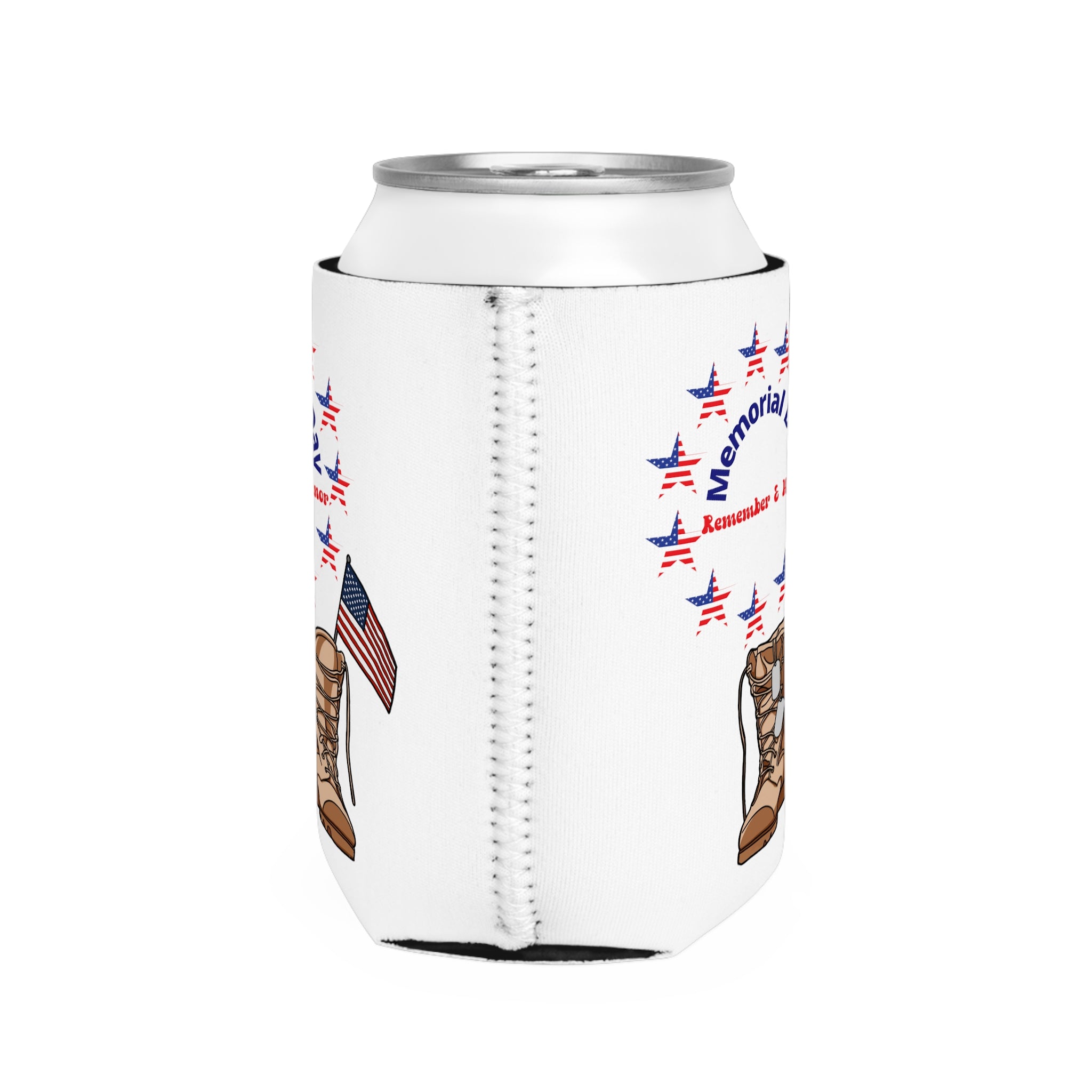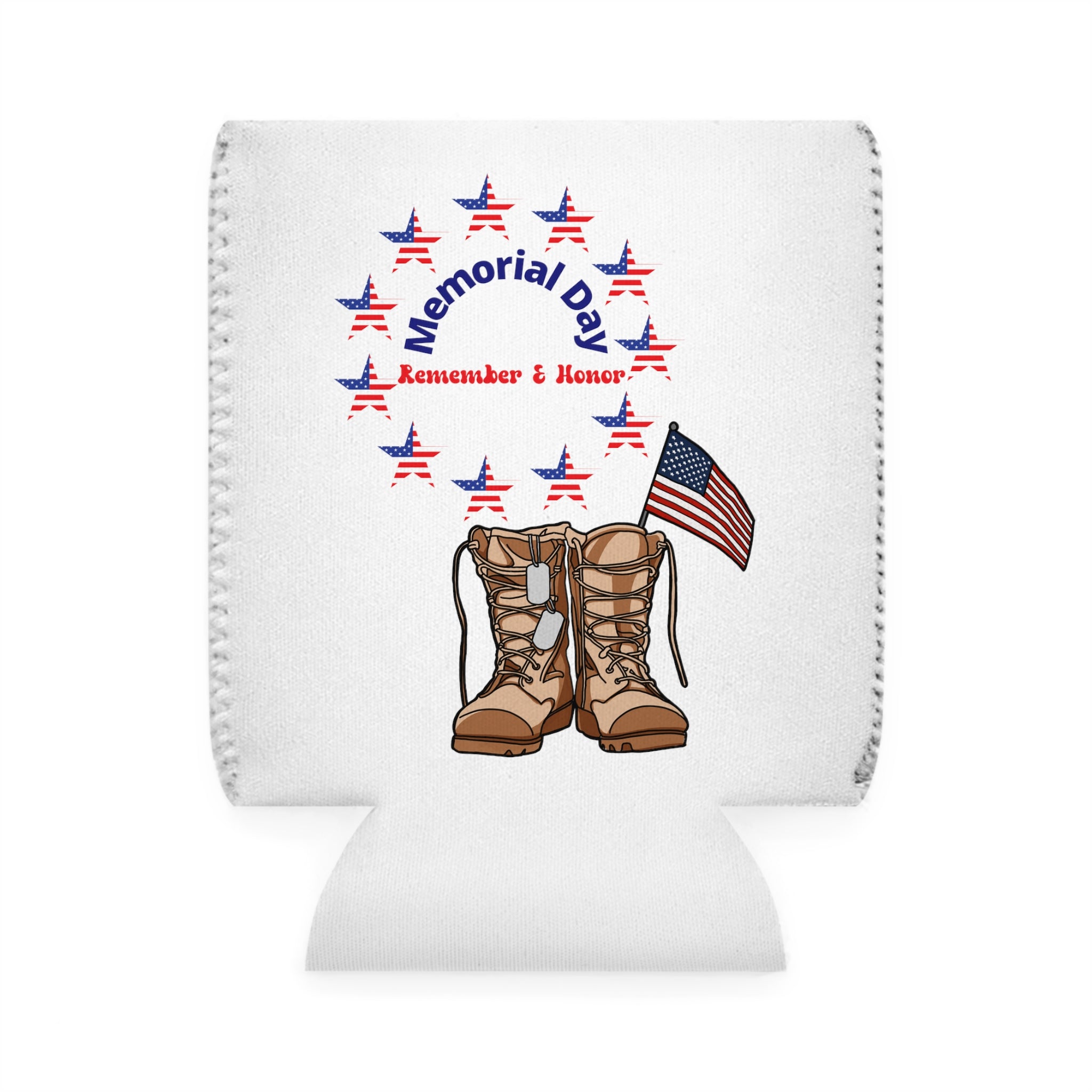 The design of this can cooler is truly a standout. Against the white base fabric, vibrant red, blue, and tan/brown accents create a visually appealing look. The circular arrangement of American flag – patterned stars forms a beautiful ring. Above the ring, you’ll find the text “Memorial Day” in blue, curved gracefully, and below it, “Remember & Honor” in red. Alongside, there are tan military combat boots with dog tags and a small American flag attached to the boots on the right, symbolizing the sacrifice of fallen service members.