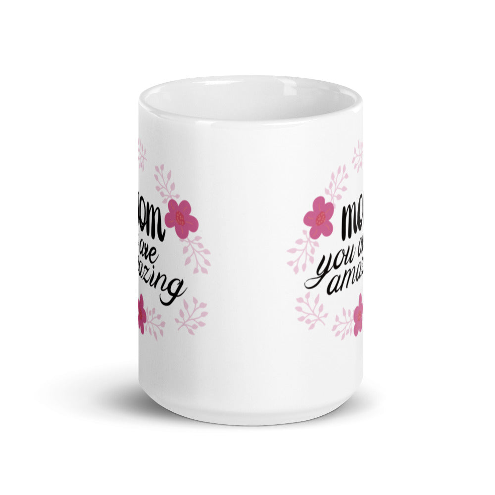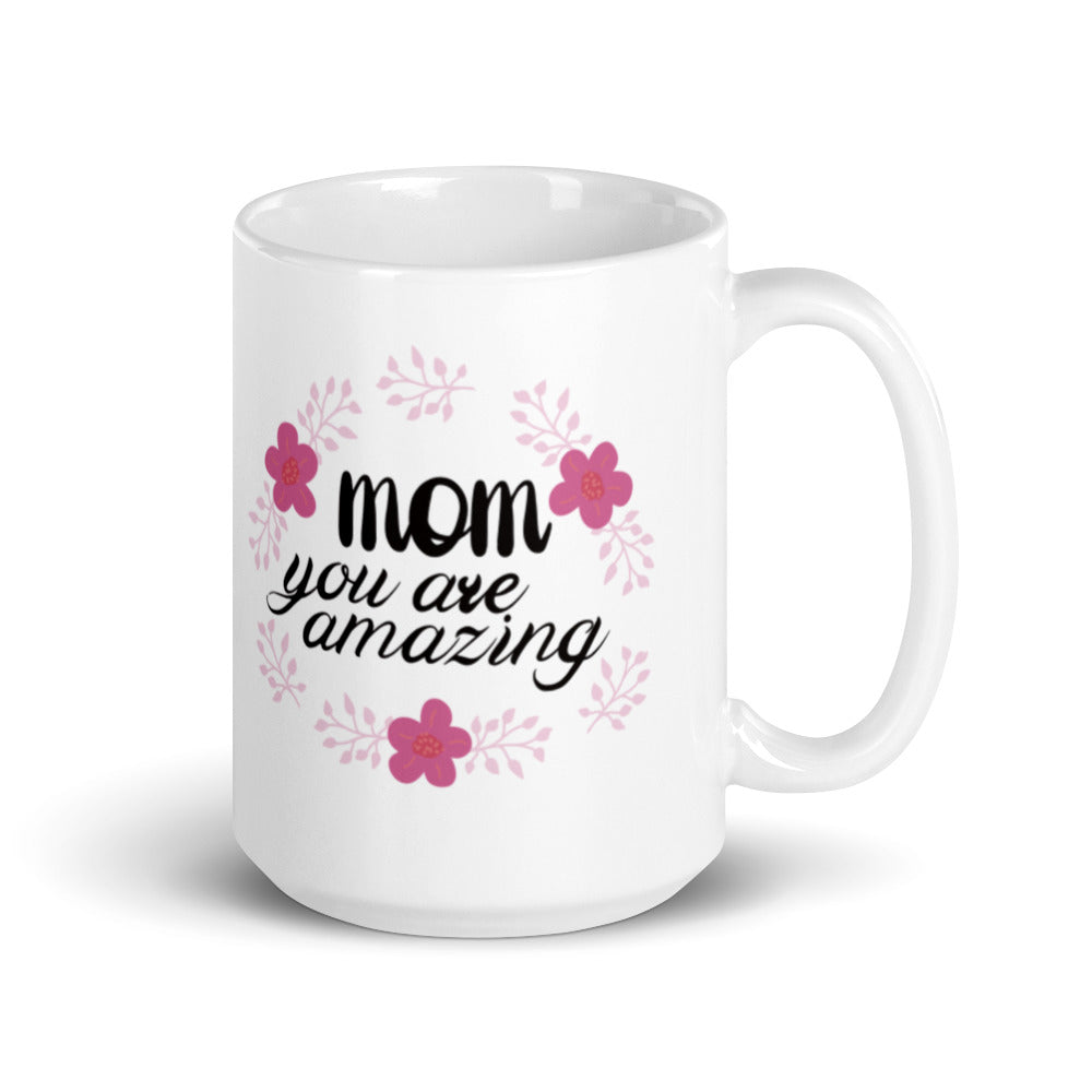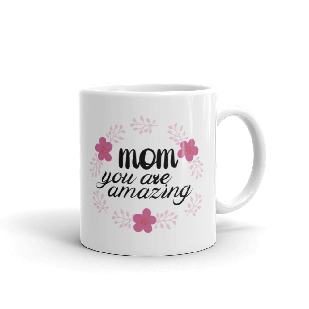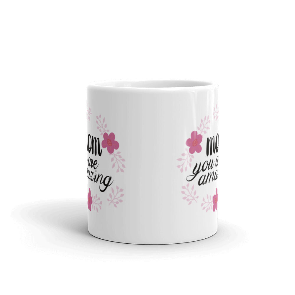 - Design: Bold black text “mom you are amazing” with vibrant pink flowers and light pink leafy branches in a wreath – like pattern