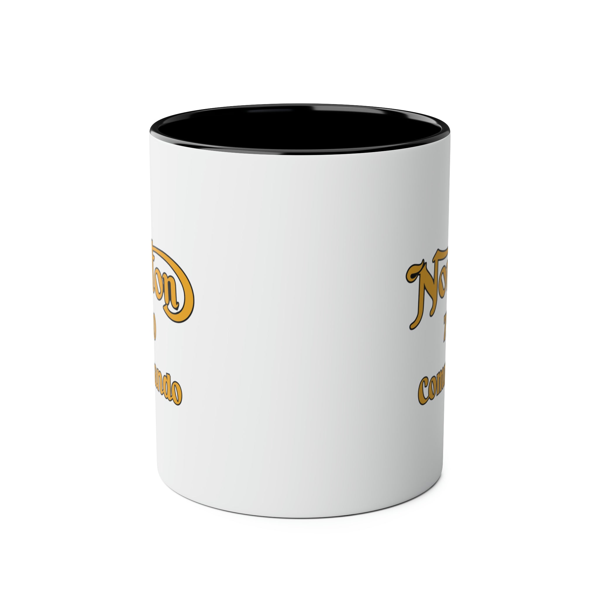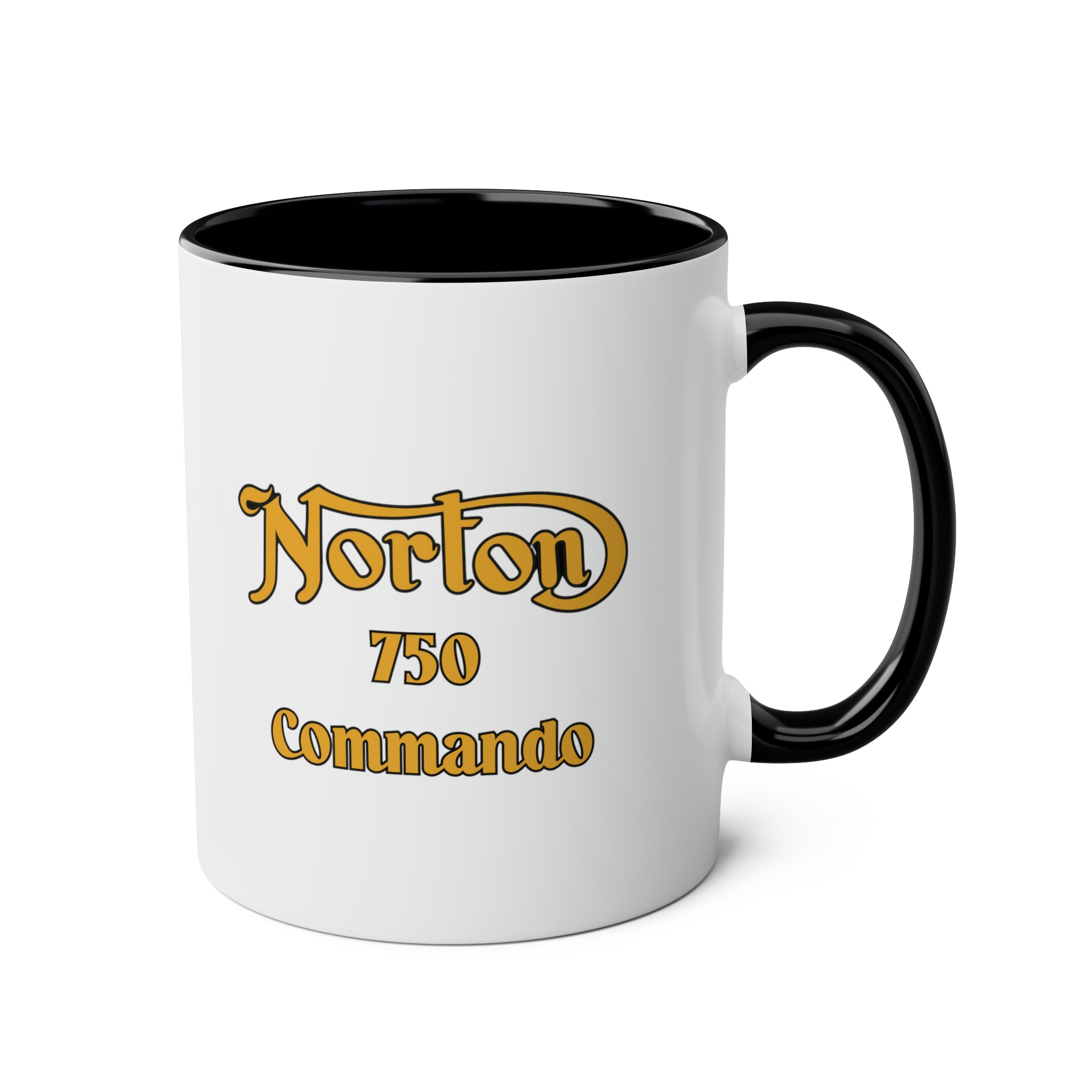 The color scheme of the mug is a harmonious combination of white, black, and golden – yellow. The primary exterior color is white, while the handle and inner rim are black. The branding text, printed in golden – yellow with a black outline, features a stylized, retro – inspired script for “Norton”, a bold blocky font for “750”, and a bold script for “Commando”. This text is centered on the front and repeats partially on the sides, creating a full circumferential design that ensures the branding is visible from all angles.