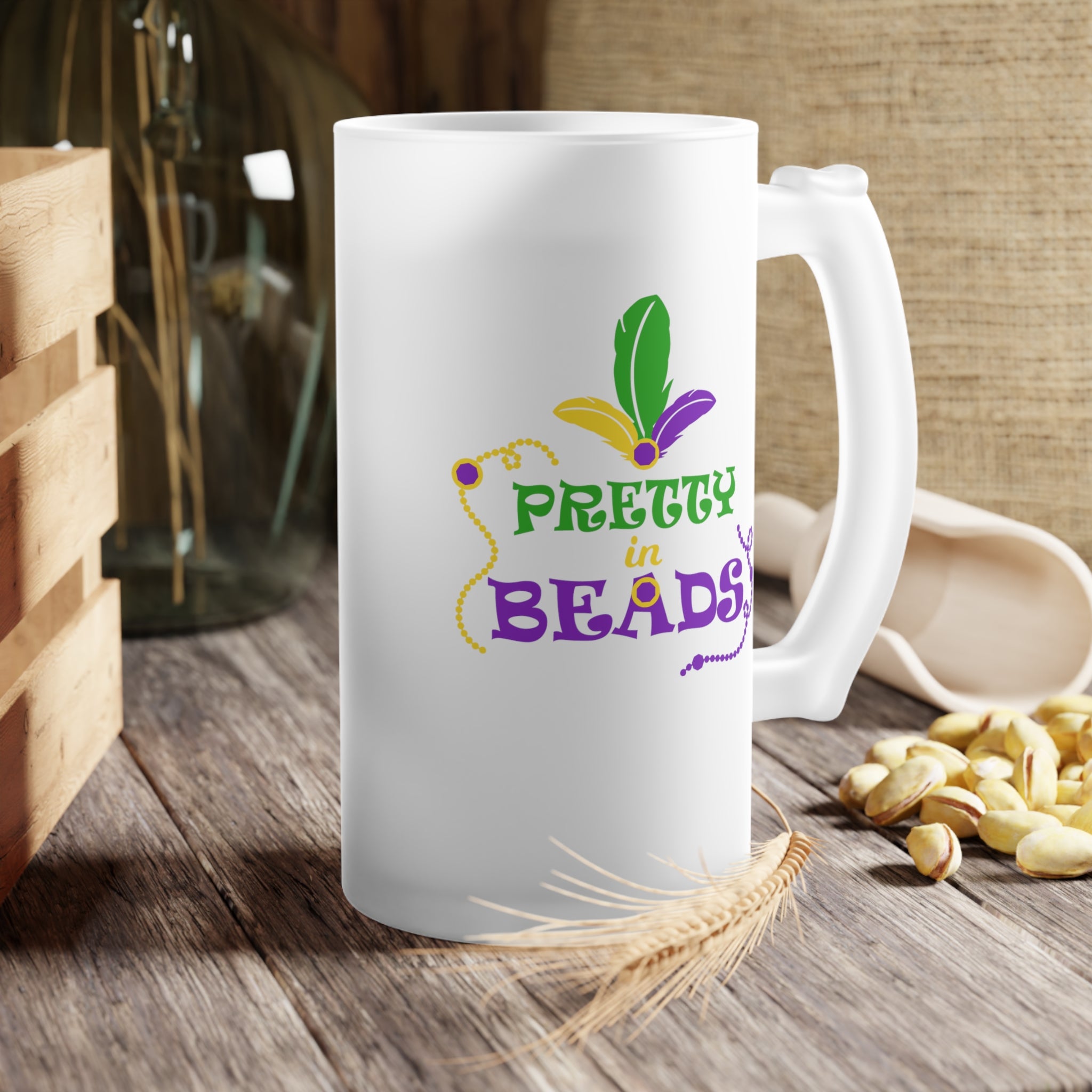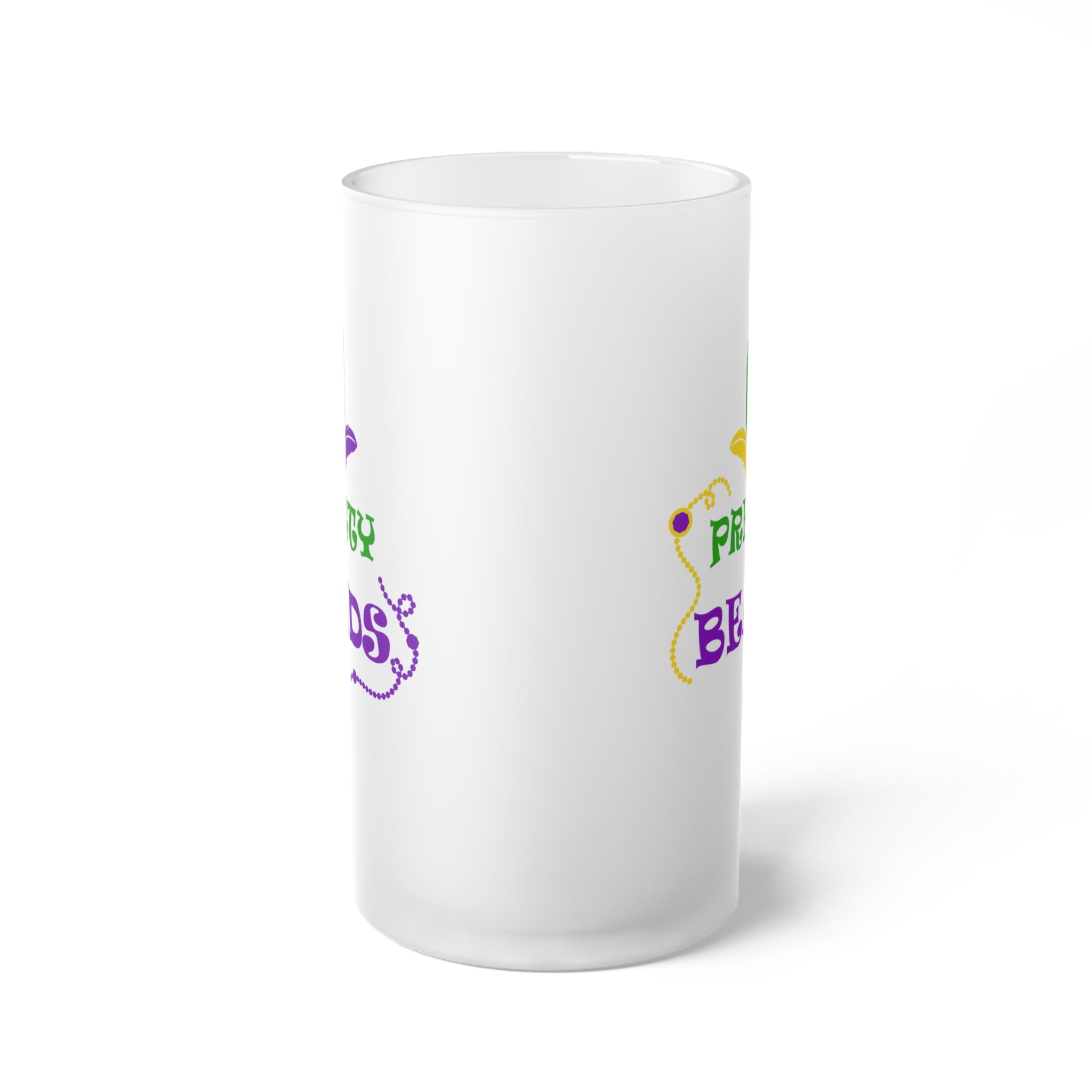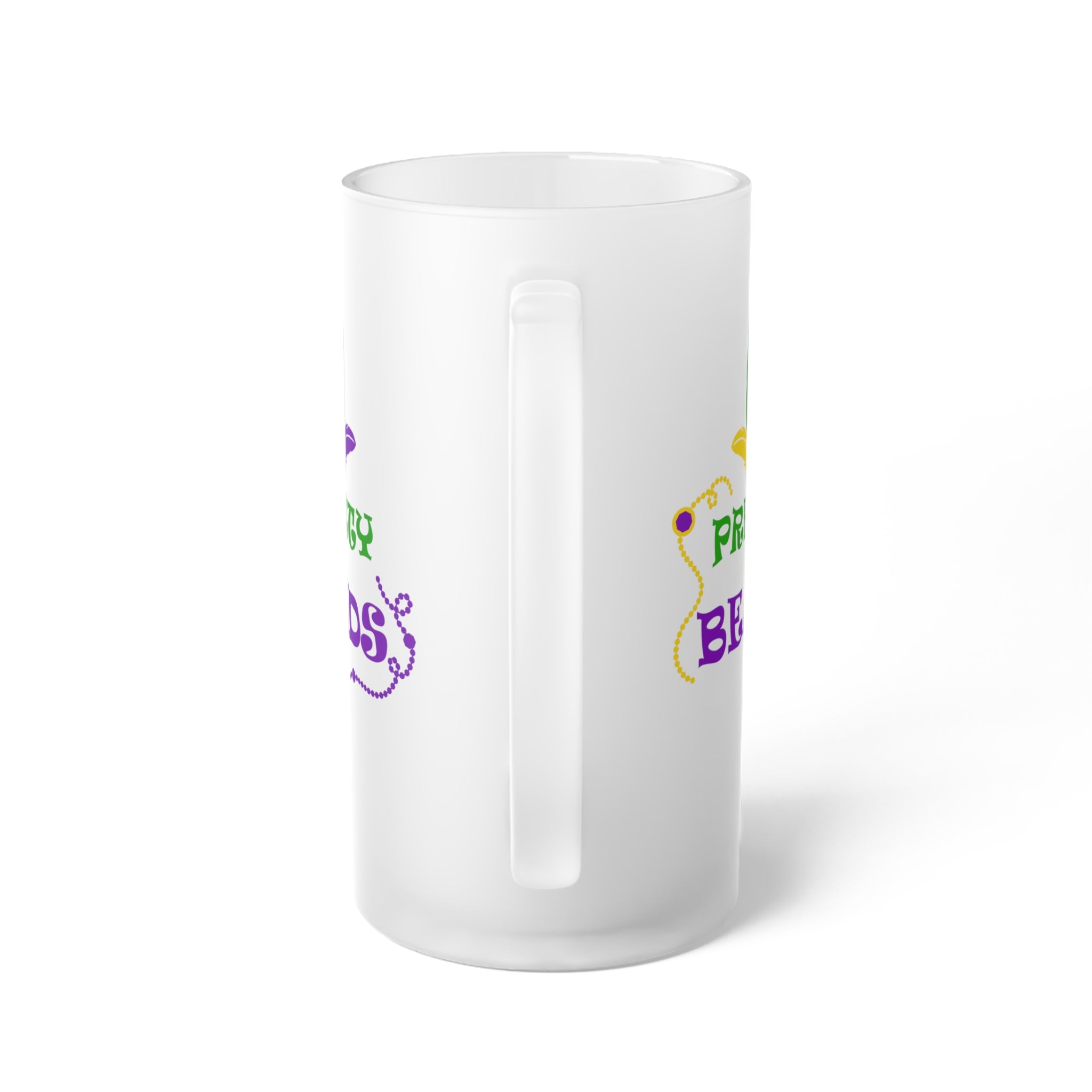 Introducing the Pretty In Beads Frosted Glass Beer Mug, a stunning addition to your drinkware collection! This tall, frosted tumbler or beer stein – style mug is perfect for Mardi Gras celebrations or any festive gathering.