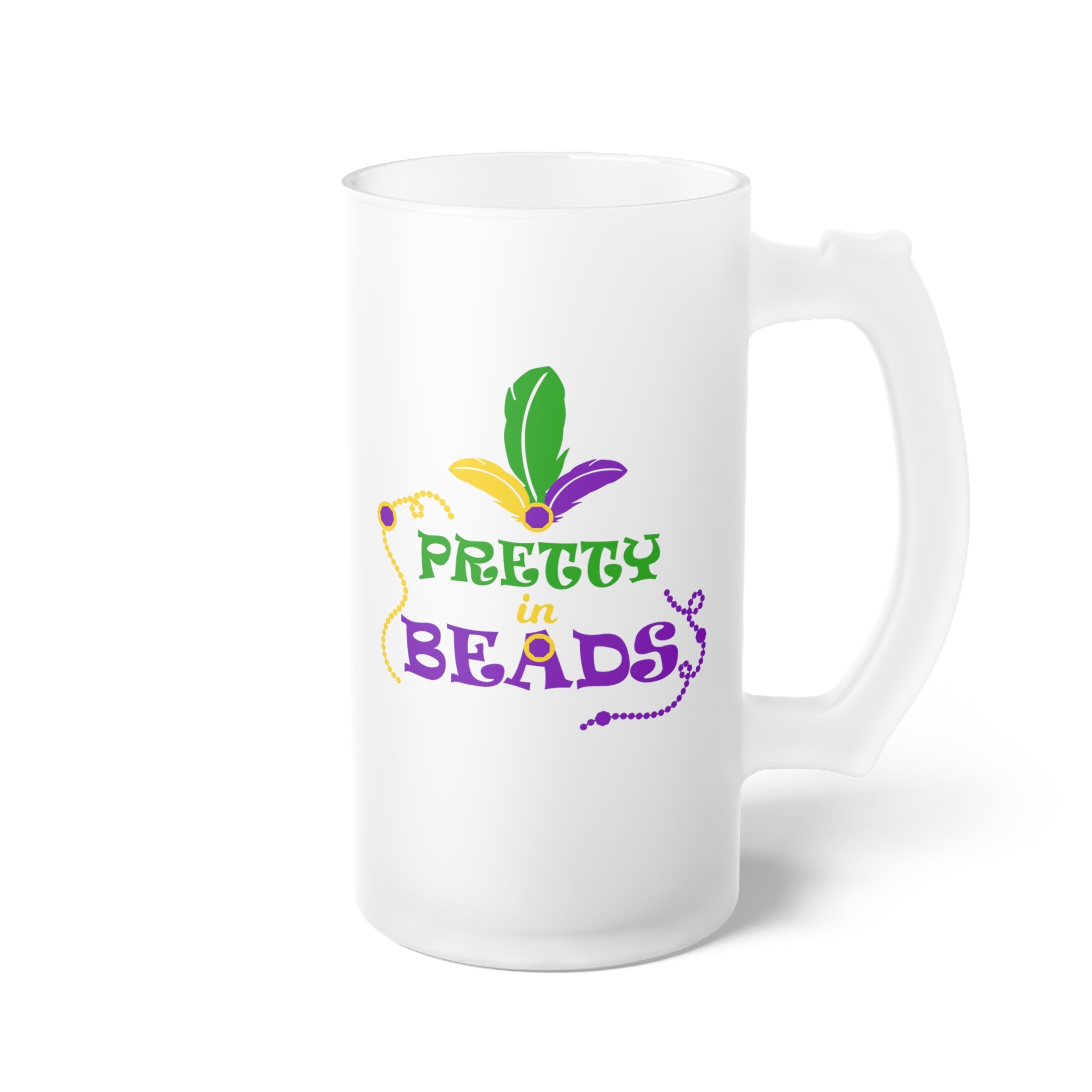 Made of either frosted glass or ceramic with a frosted finish, it offers durability and a stylish, non – transparent appearance. The base color is a beautiful white with a frosted, matte finish. The mug features a vibrant, festive design with Mardi Gras colors (green, purple, yellow). The text “PRETTY in BEADS” is printed with “PRETTY” in green, “in” in yellow (smaller font), and “BEADS” in purple. There are also three stylized feathers (green, yellow, purple) above the text and decorative beaded chains (yellow and purple) framing it, creating a bold and playful aesthetic.