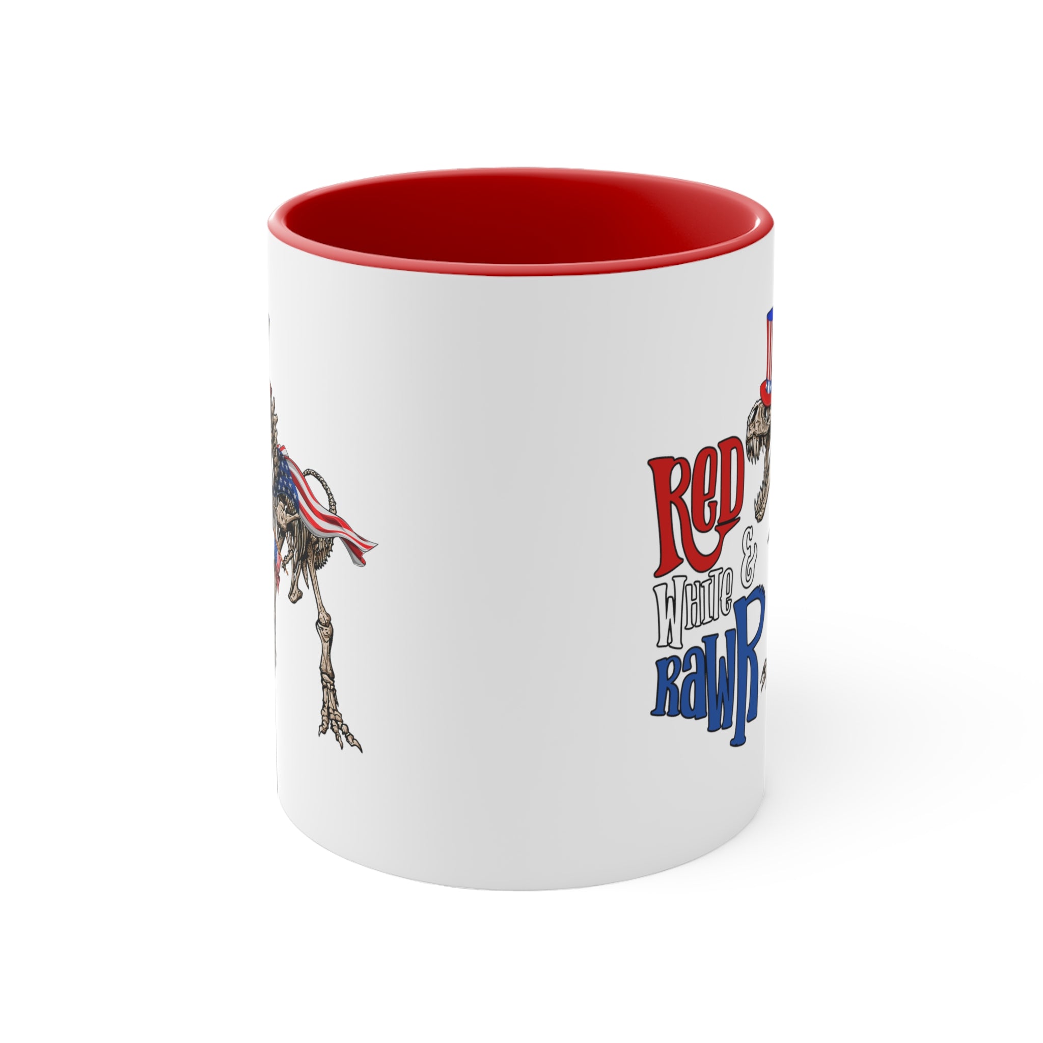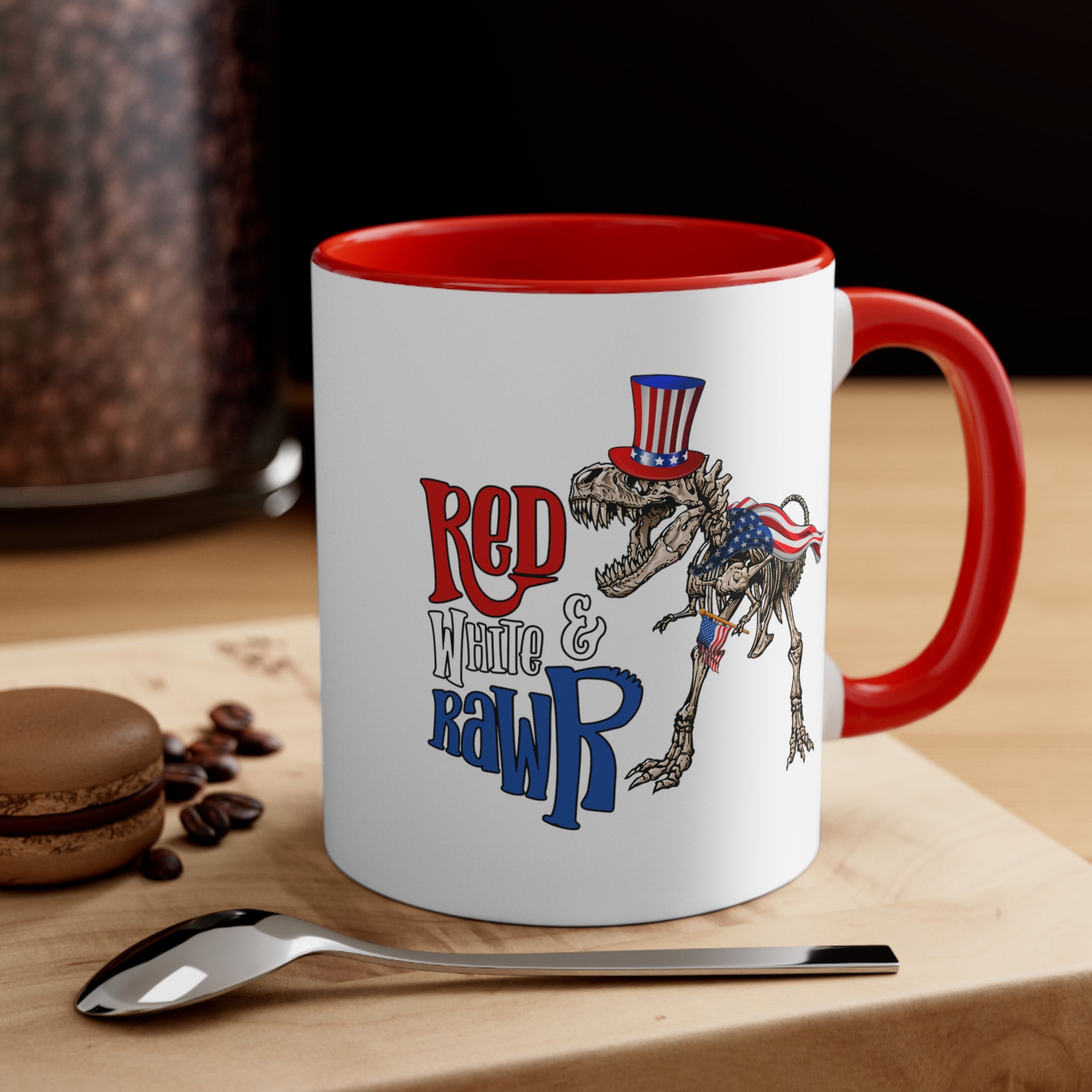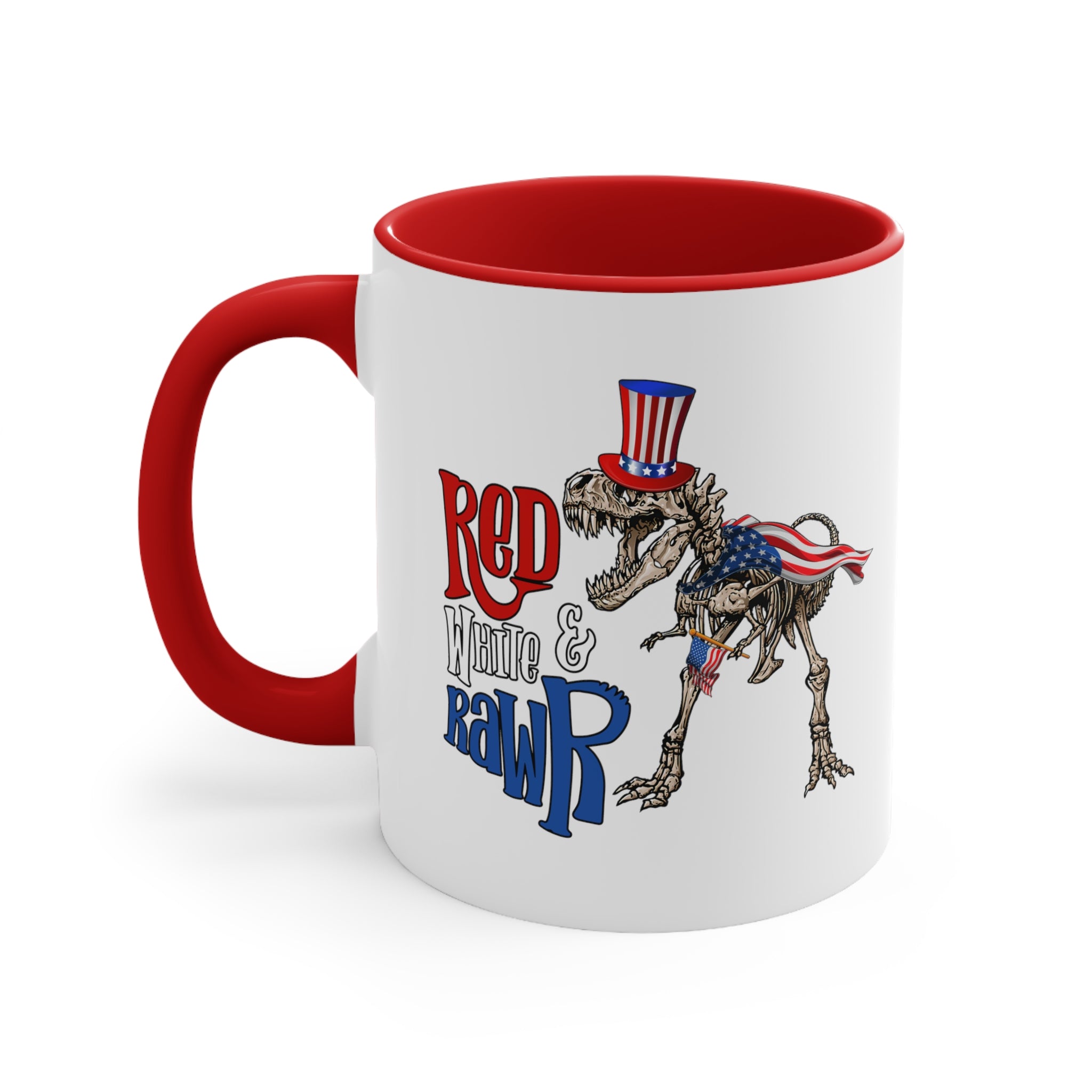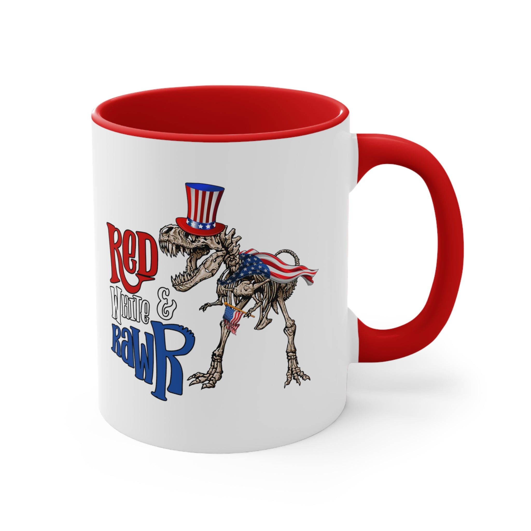 Introducing the Red White & Rawr Accent Coffee Mug, a unique and patriotic addition to your daily beverage routine! This 11oz ceramic mug is a perfect blend of functionality and fun, designed to bring a smile to your face every time you take a sip.