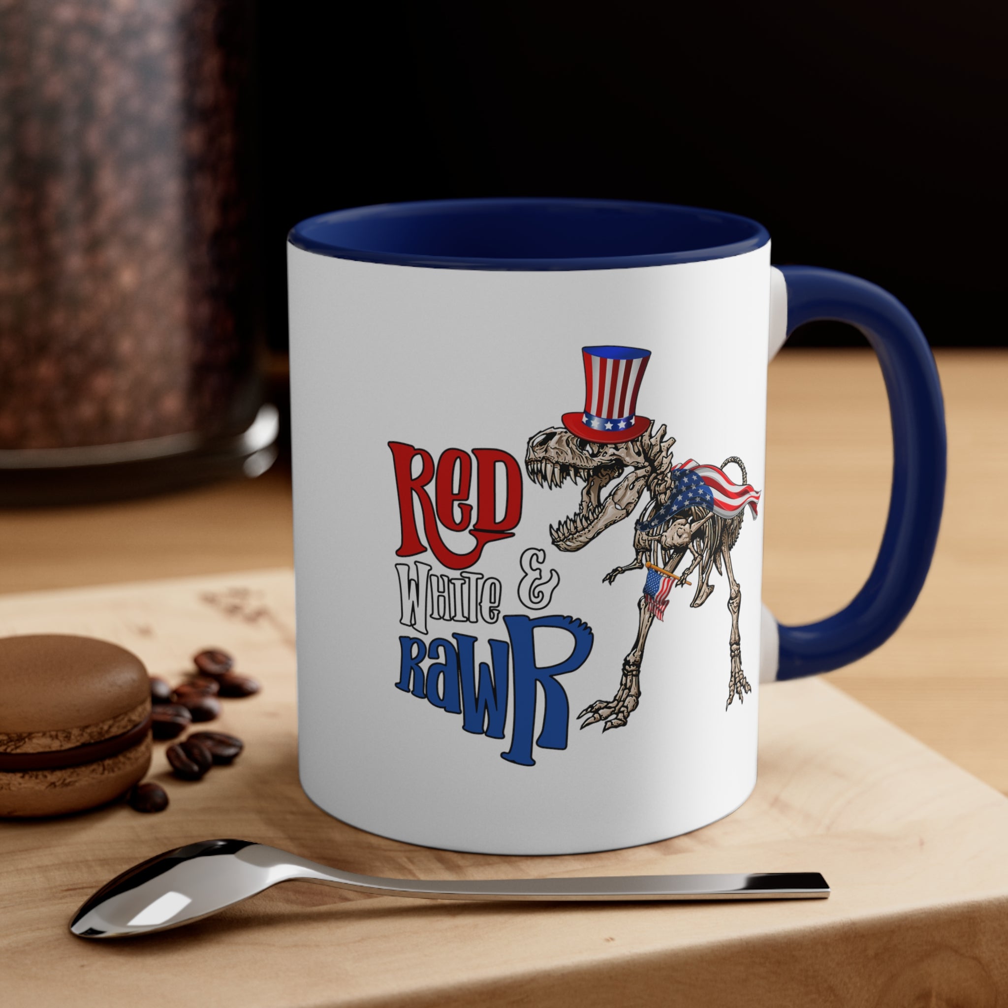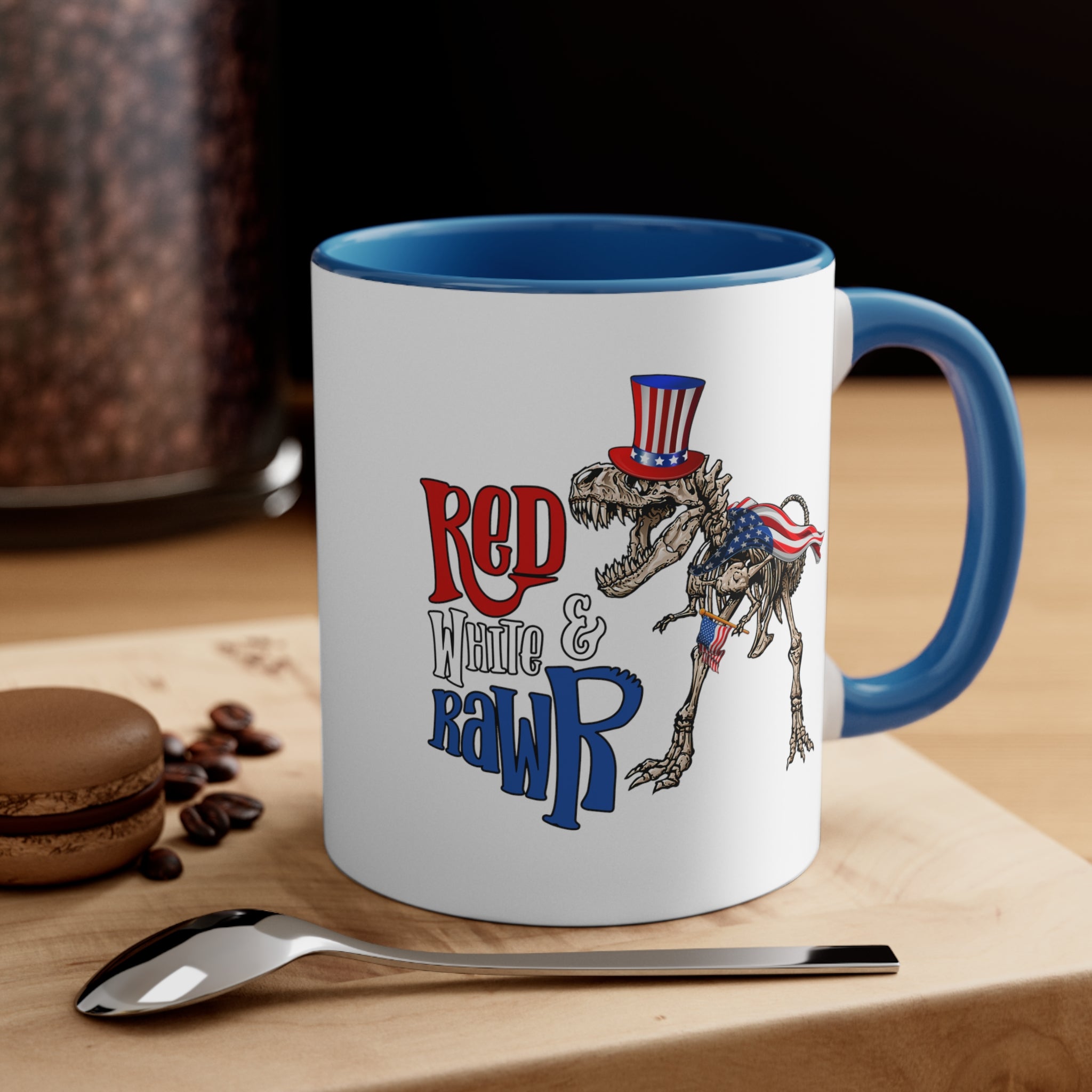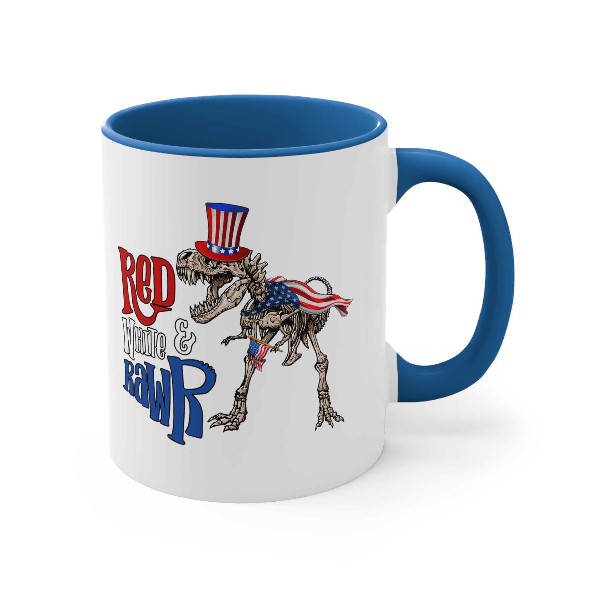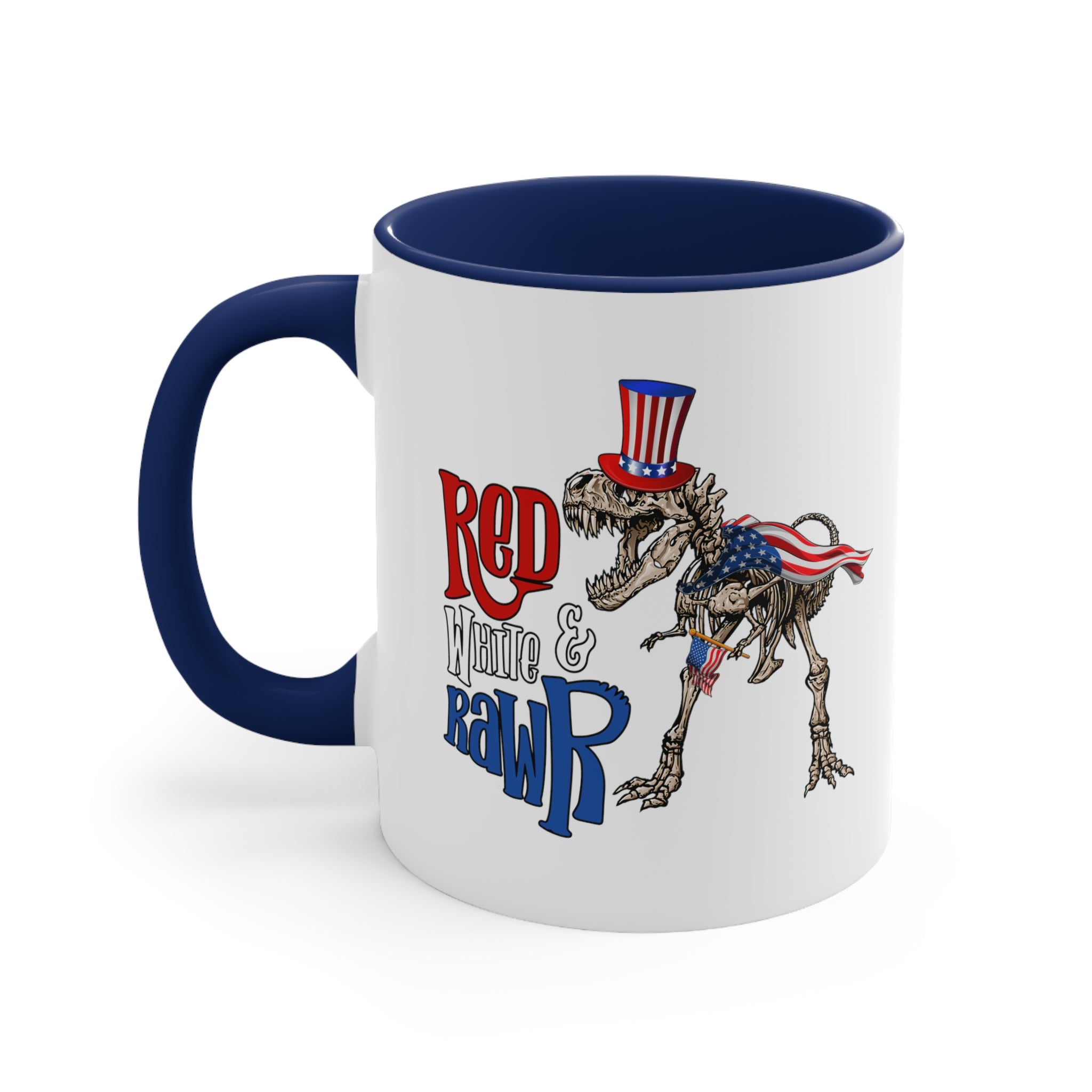 Introducing the Red White & Rawr Accent Coffee Mug, a unique and patriotic addition to your daily beverage routine! This 11oz ceramic mug is a perfect blend of functionality and fun, designed to bring a smile to your face every time you take a sip.
