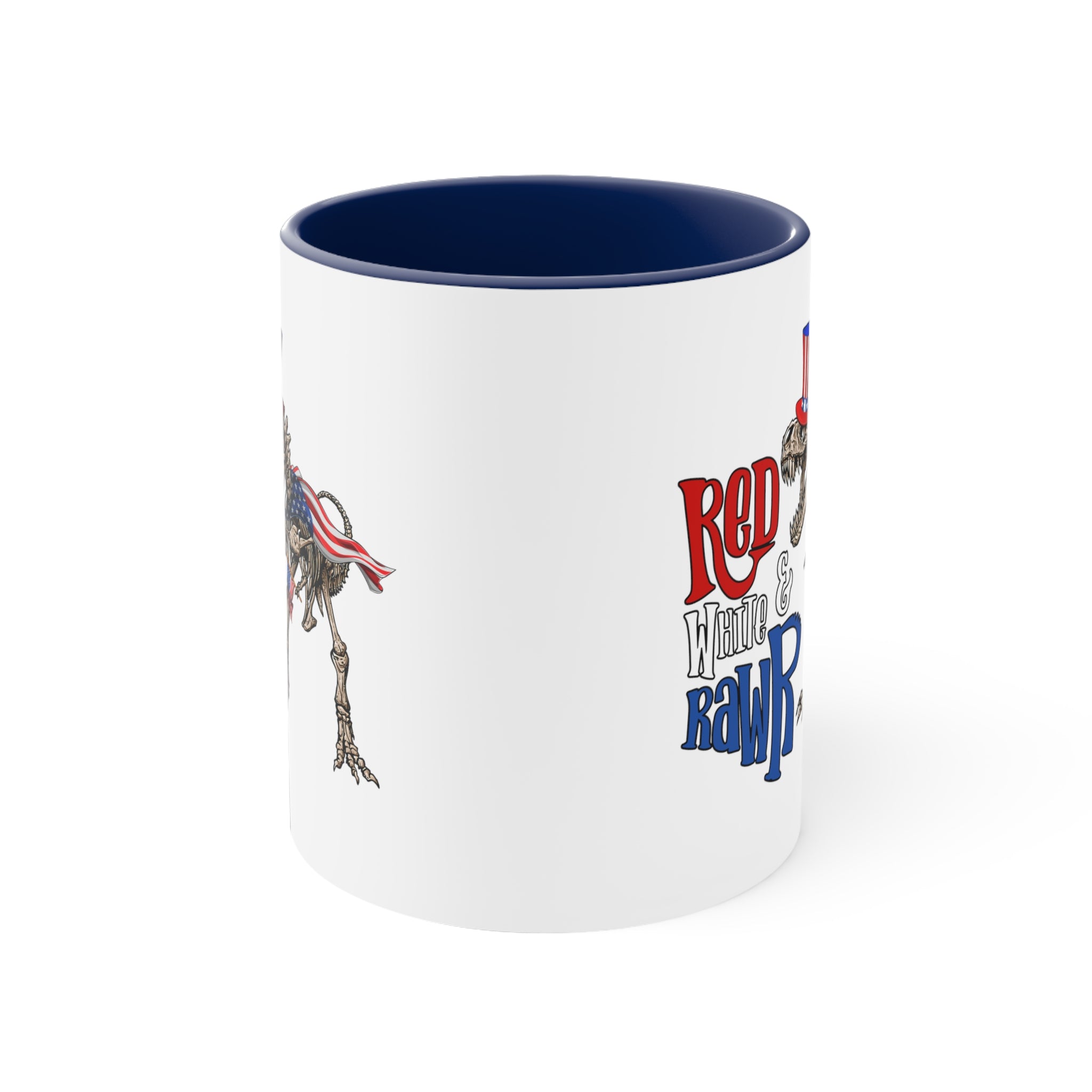 The graphic on the mug is truly a showstopper. A detailed skeletal T – Rex dinosaur, with realistic bone textures, is dressed in an Uncle Sam – style top hat featuring red, white, and blue stripes with stars, just like the American flag. A cape made of the American flag is draped over its back, and it holds a small American flag in its claw, reinforcing the patriotic theme. The phrase “Red White & Rawr” is printed on the mug, with “Red” in bold red stylized script, “White” in white serif – style font, and “Rawr” in bold blue dinosaur – themed script with a playful “r” mimicking a roar.
