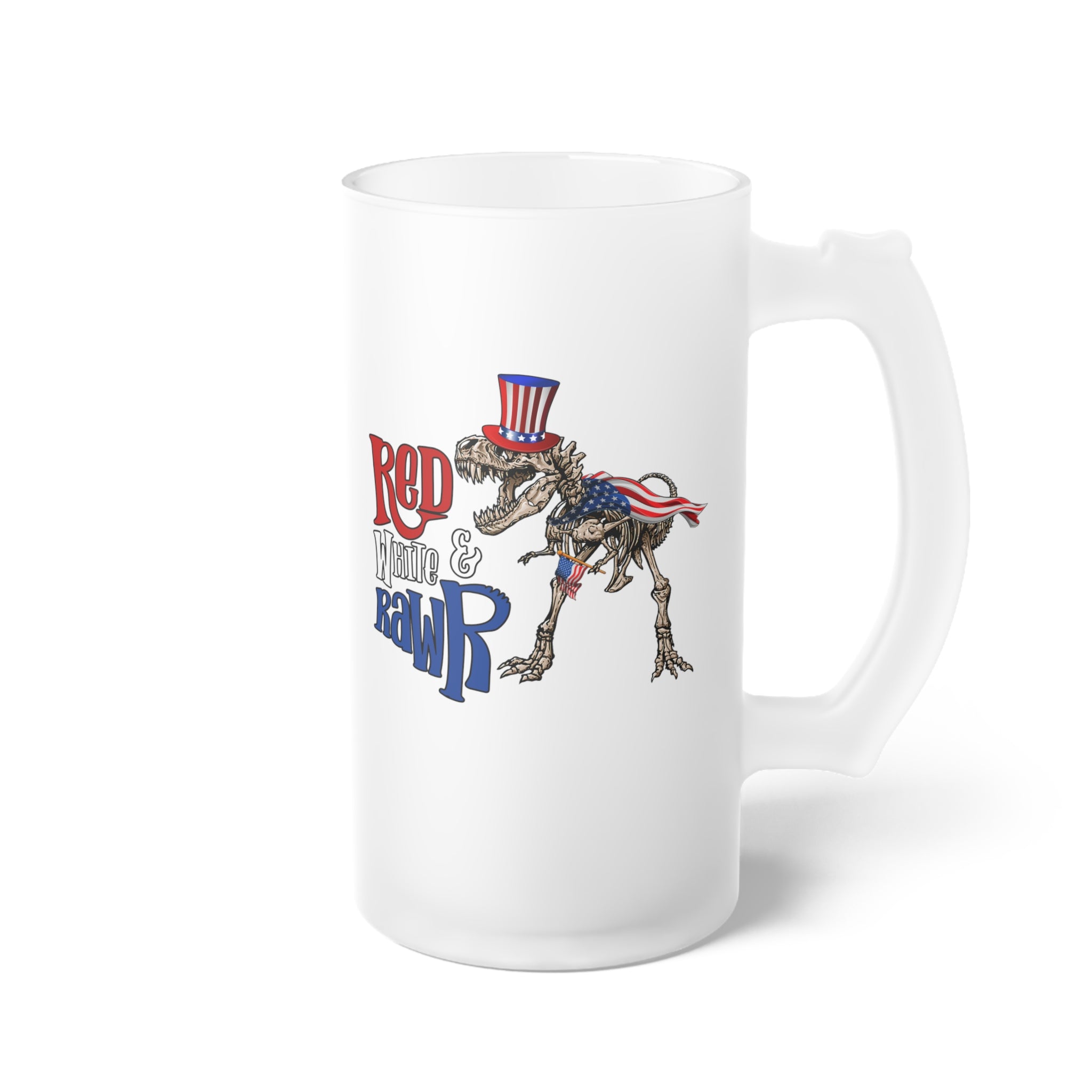 The design of the mug is truly eye – catching. It features a detailed cartoon – style T – Rex skeleton in brownish bone tones, with a dynamic pose of an open mouth and extended claws. The T – Rex is adorned with patriotic details, including a red, white, and blue Uncle Sam – style top hat with stars and stripes, and an American flag draped over its back and a smaller one on its chest. The text “Red, White & Rawr” is printed on the mug, with “Red” in bold red script, “White” in white block letters, a small neutral – font “&”, and “Rawr” in bold blue script with a dinosaur footprint motif on the “R”. This playful text merges with the dinosaur’s roar theme, adding a fun touch to the overall design.