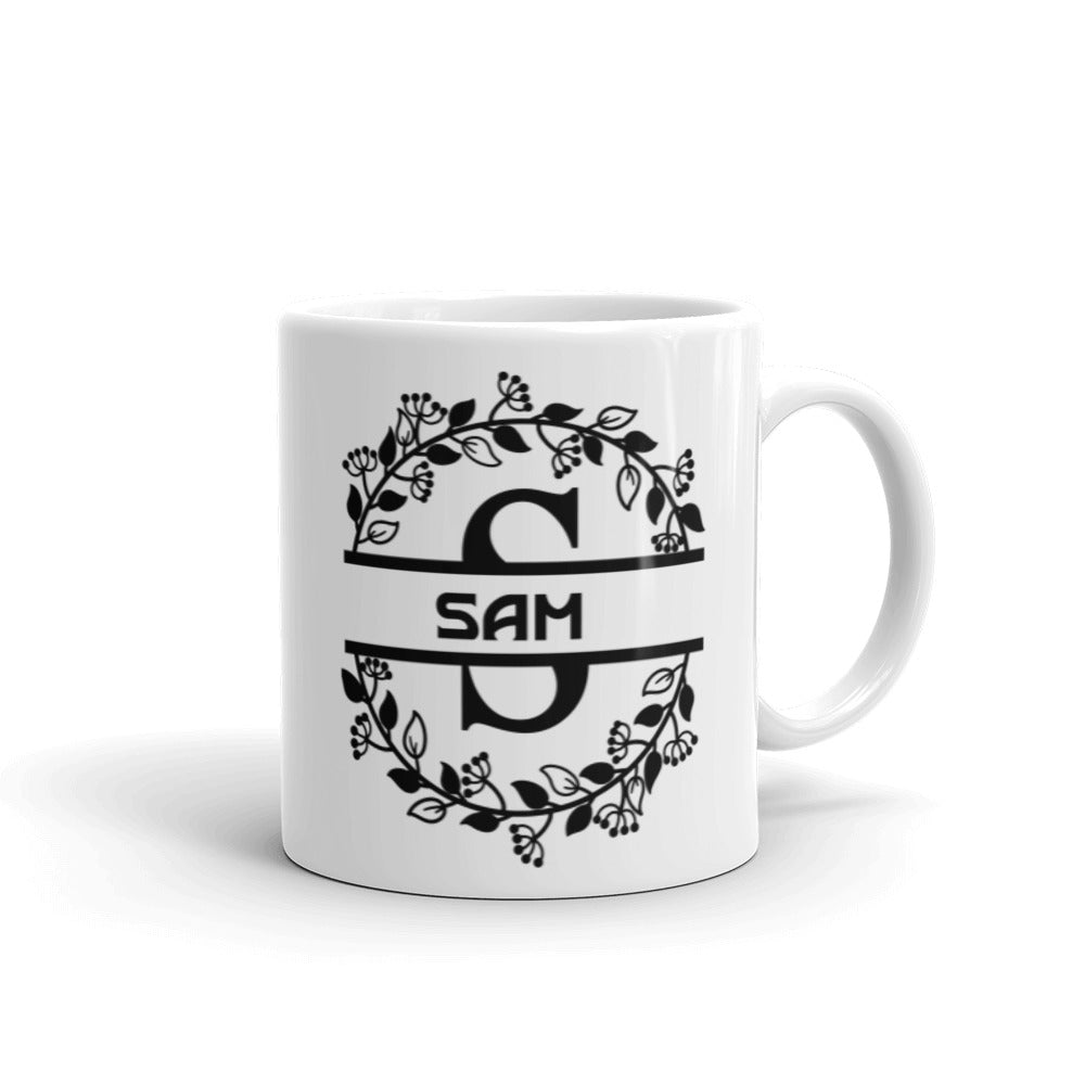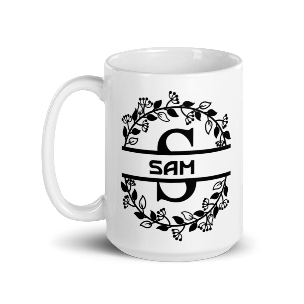 - Design: A monogram – style layout with black printed elements including a floral/vine wreath, horizontal lines, text, and angular monogram letters